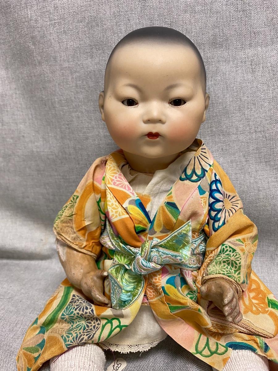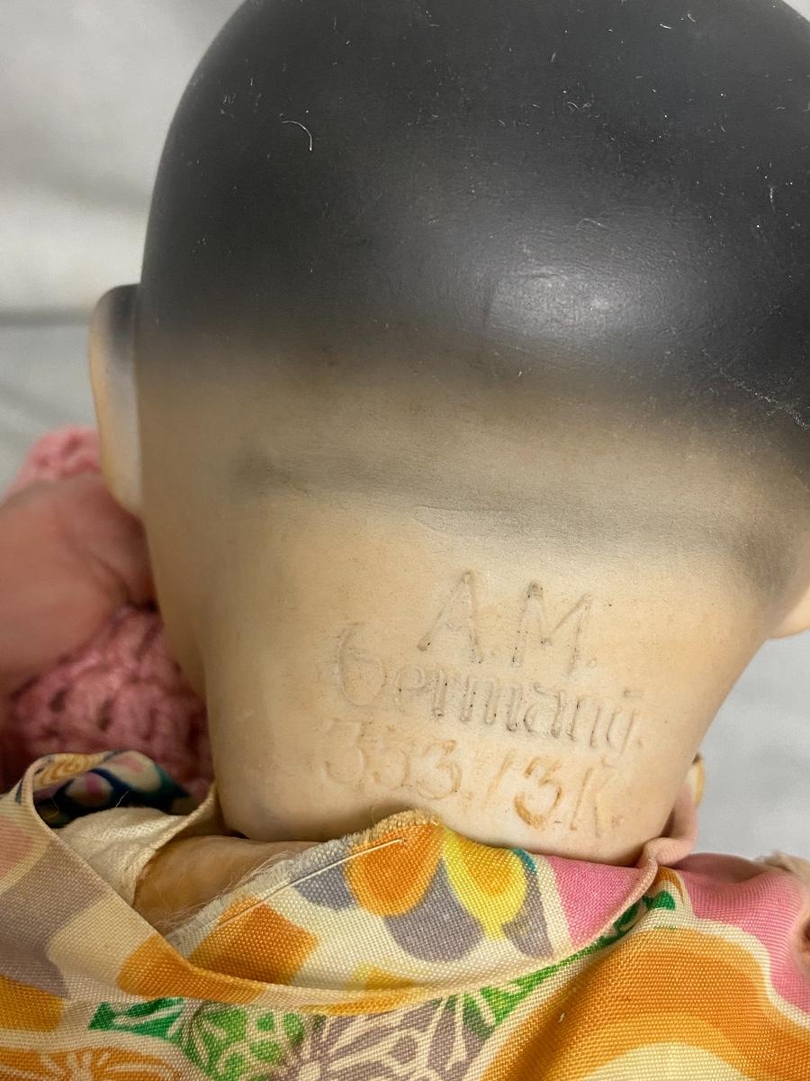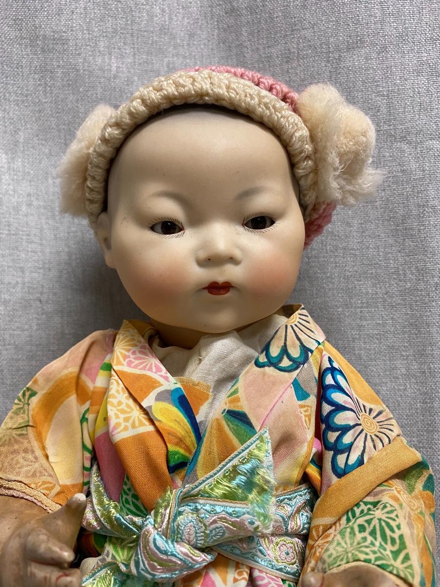 Vintage Asian Ethnic Bisque & Composite AM Germany 353/3. Armand Marseille doll has glass sleep eyes, painted hair. Looks like it might be original outfit with extras like the hat and socks. Composite has some wear. About 14" size.
