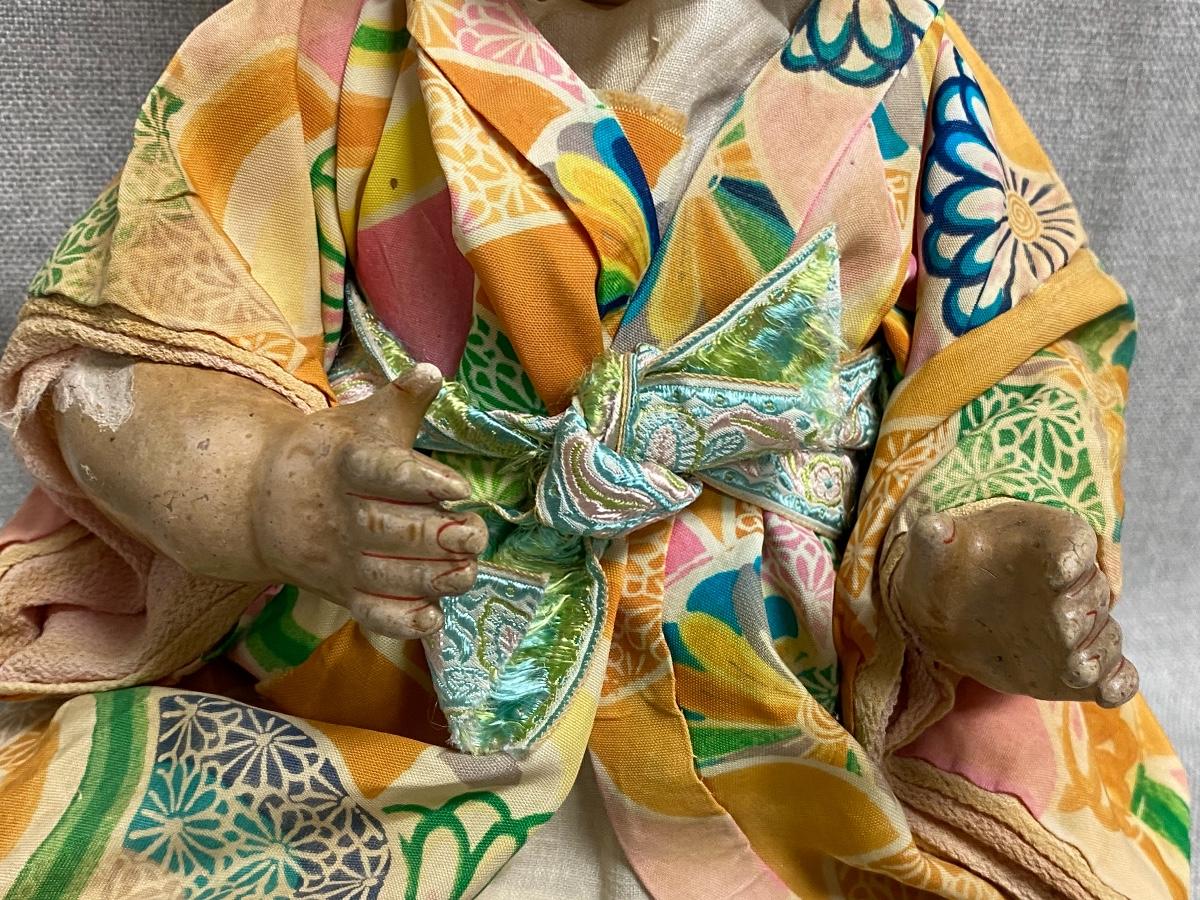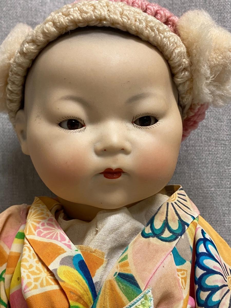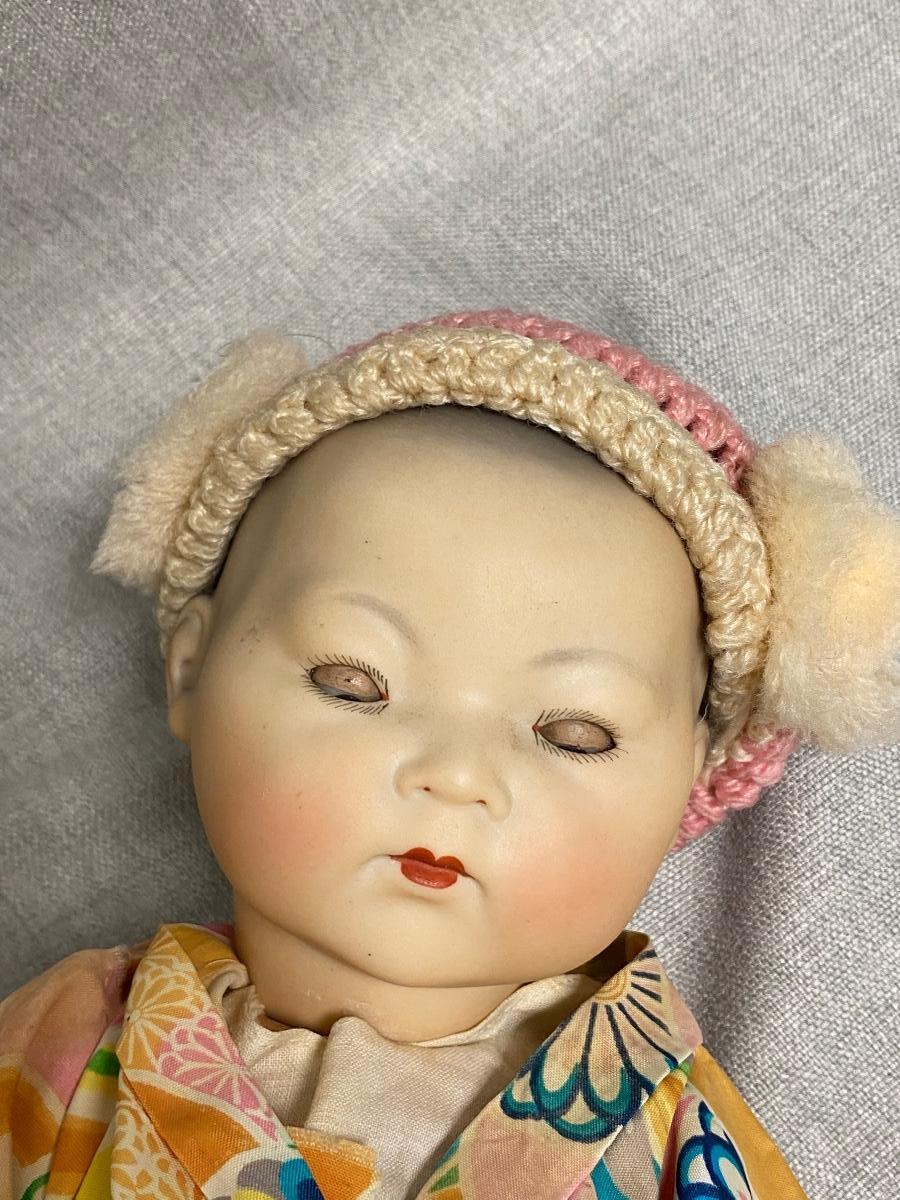 Vintage Asian Ethnic Bisque & Composite AM Germany 353/3. Armand Marseille doll has glass sleep eyes, painted hair. Looks like it might be original outfit with extras like the hat and socks. Composite has some wear. About 14" size.