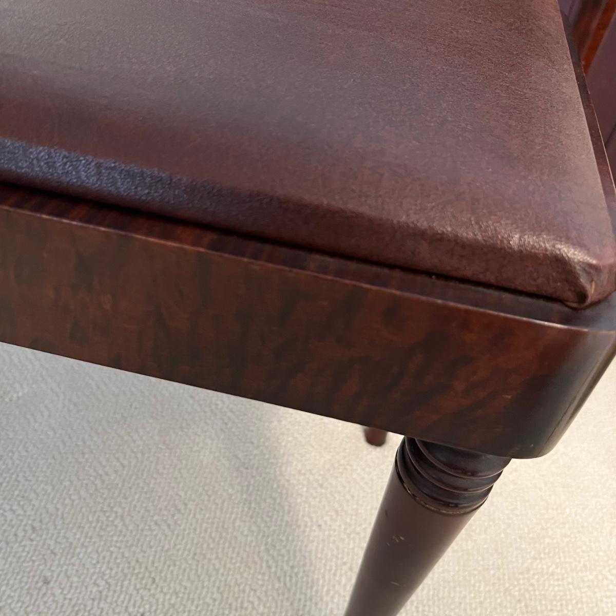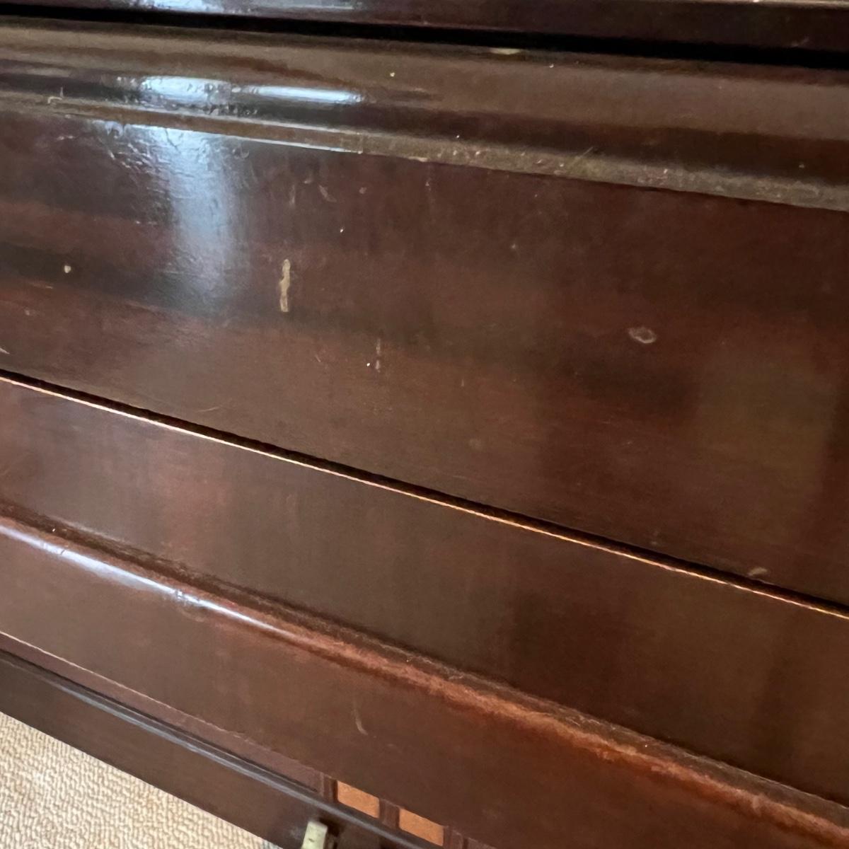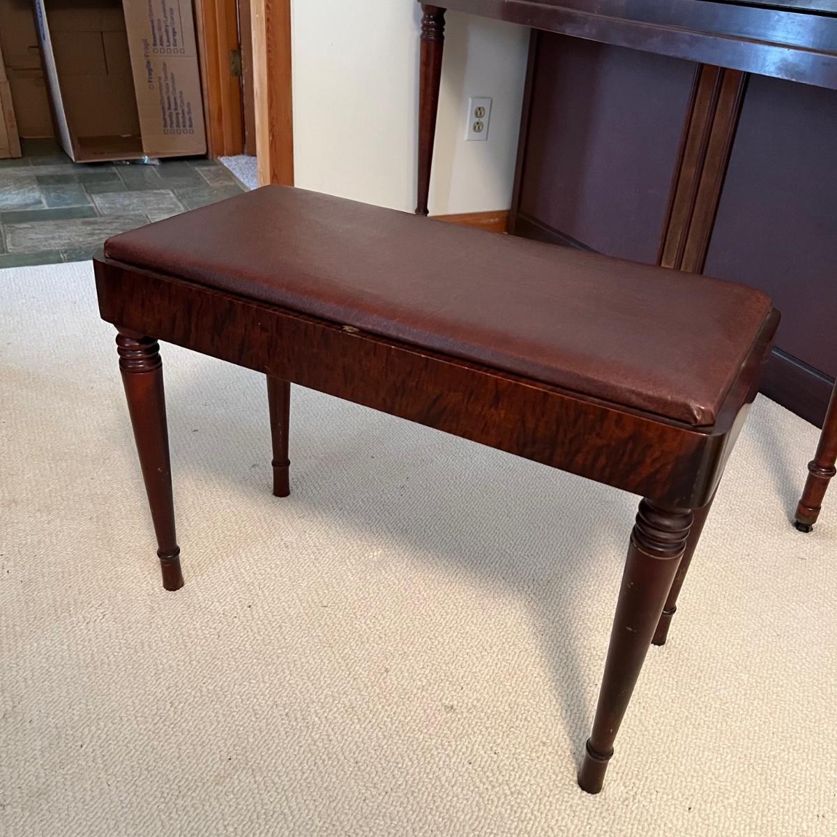This elegant Wurlitzer console piano comes with matching stool and some music books and sheet music. Piano appears to be tuned and is in good, well cared for condition with just a few minor scratches shown in images. The wood is a dark cherry color and the top of the piano and seat of the stool are covered in a dark reddish/brown leather like fabric. Piano has castor wheels on the front two legs.