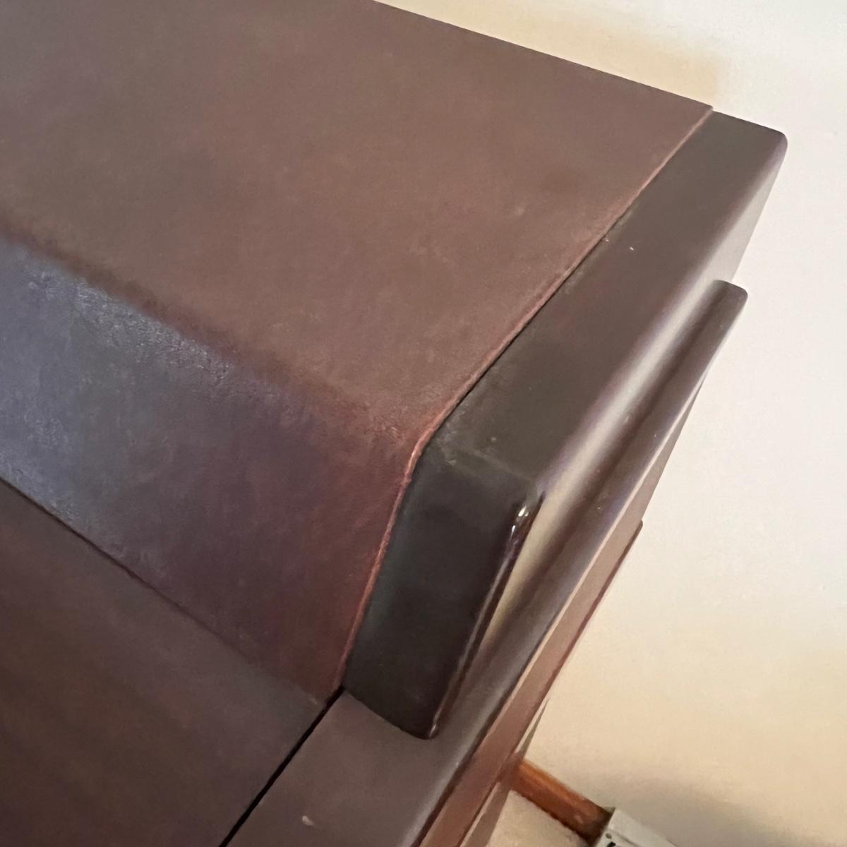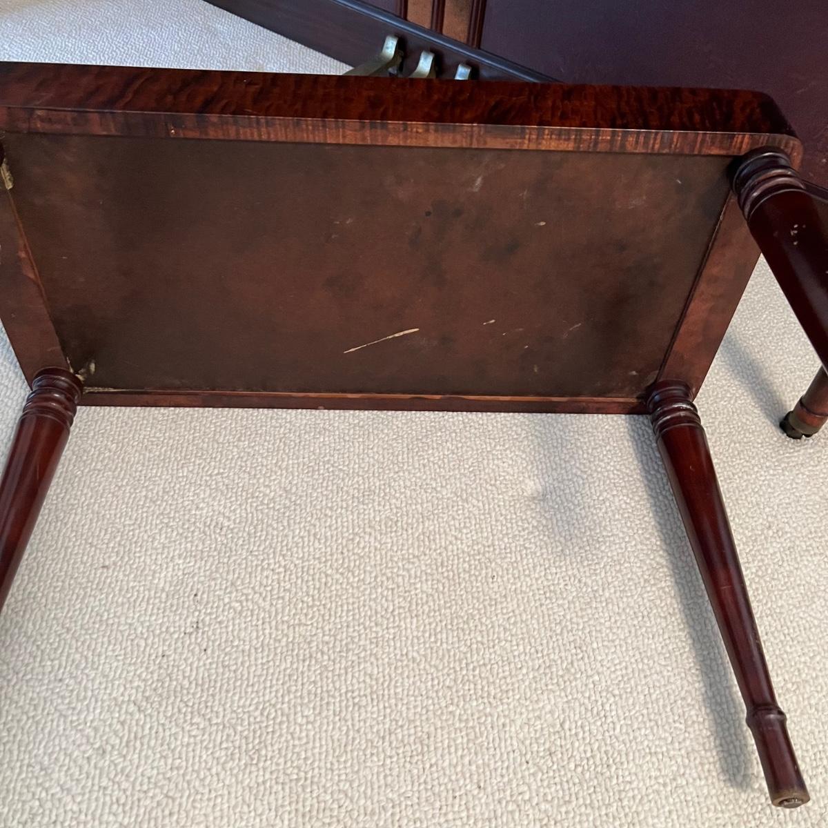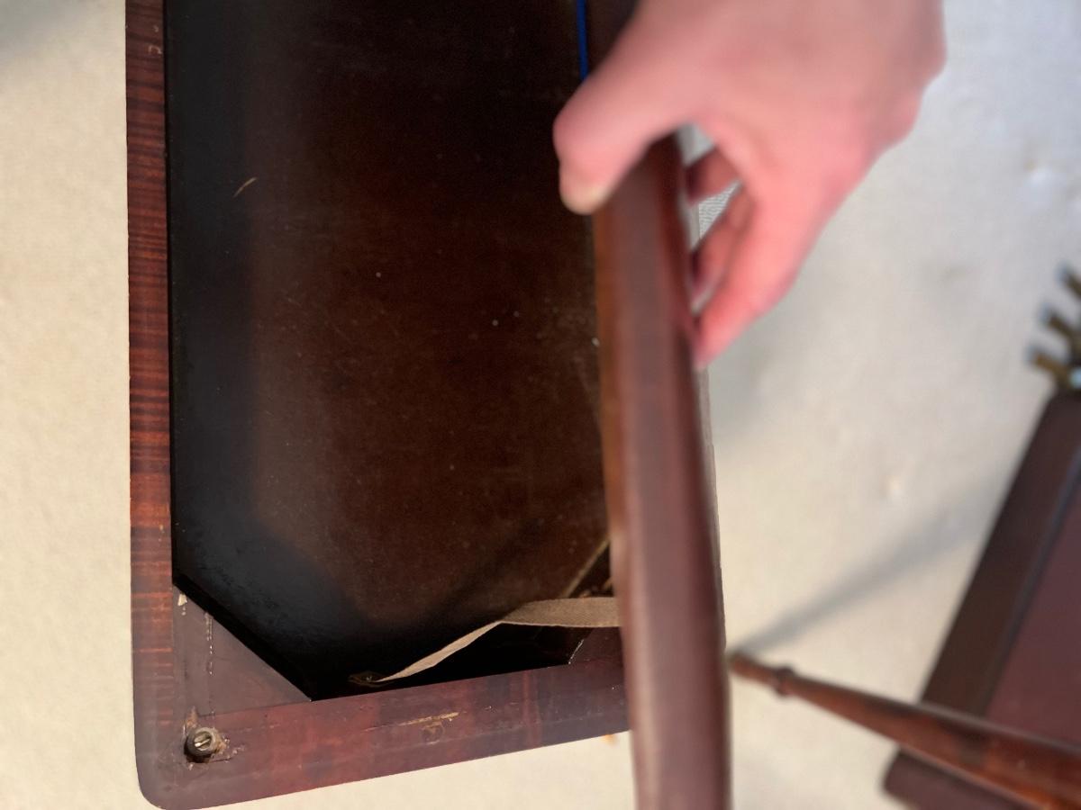 This elegant Wurlitzer console piano comes with matching stool and some music books and sheet music. Piano appears to be tuned and is in good, well cared for condition with just a few minor scratches shown in images. The wood is a dark cherry color and the top of the piano and seat of the stool are covered in a dark reddish/brown leather like fabric. Piano has castor wheels on the front two legs.