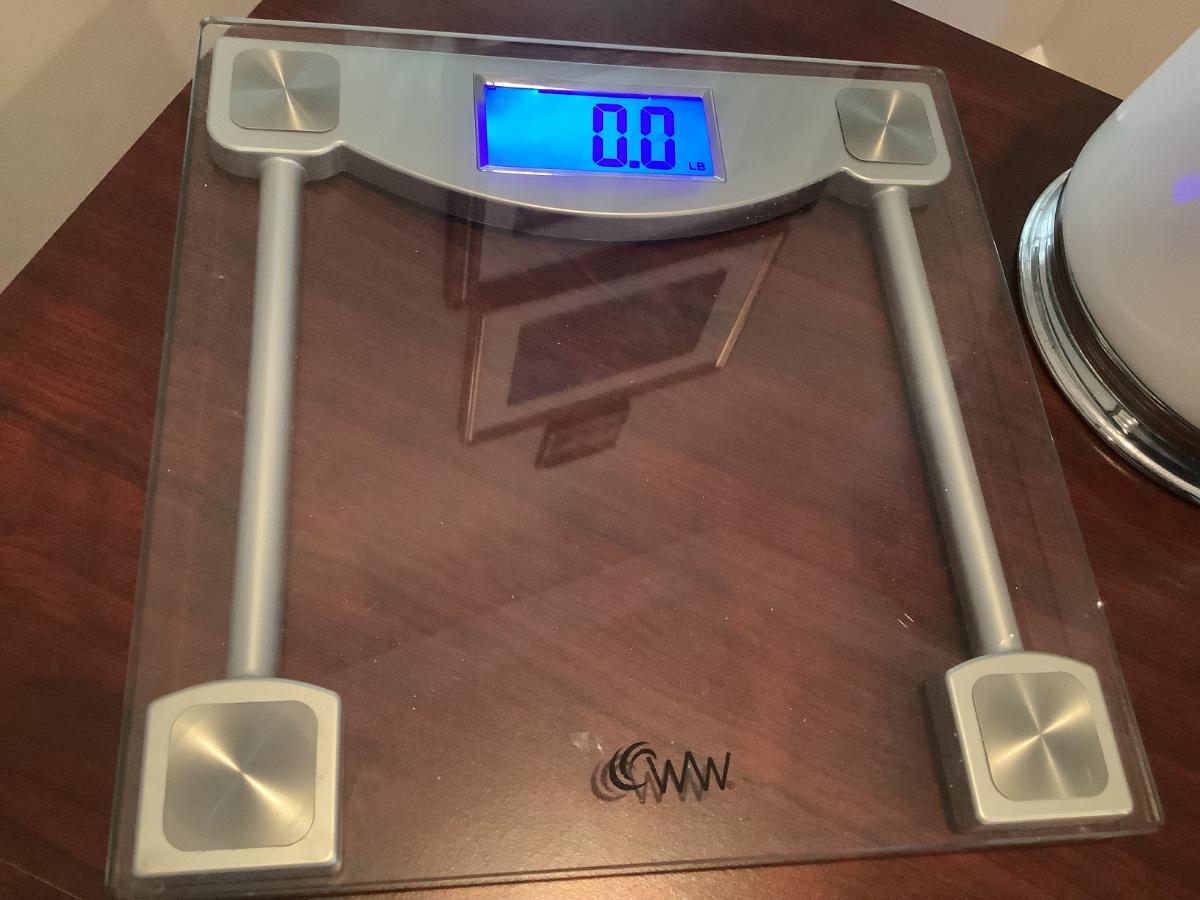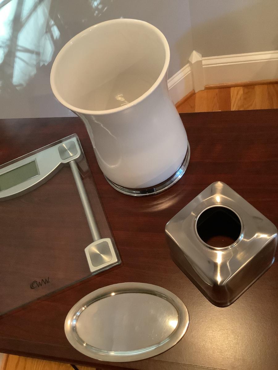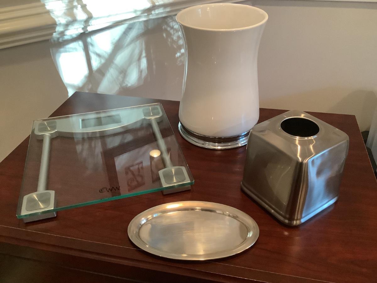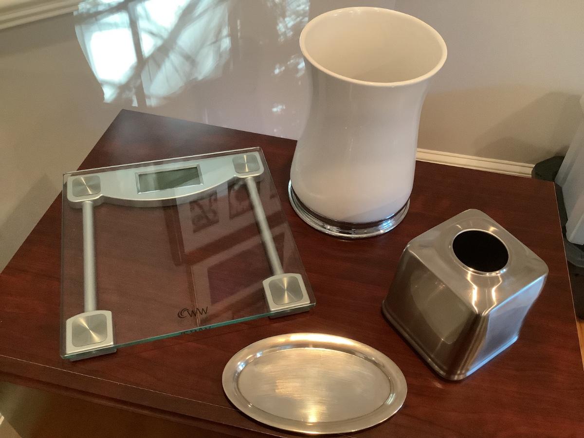 WW Scale, tissue box, trash can, and tray