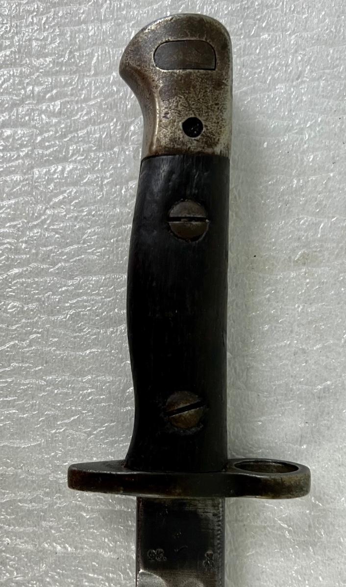 Model P-1907. Made by Wilkinson Sword Company. Includes leather scabbard. Blade length is 16.5". SOLD AS IS.