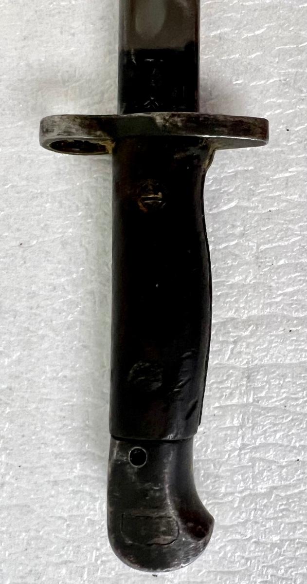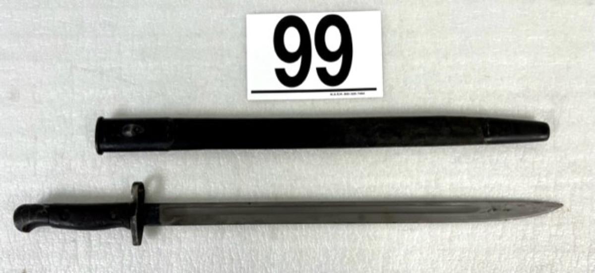 Model P-1907. Made by Wilkinson Sword Company. Includes leather scabbard. Blade length is 16.5". SOLD AS IS.