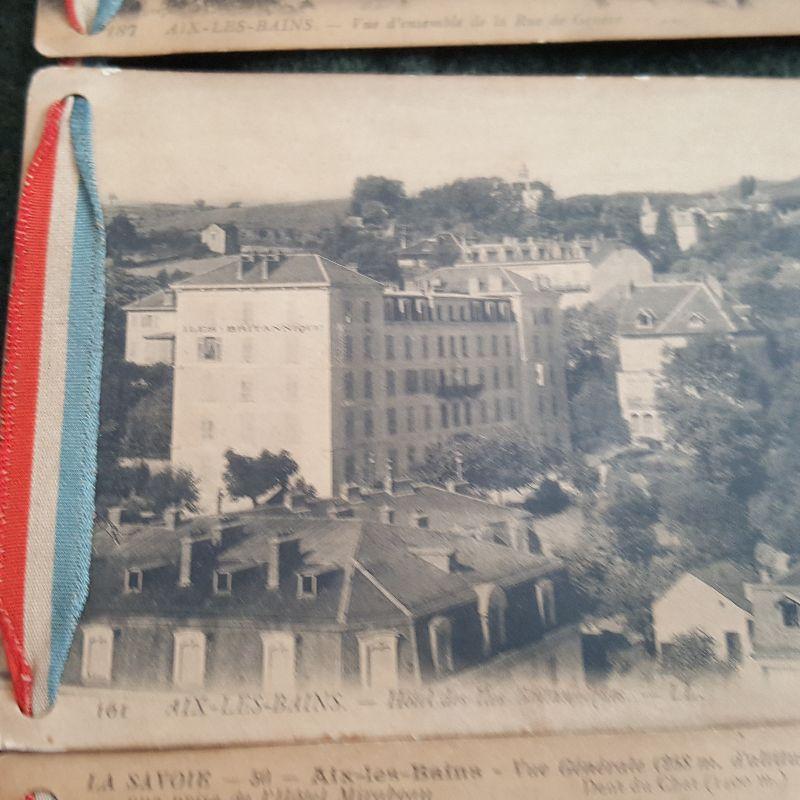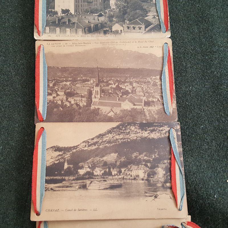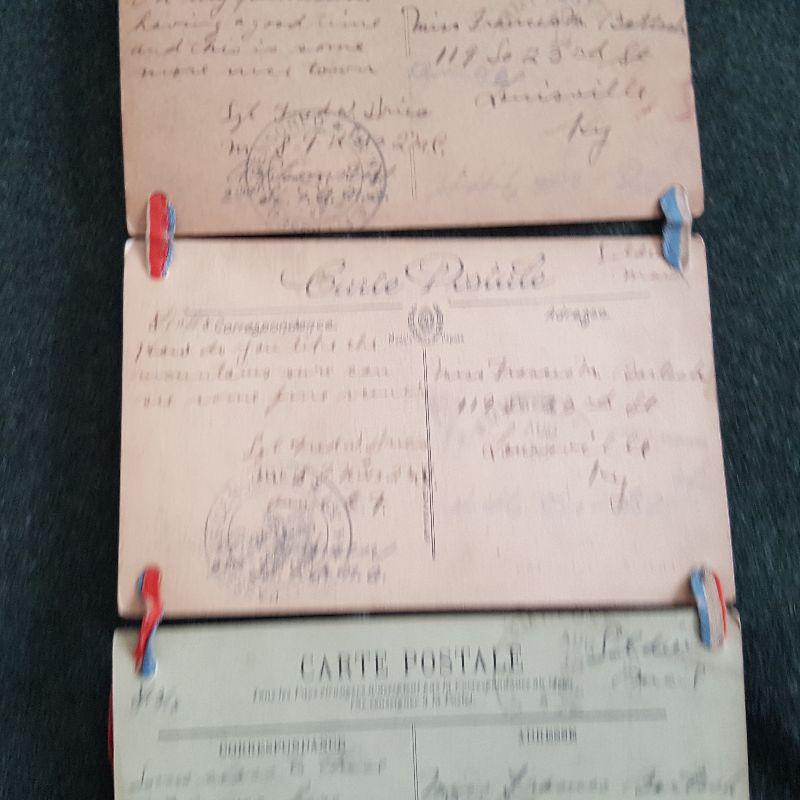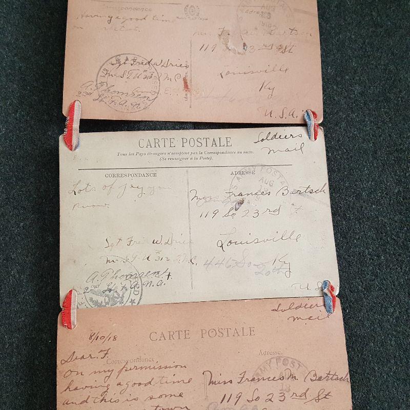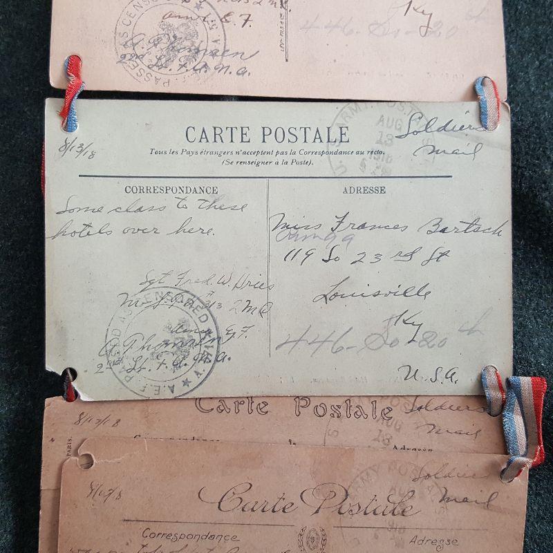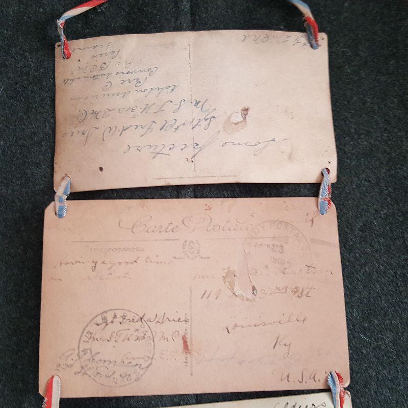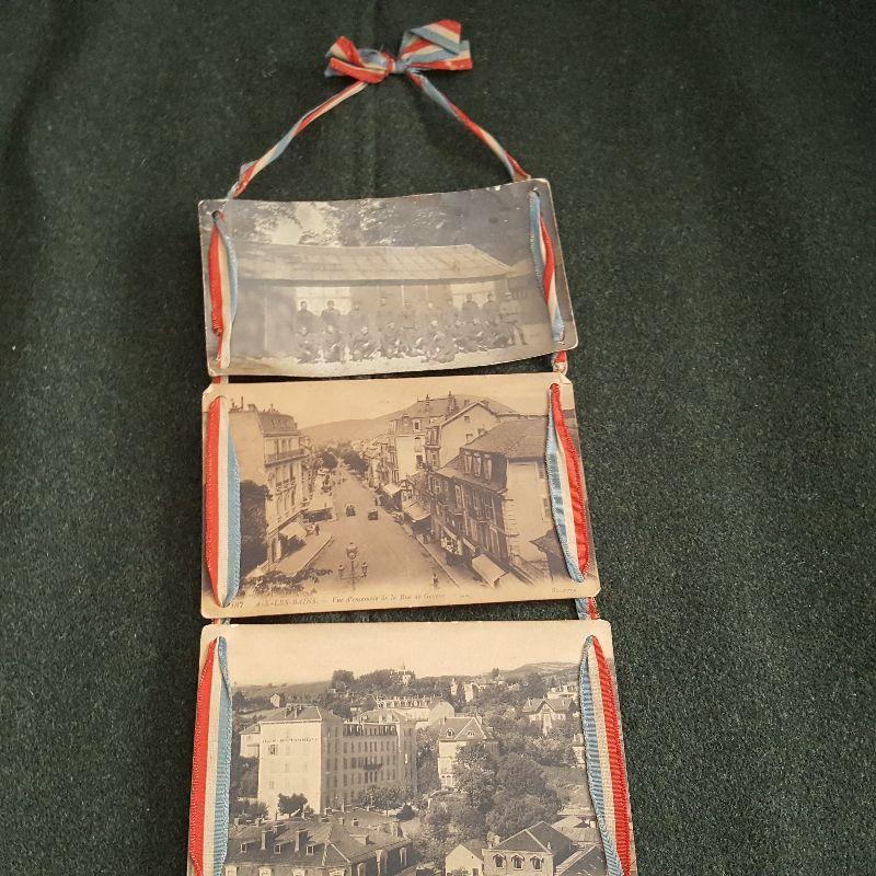 This auction lot is for a wall hanging of 9 postcards that shows a WW1 Military Unit and the city in Europe where they served. This homemade but really neat military collectible is in rough condition - especially near the bottom, but could be repaired and stabilized by the right person. The post cards show the military unit in Paris, France. The remaining post cards show Aux-Les-Bains, a small city in southwest France about 60 miles from Lyon. Interesting written comments from the sender on each card verso. One postmark shows August 1918 nearing the end of WW1.
