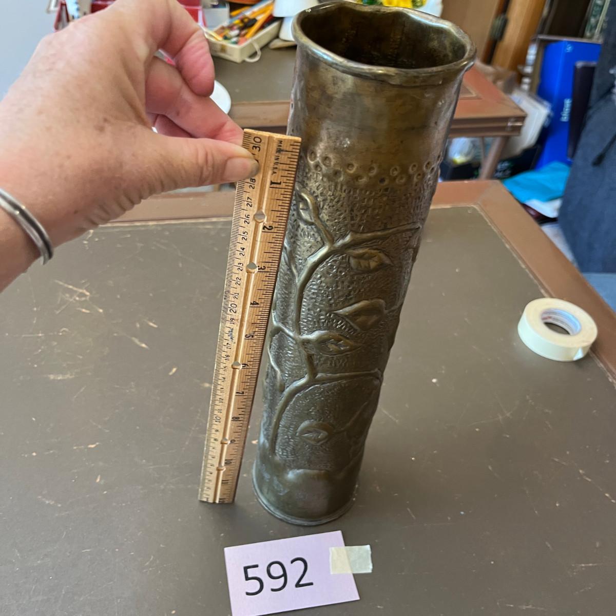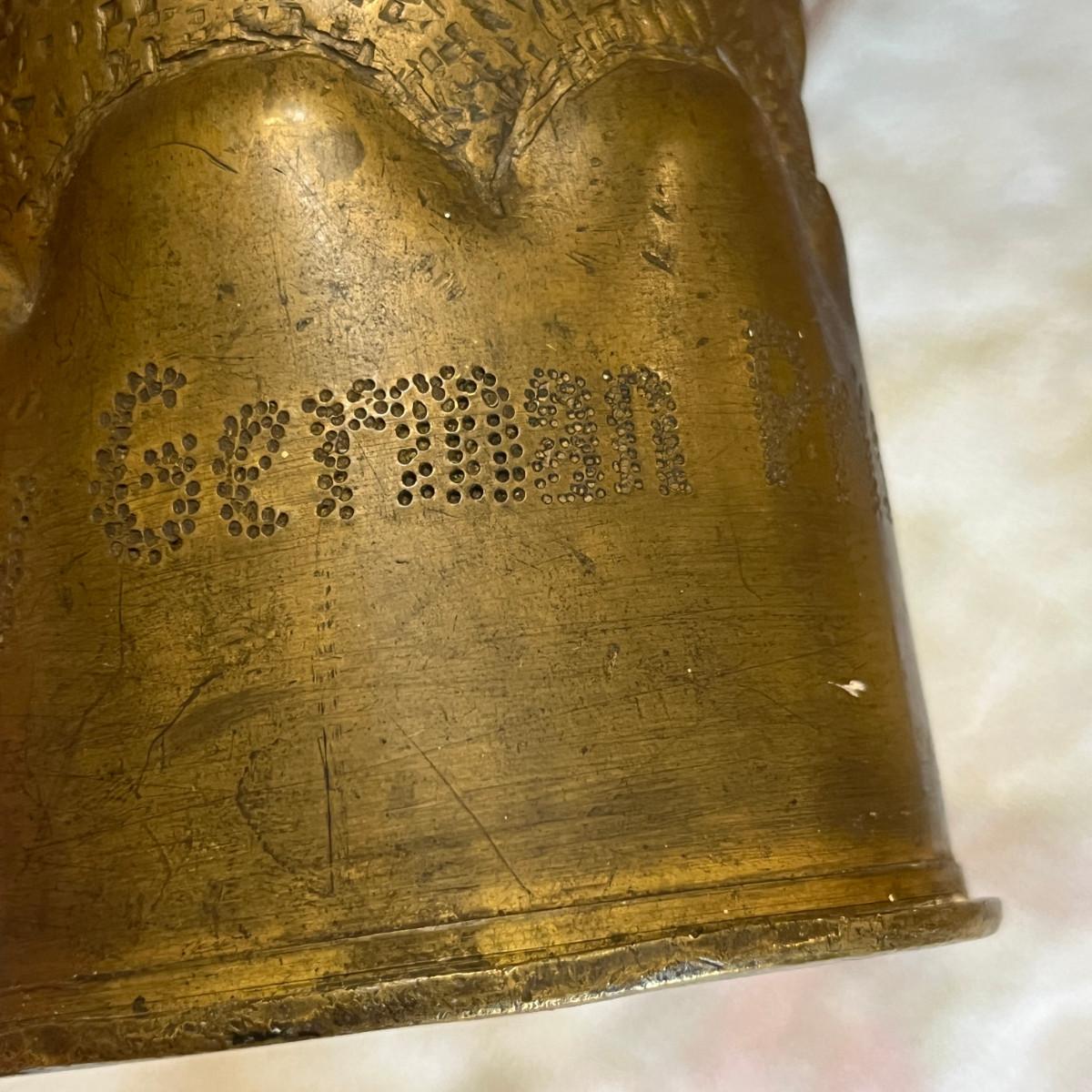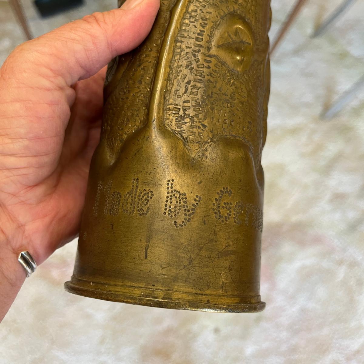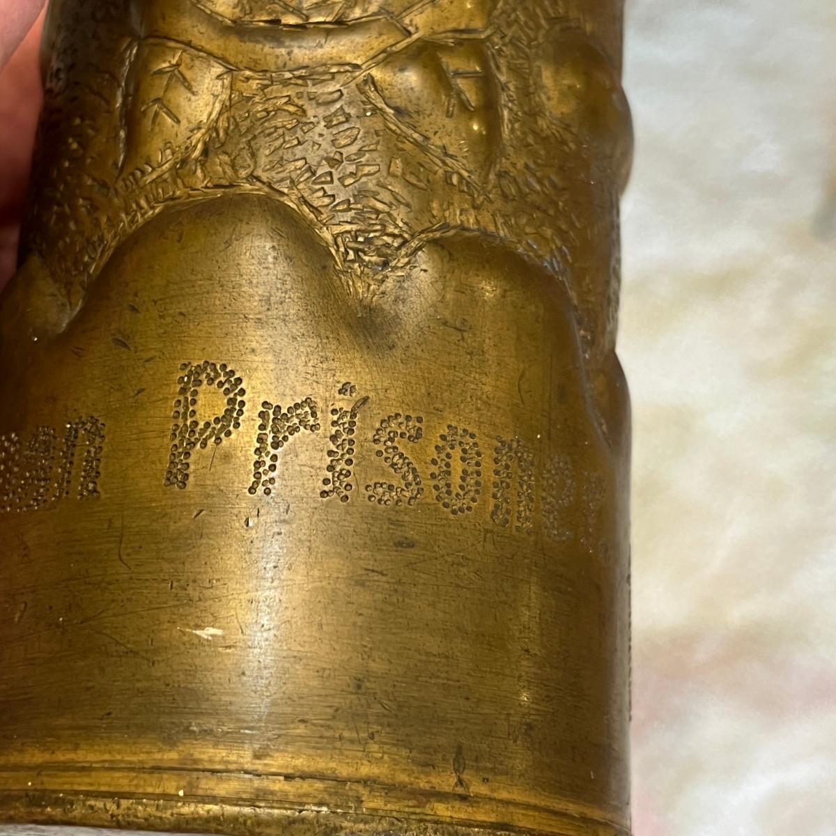 Take time to look at all of the pictures! This was a US Navy shell casing that was made by German POW prisoner! The artistry is great. These are getting so very rare!
