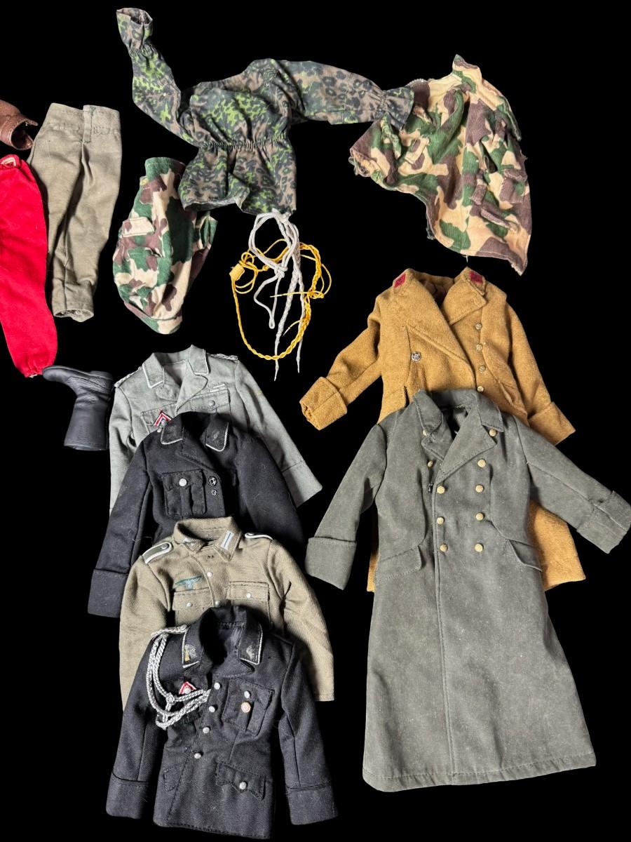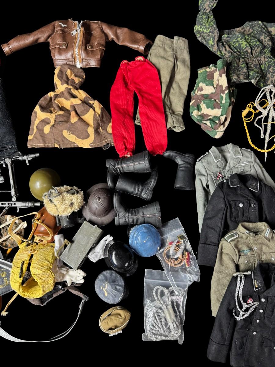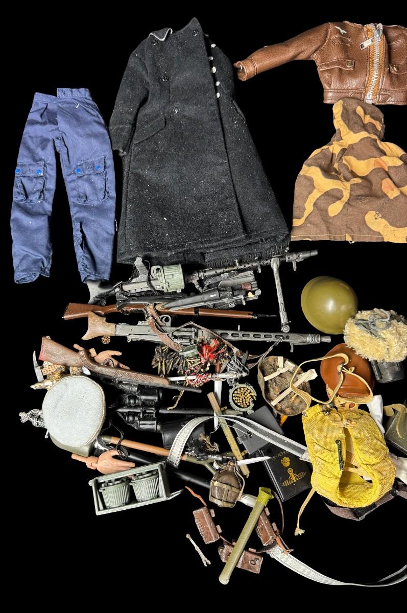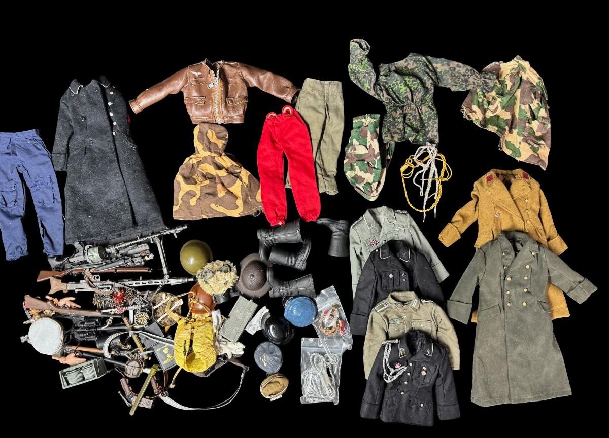 Includes uniforms, hats, boots, rifles, gloves, swords, and more. Total of 70+ pieces. Believed to be for 1/6 scale figures. Age related wear. [JS]