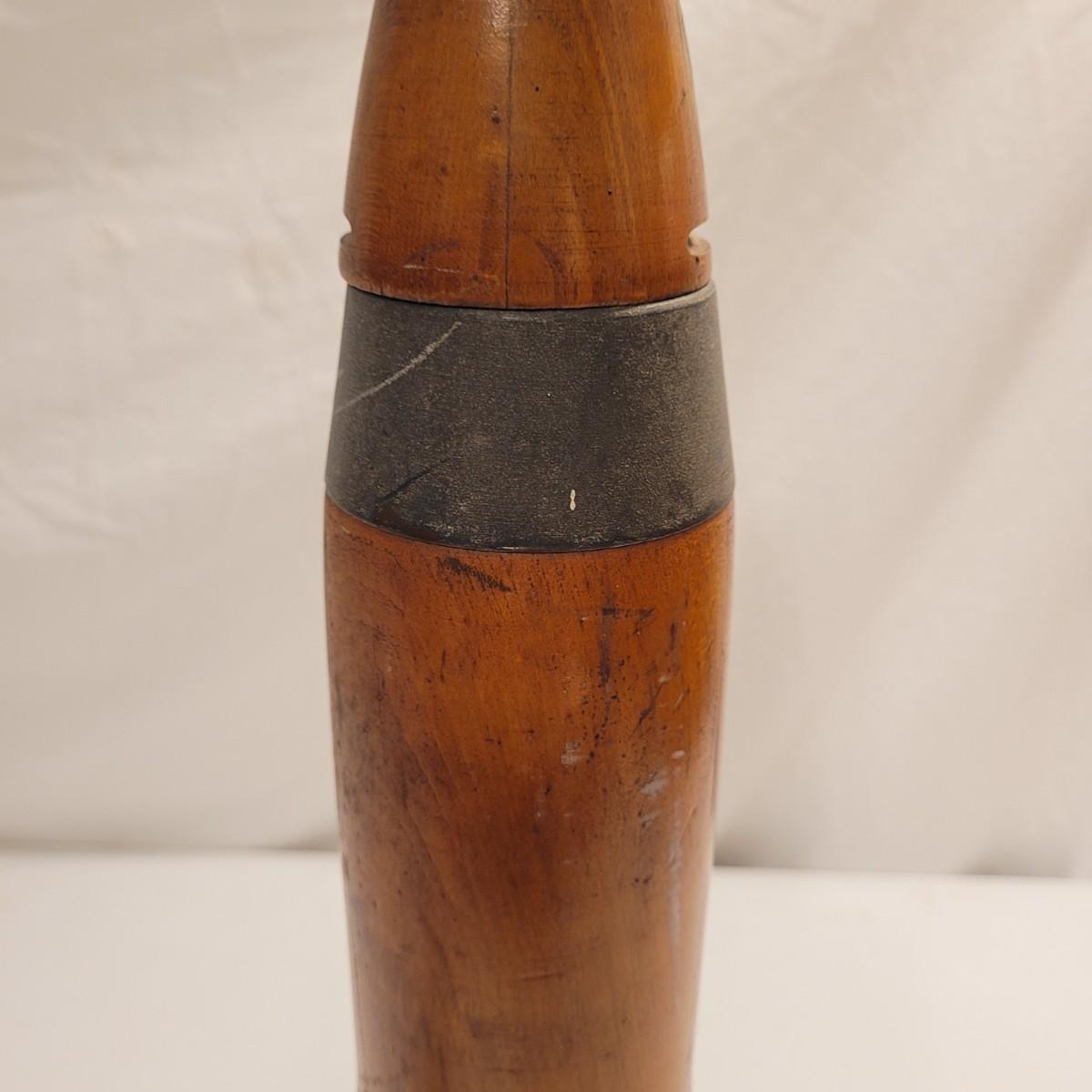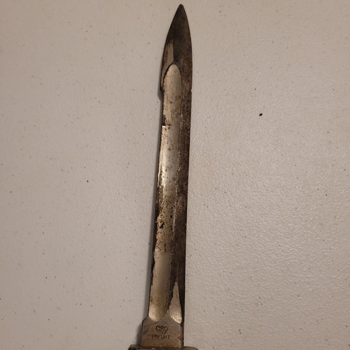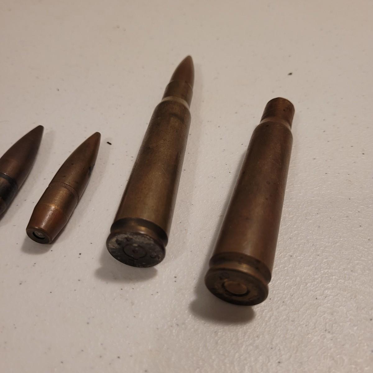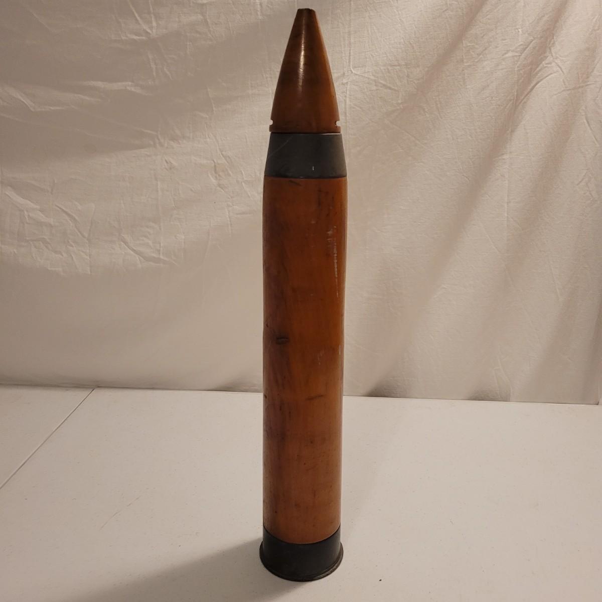 Appears to be a WW2 bayonet, a wooden 37mm dummy tank round dated 1944 which is 20.5" in length, and spent ammunition. The bayonet is made from metal and wood and would have attached to the end of a rifle. It is marked Erfurt which suggests German craftsmanship, and is 15" in length. The other items are miscellaneous Shells and bullets.