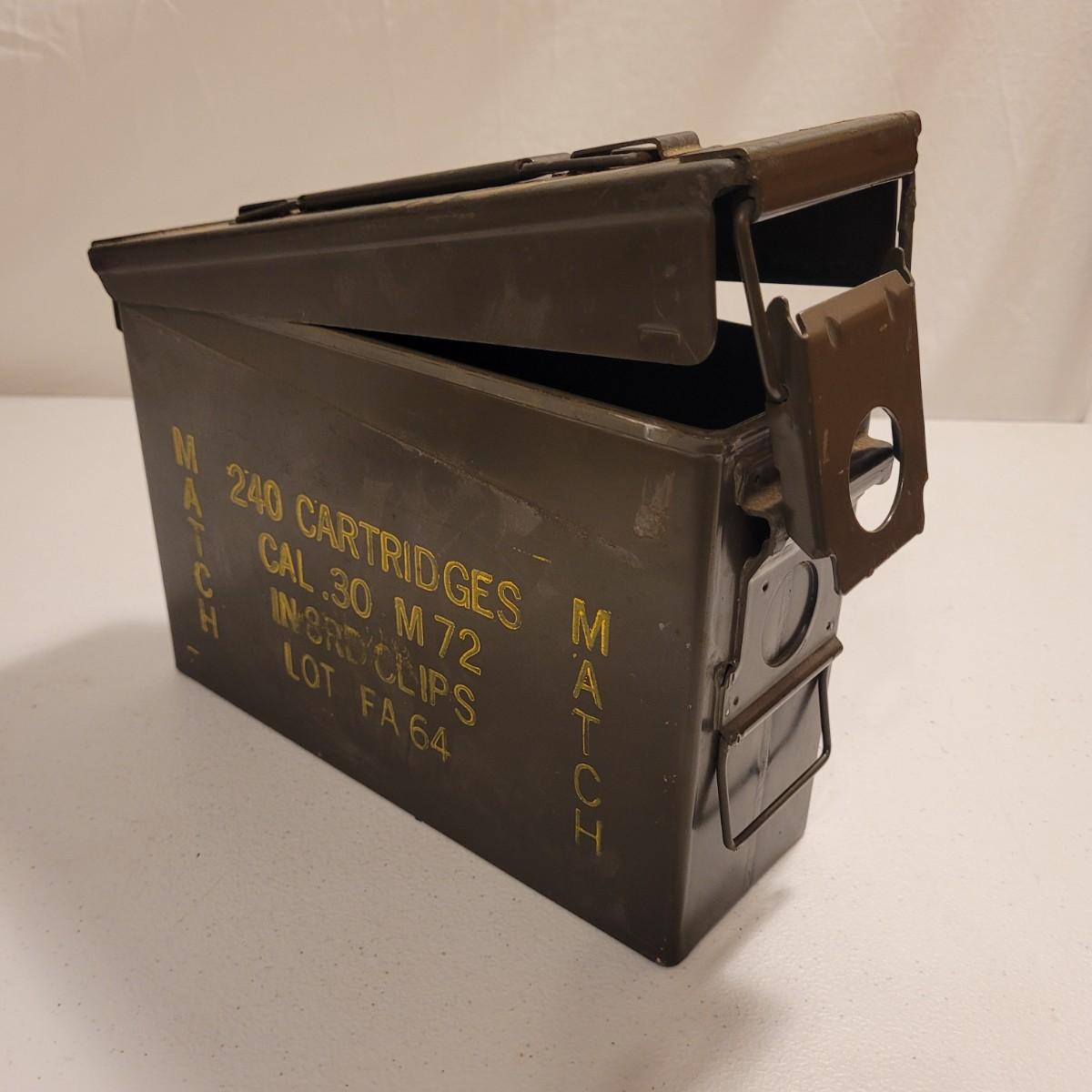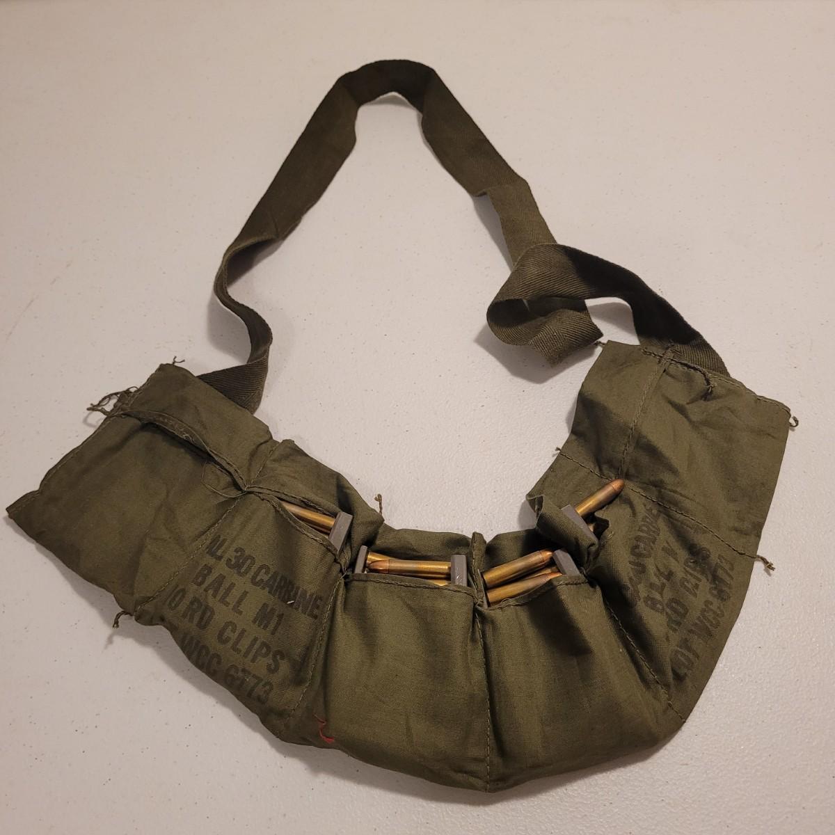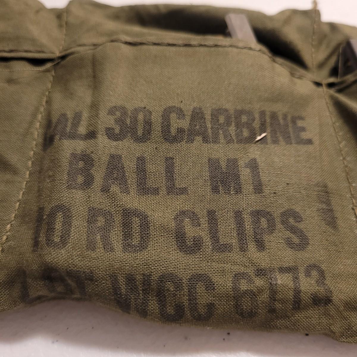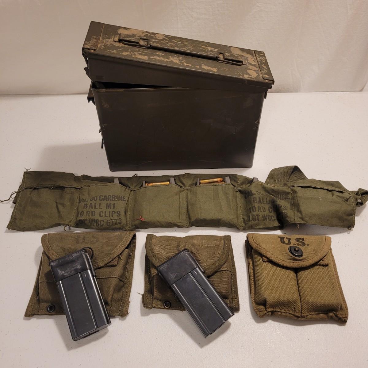 Appears to be a WW2 era M1 Garand bandolier, ammo pouches, magazines, Ammo box, and .30 carbine ammunition. The Bandolier is made from light cloth and contains seven sleeves of .30 carbine ammunition. This ammunition is dated and will likely need inspection before use. There are three magazine punches, one of which holds two magazines. The other two are empty. There are two extra magazines that do not fit the pouches correctly. Also included is a metal ammo box for storage.