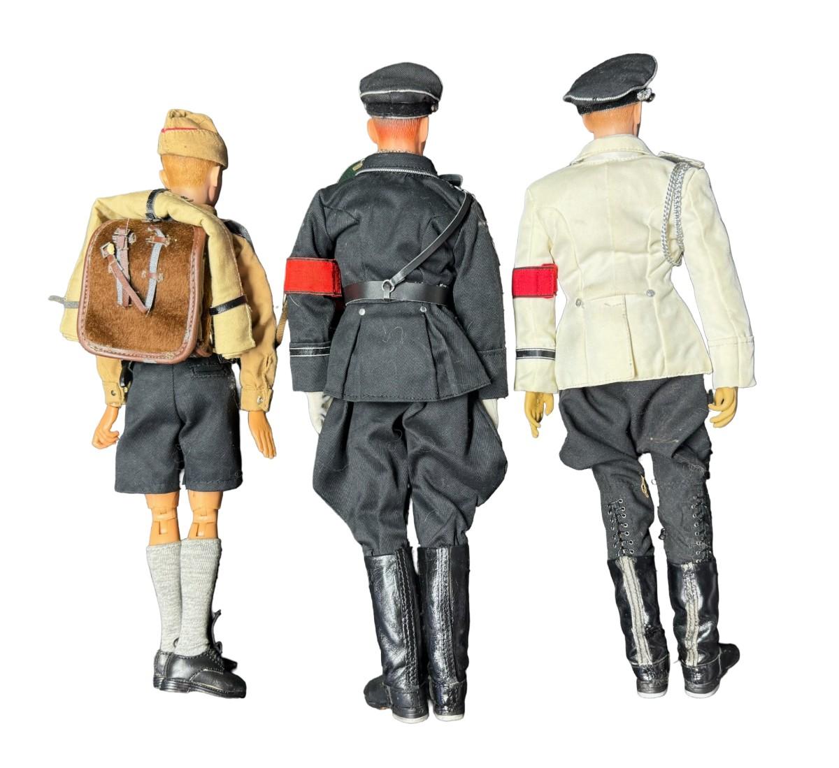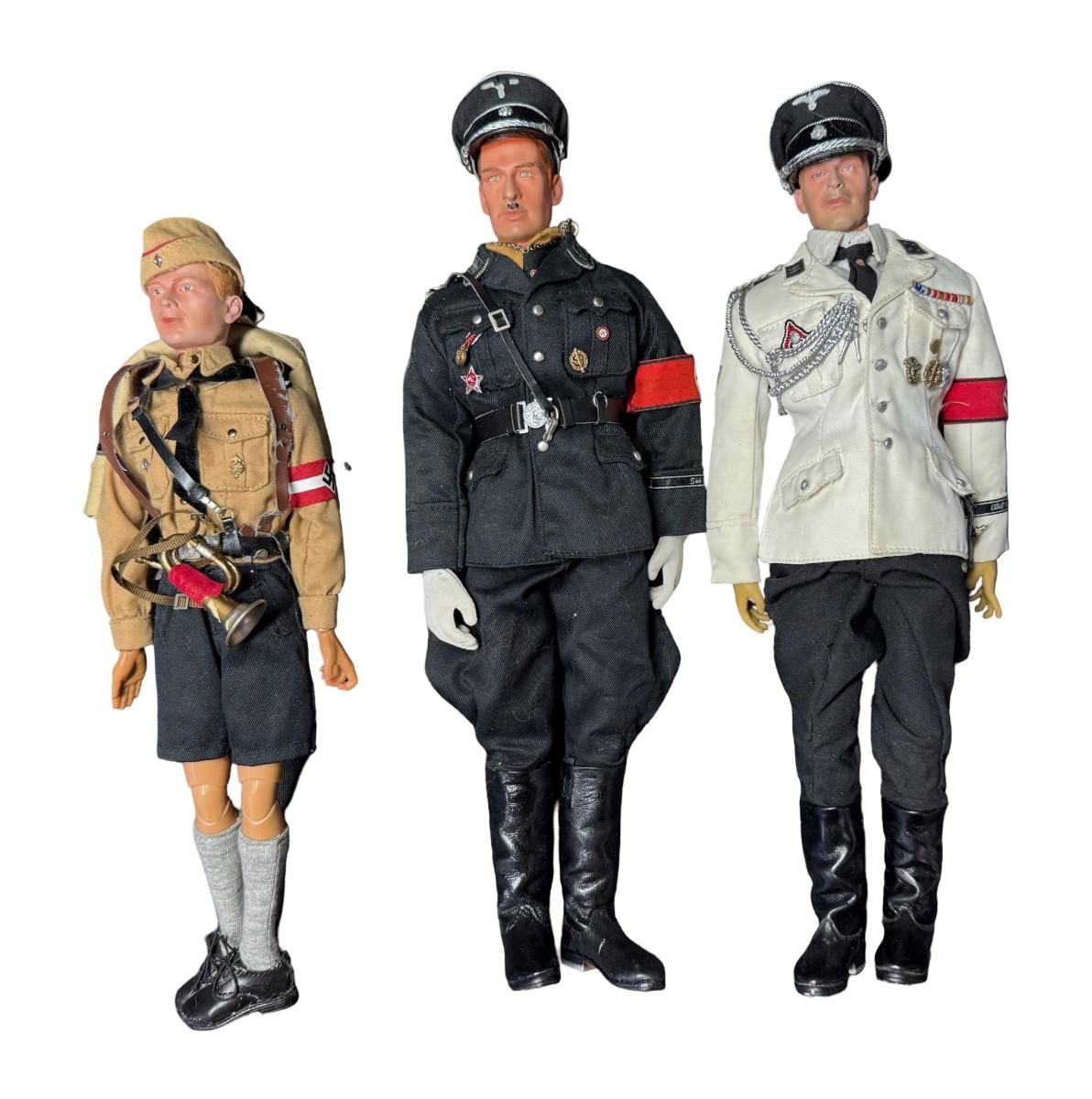 Includes a Hermann Weber Nazi Youth figure, and two others. Total of three pieces. All are made by DiD Corporation, and are 1/6 scale. There is age related wear, and the figures may or may not have all original accessories. These have been in a smoky environment. [JS]