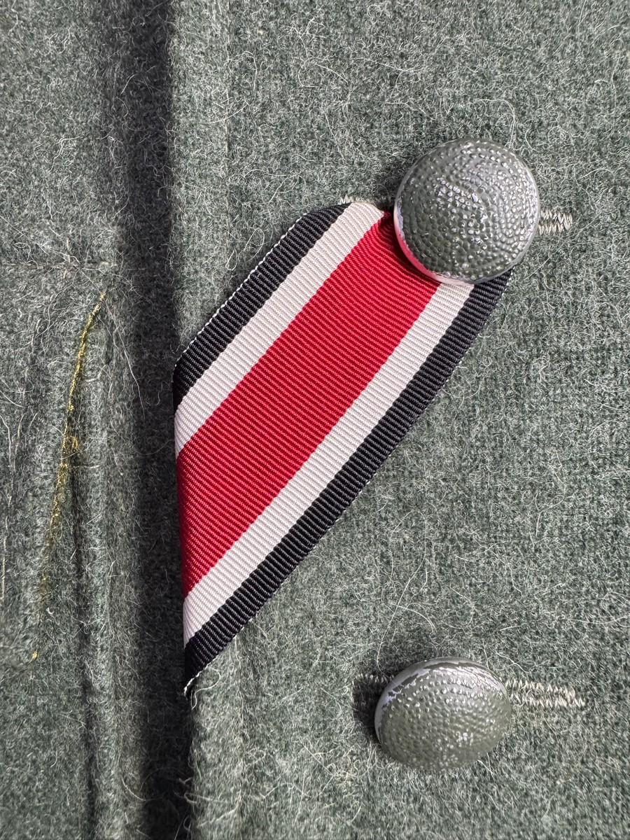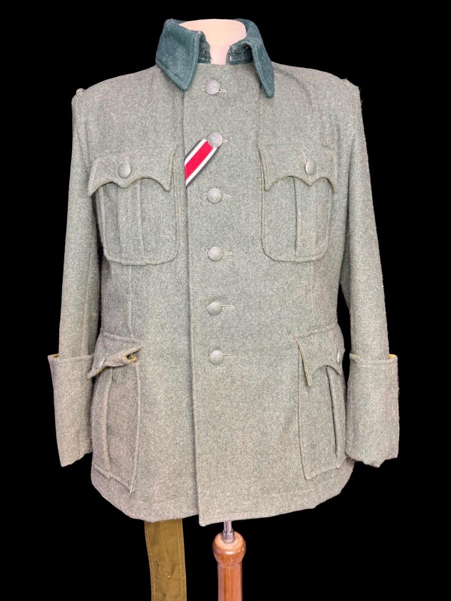 This is greenish-grey wool, which was standard issue. It features four pleated patch pockets with scalloped flaps. It has a ribbon for the Iron Cross Second Class. It is possibly a reproduction or prop. The size is approximately medium to large. This has been in a smoky environment, and needs to be cleaned. Pre-auction estimate: $150-$250. [JS]