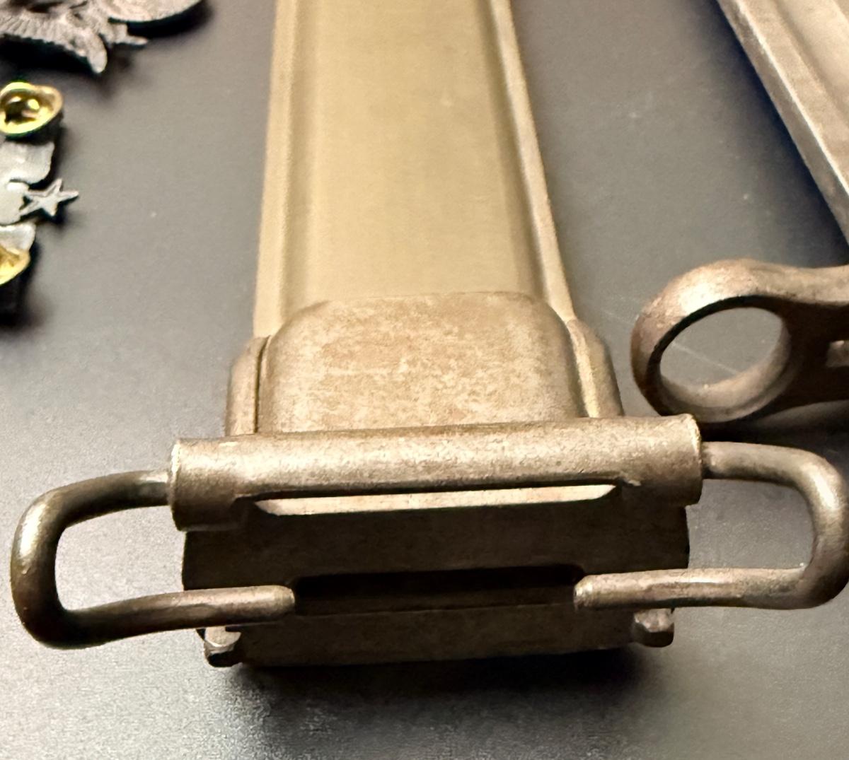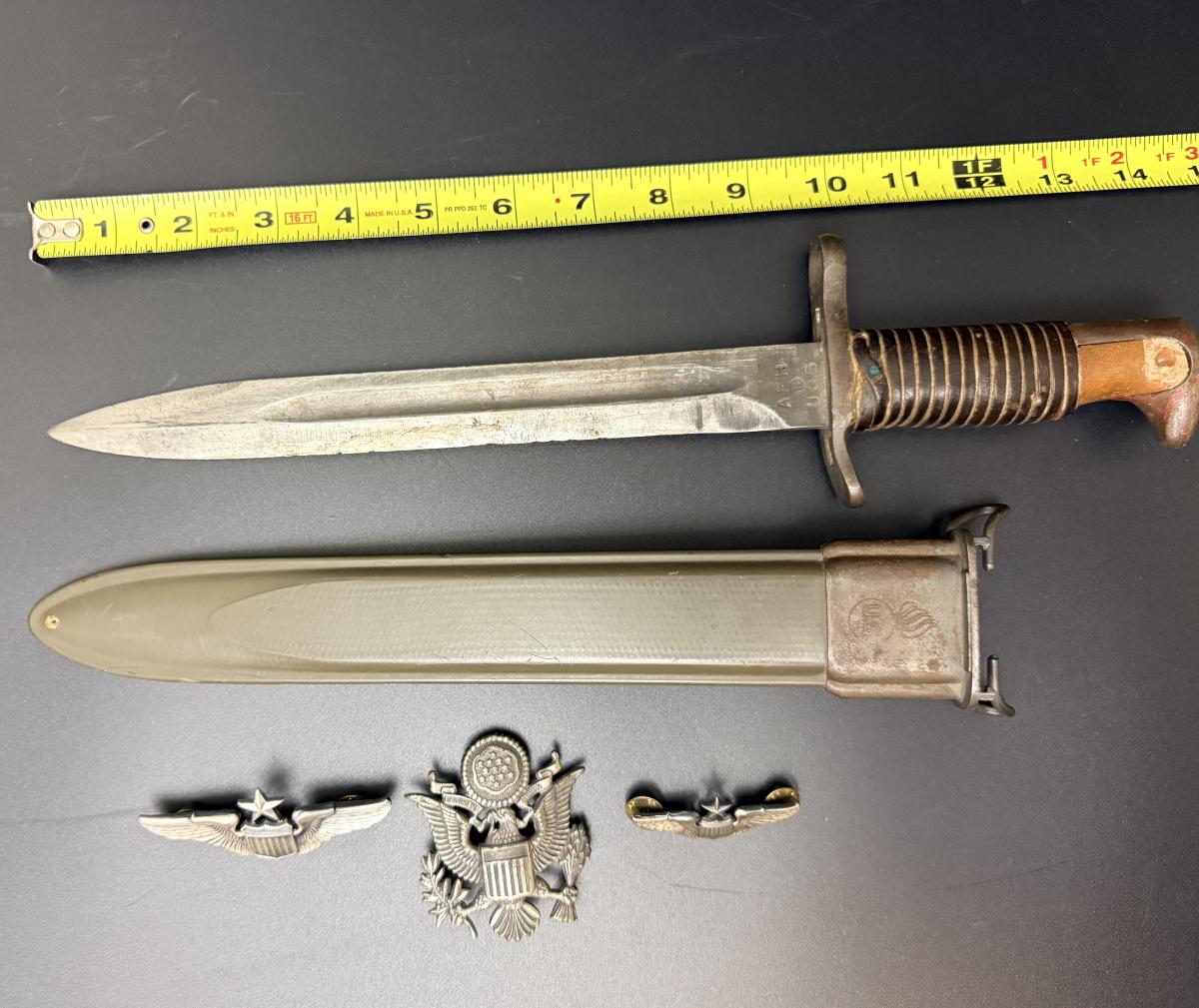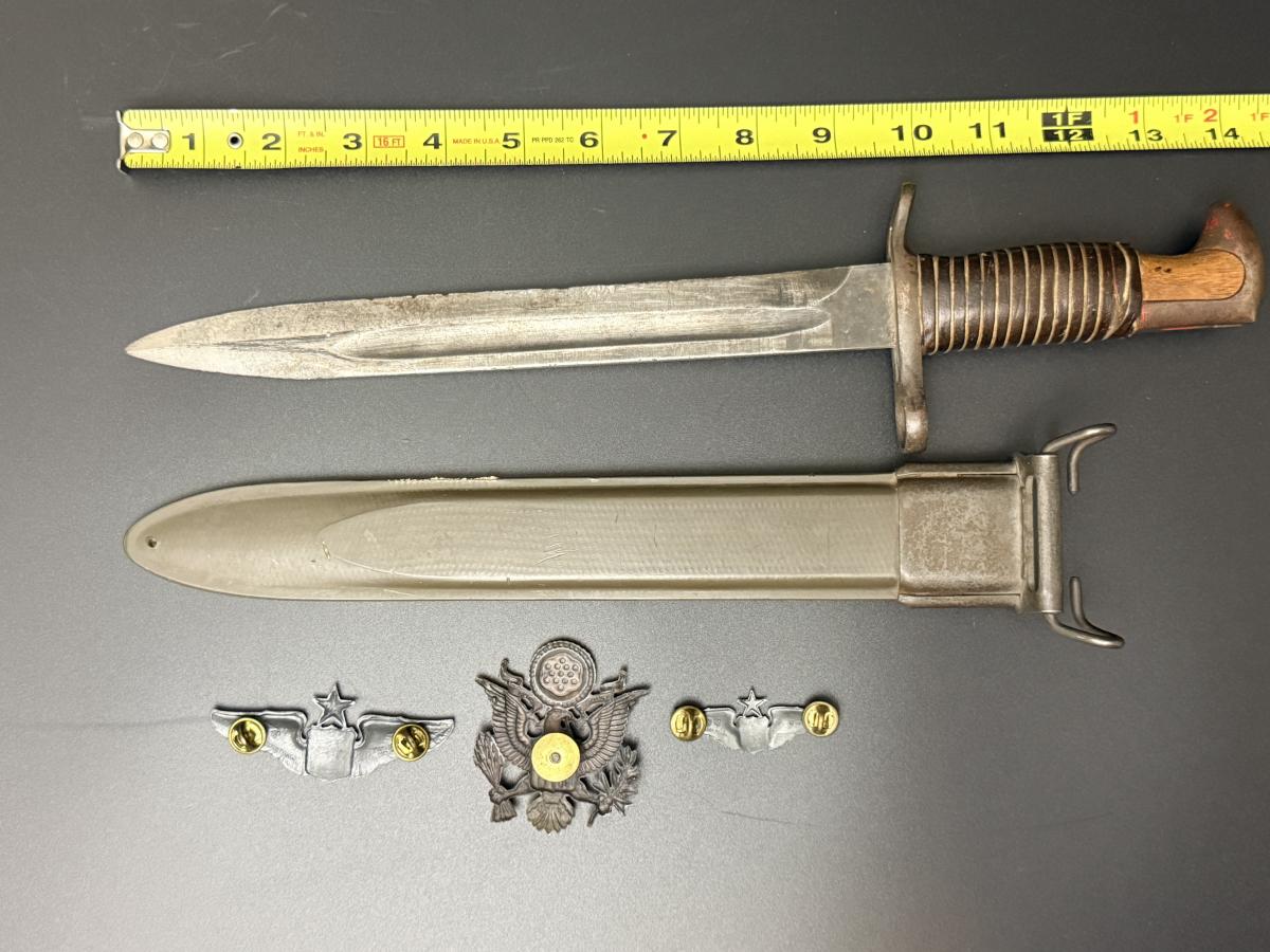 WW2 Military Bayonet with Scabbard plus 3 Badges