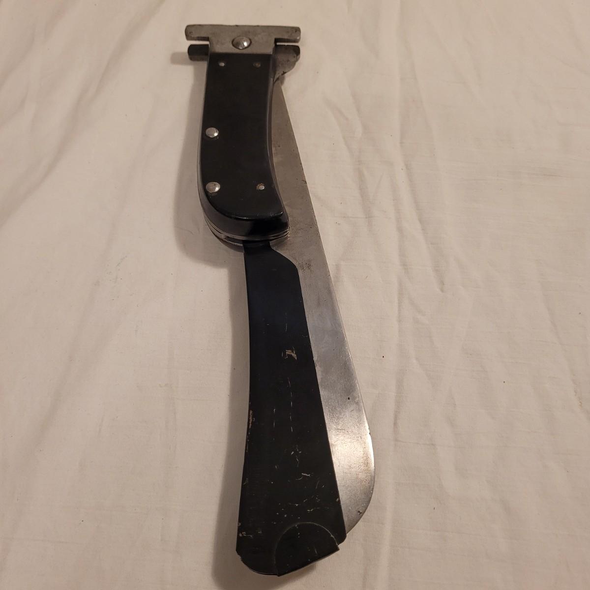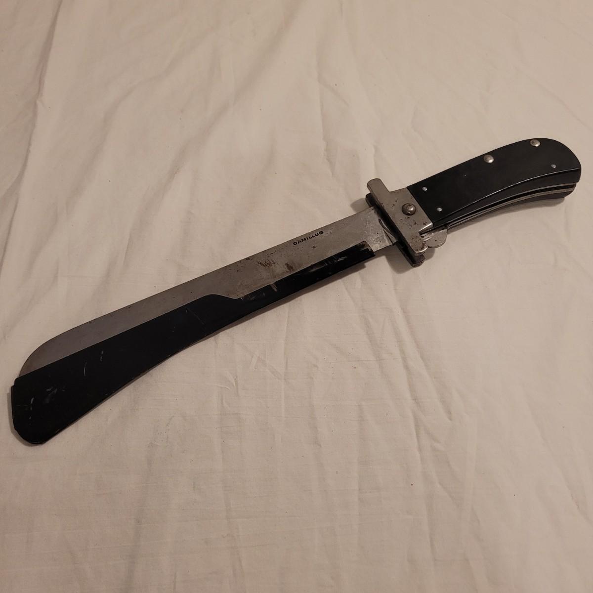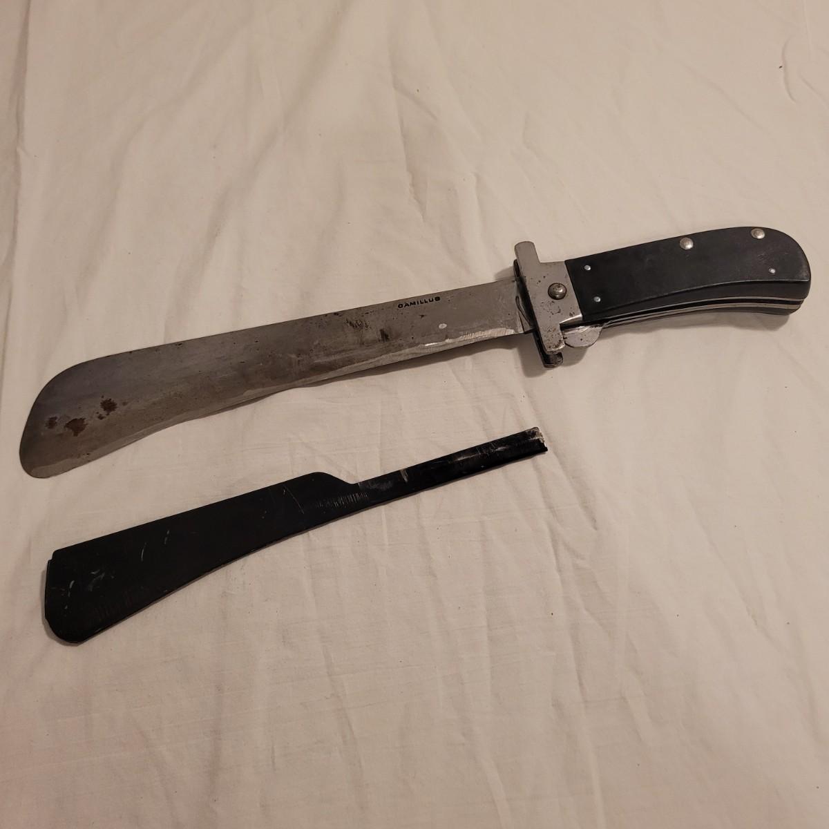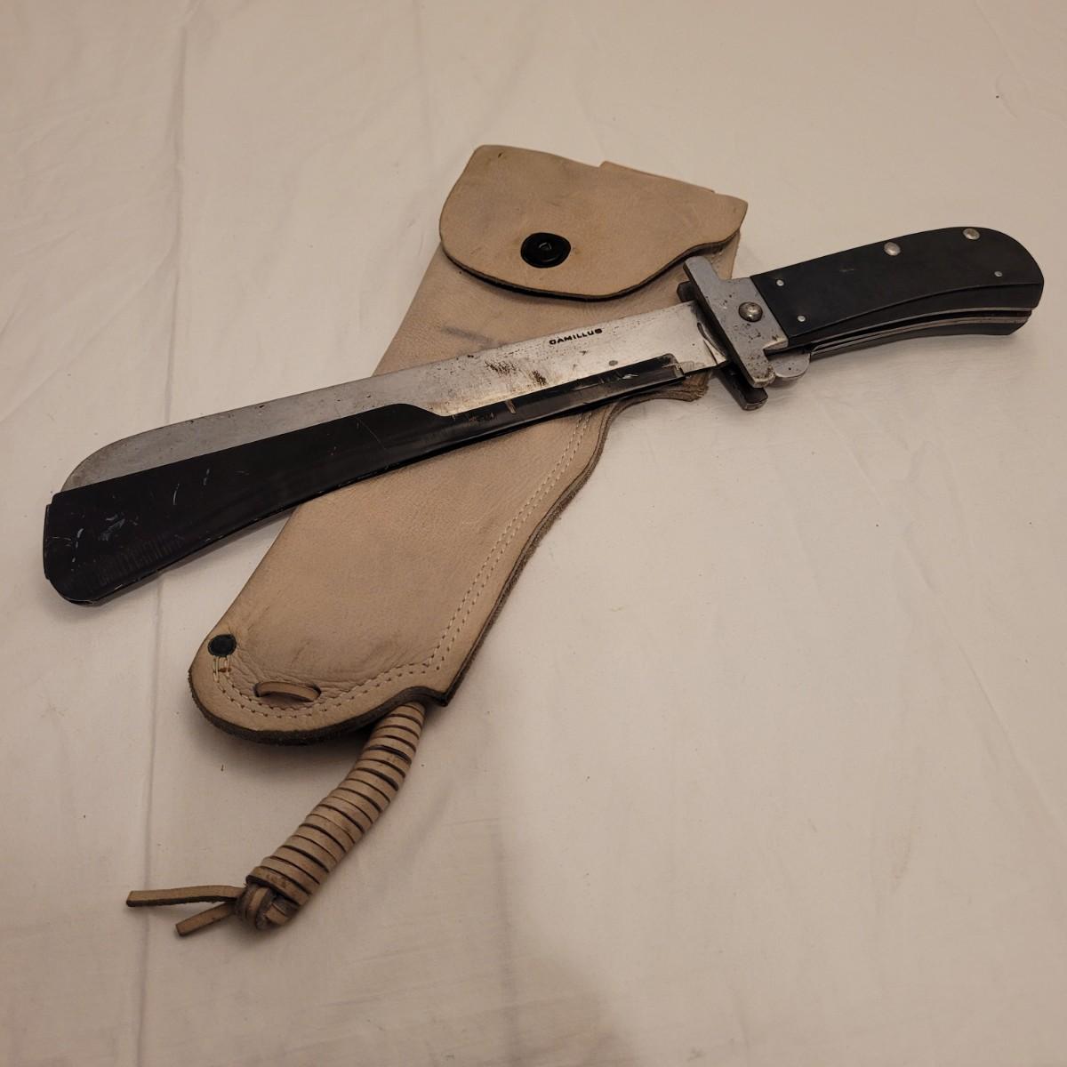 Large metal folding knife that appears to be a pilot's survival knife. It includes a leather holster. It is marked Camillus on the blade and measures 11" in length when folded. When open, the knife measures 16" in length. The machete folds and locks and features a metal blade cover. Please see photos for details.