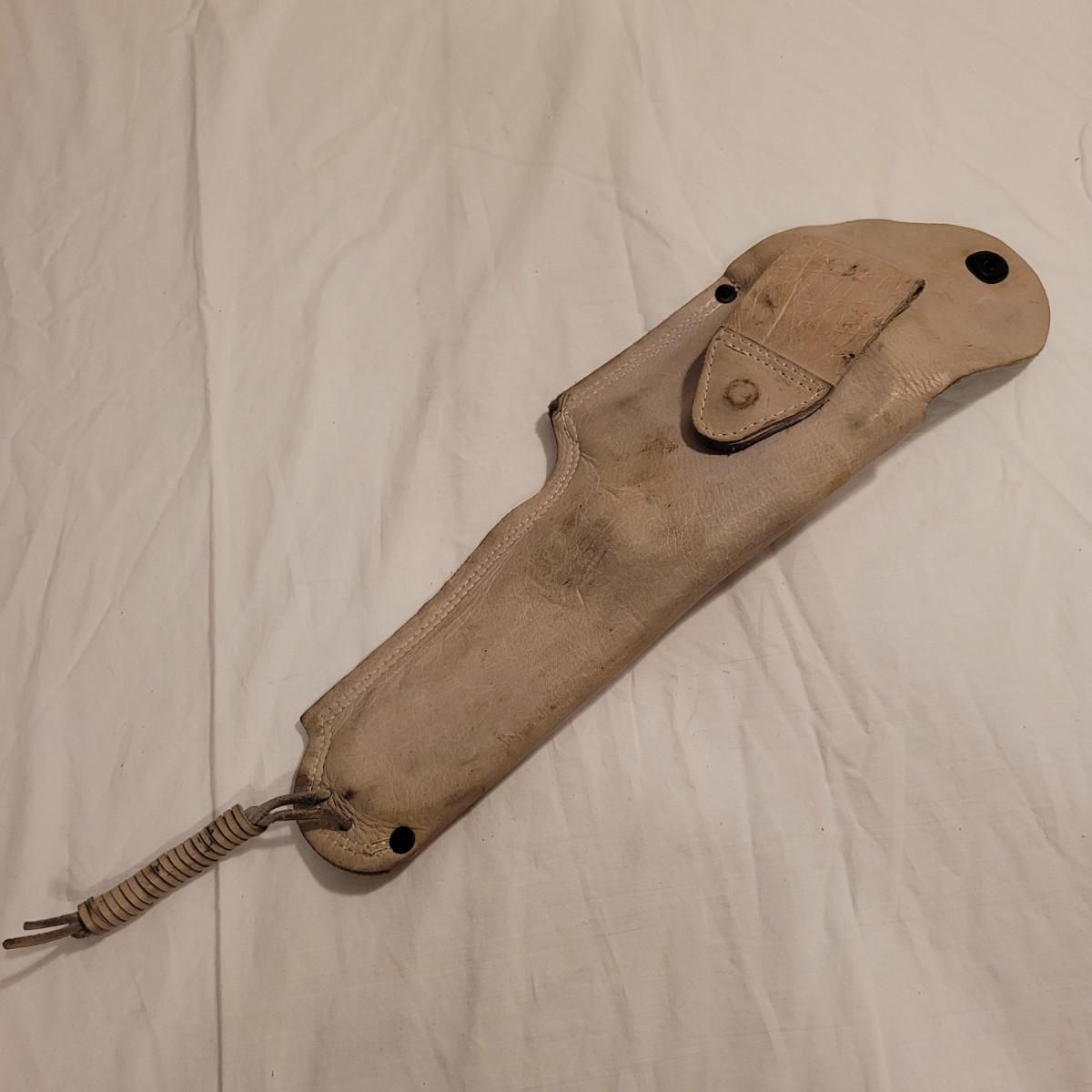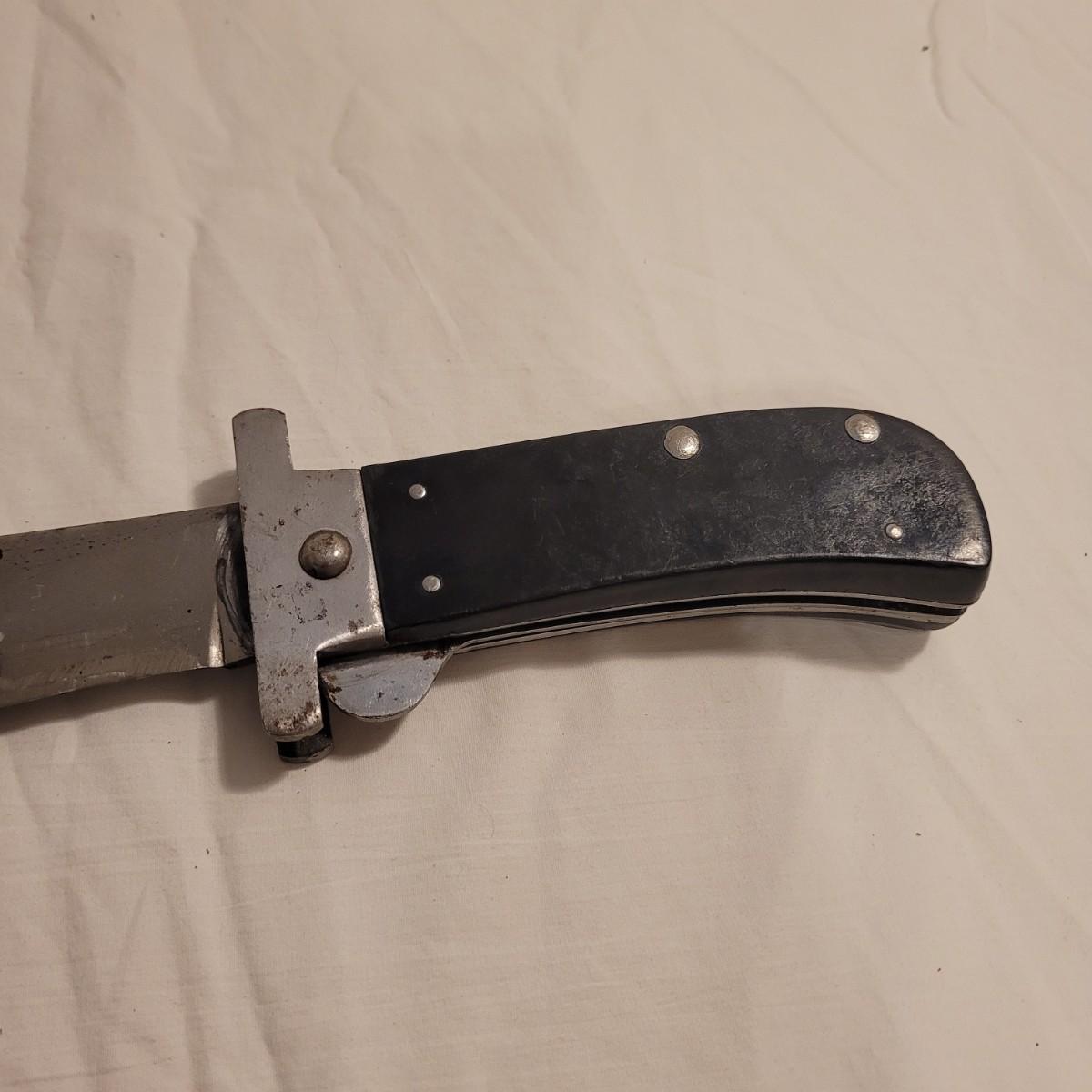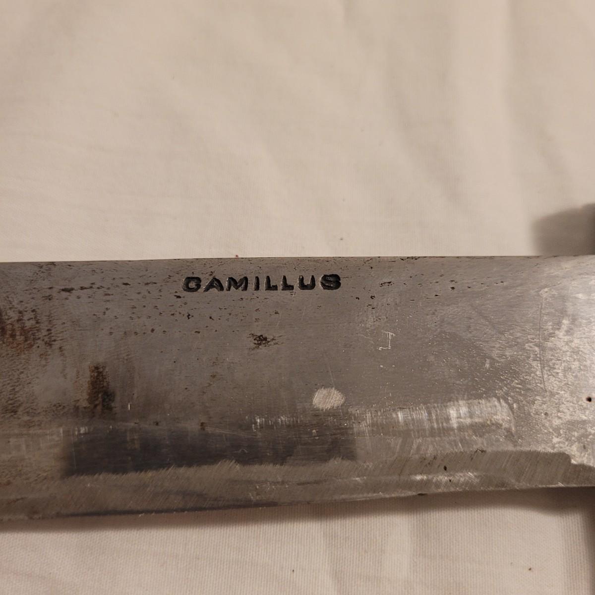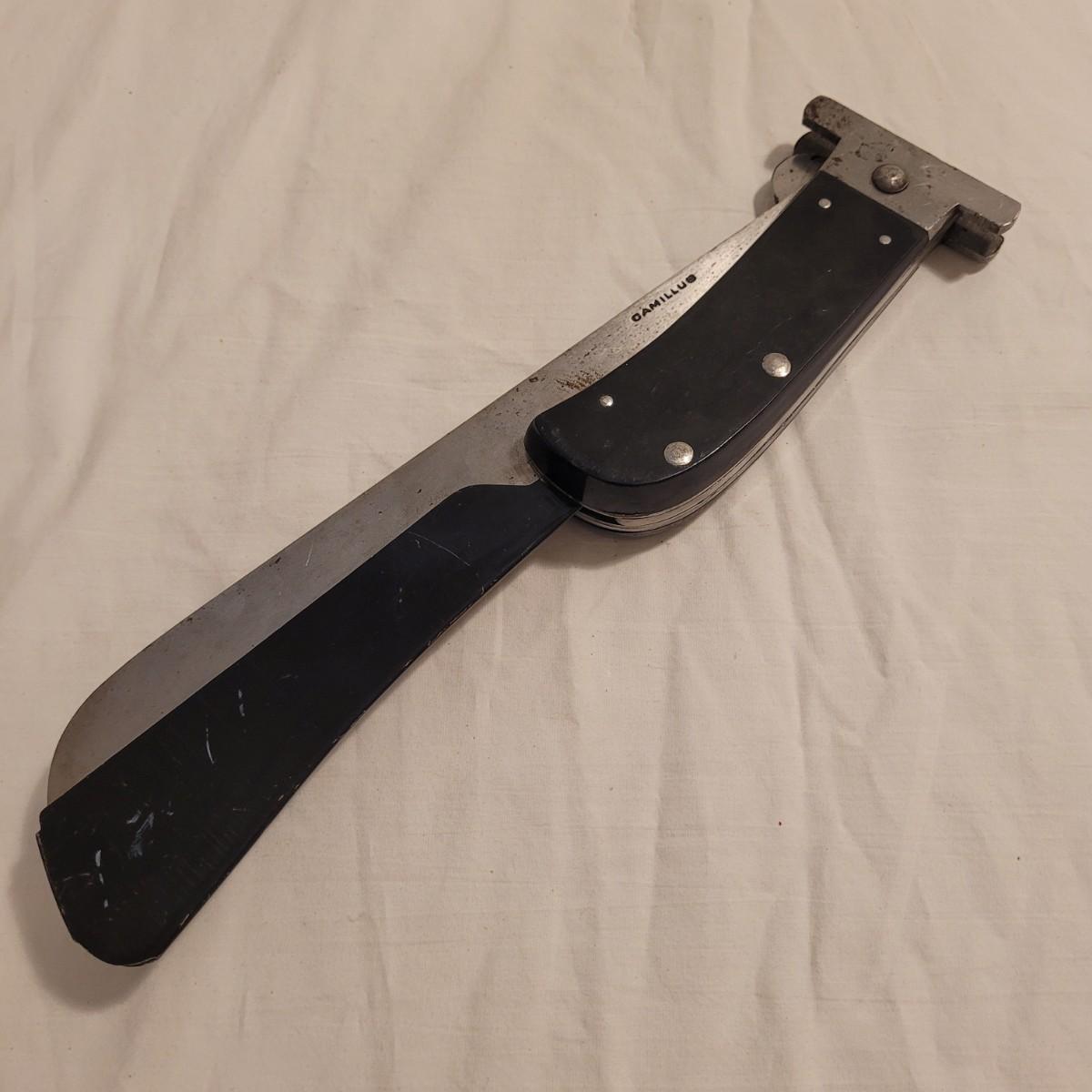 Large metal folding knife that appears to be a pilot's survival knife. It includes a leather holster. It is marked Camillus on the blade and measures 11" in length when folded. When open, the knife measures 16" in length. The machete folds and locks and features a metal blade cover. Please see photos for details.
