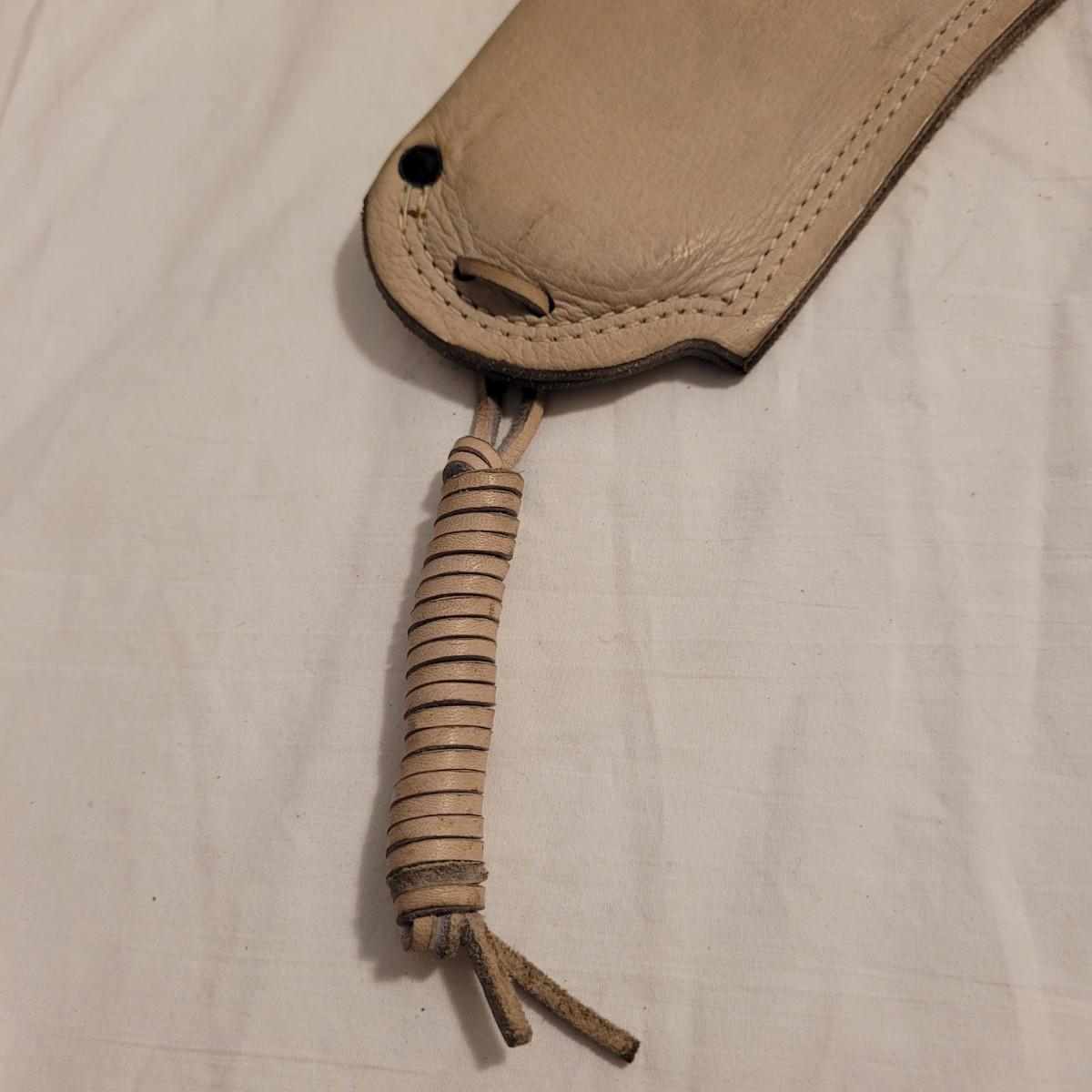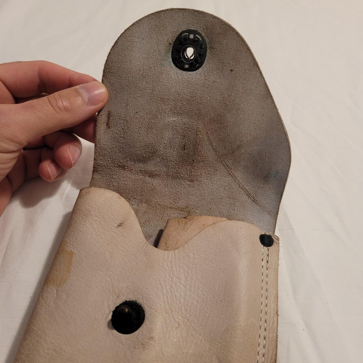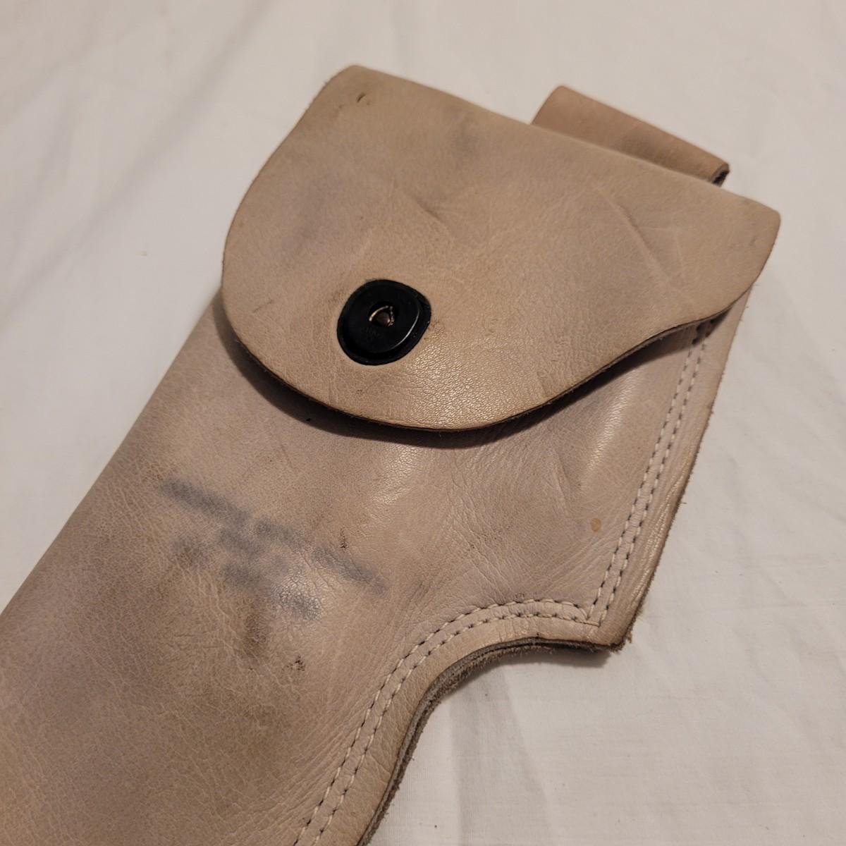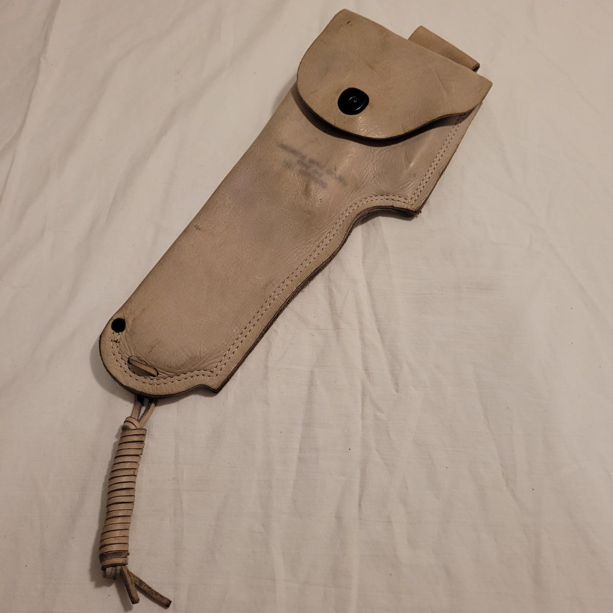 Large metal folding knife that appears to be a pilot's survival knife. It includes a leather holster. It is marked Camillus on the blade and measures 11" in length when folded. When open, the knife measures 16" in length. The machete folds and locks and features a metal blade cover. Please see photos for details.