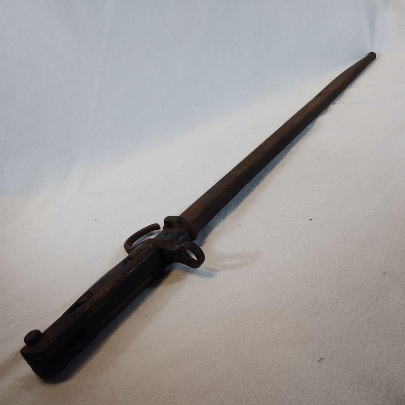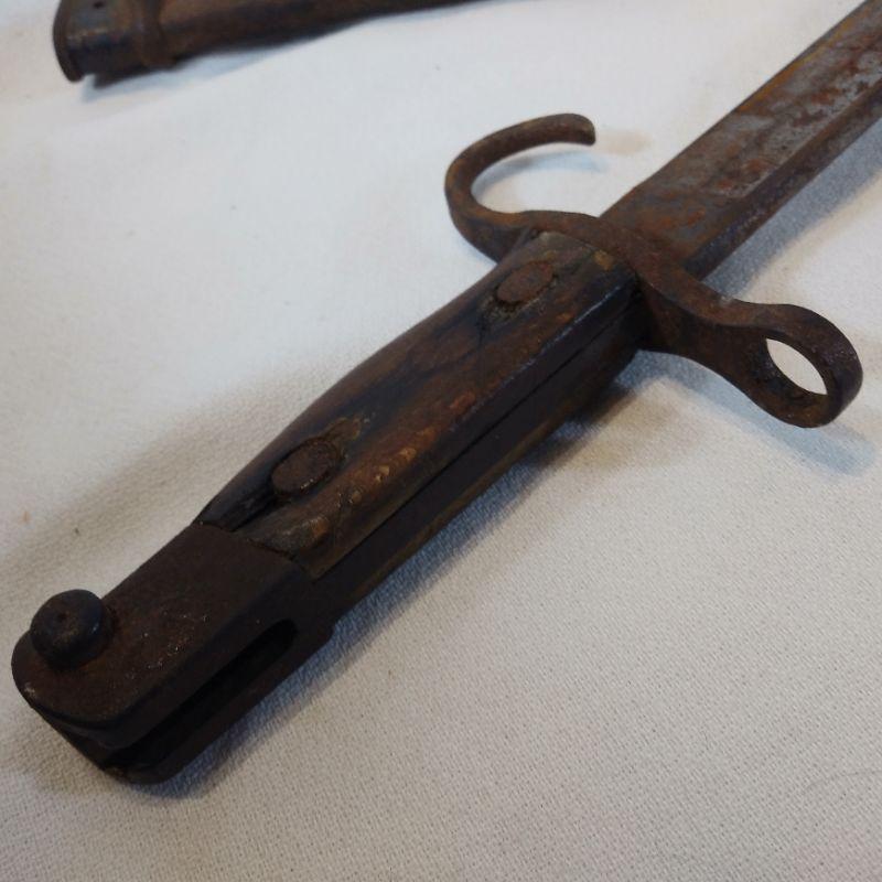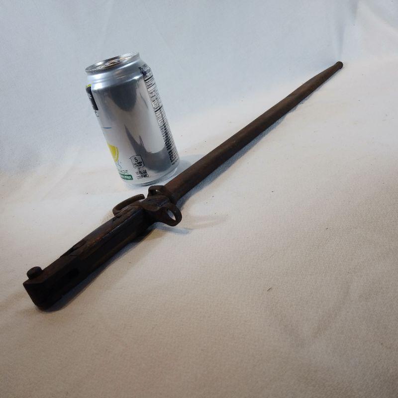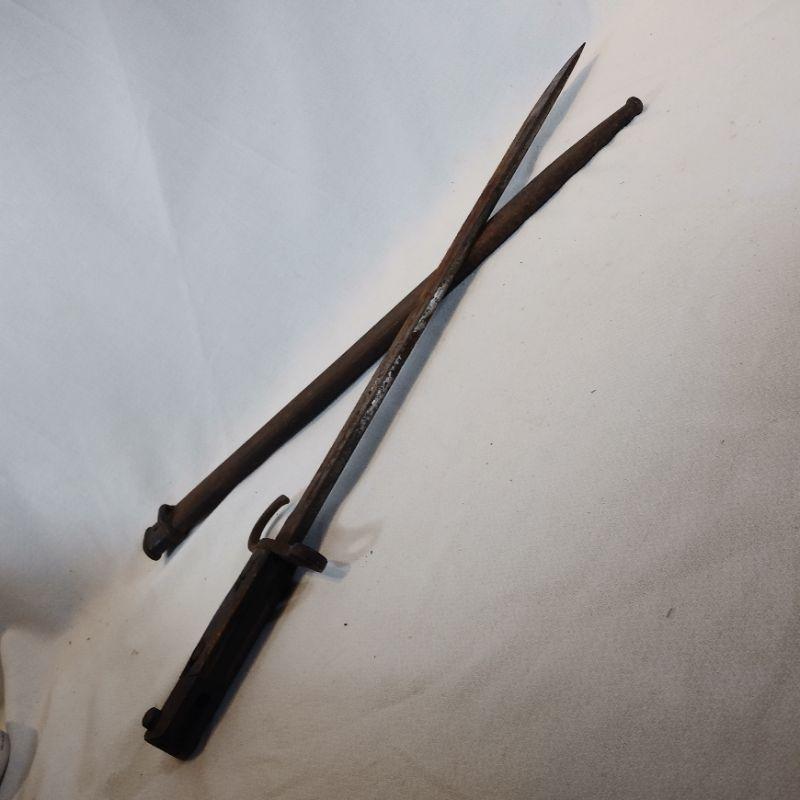 This is one of the most unique items we have ever offered. A World War One bayonet. All intact, just as we found it in our customer's attic - nice and rusty, consistent with age. The family has no knowledge of it's history and were not aware it was in the house. It measures 21-inches long X 4-inches wide.
