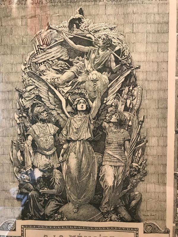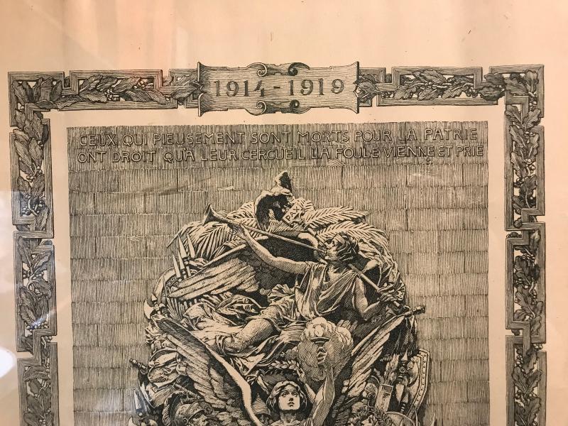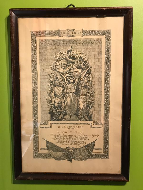 This original World War I honorary document was designed by famous pen and ink artist Franklin Booth for the French Government and produced by Cartier. The document depicts an allegoric image of war and peace along with the French and American flags. It is dated 1914-1919 at the top. The inscription in French reads: "Ceux qui pieusement sont morts pour la patrie ont droit qua leur cercueil la foule vienne et prie. A la memoire de Walter P. Bruce, Private, Company S, 808 Pioneer Infantry, des Etats-Unis D'Amerique, mort pour la liberte pendant la Grande Guerre hommage de la France. Le President de la Republique. This is translated: "Those who piously died for their country are entitled to their coffins, crowd come and pray. In memory of Walter P. Bruce, Private, Company S, 808 Pioneer Infantry, United States of America, died for freedom during the Great War, tribute of France. President of the republic. It is undersigned by Raymond Poincare, who was president of France at the time. The 808 Pioneer Infantry was an all African-American group. The document is in great original condition. The mahogany frame shows wear. 15" x 22" H