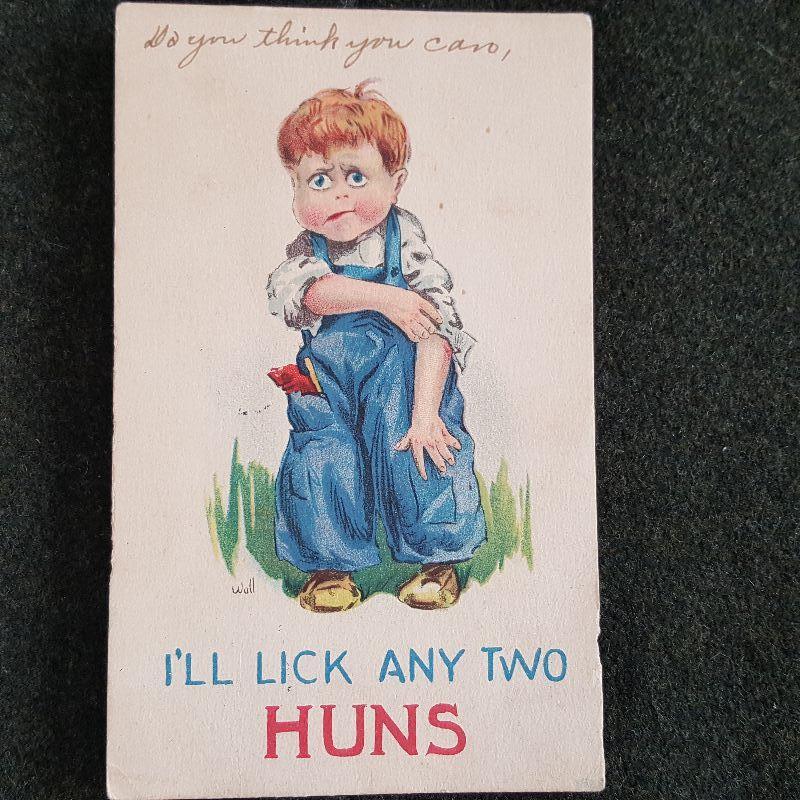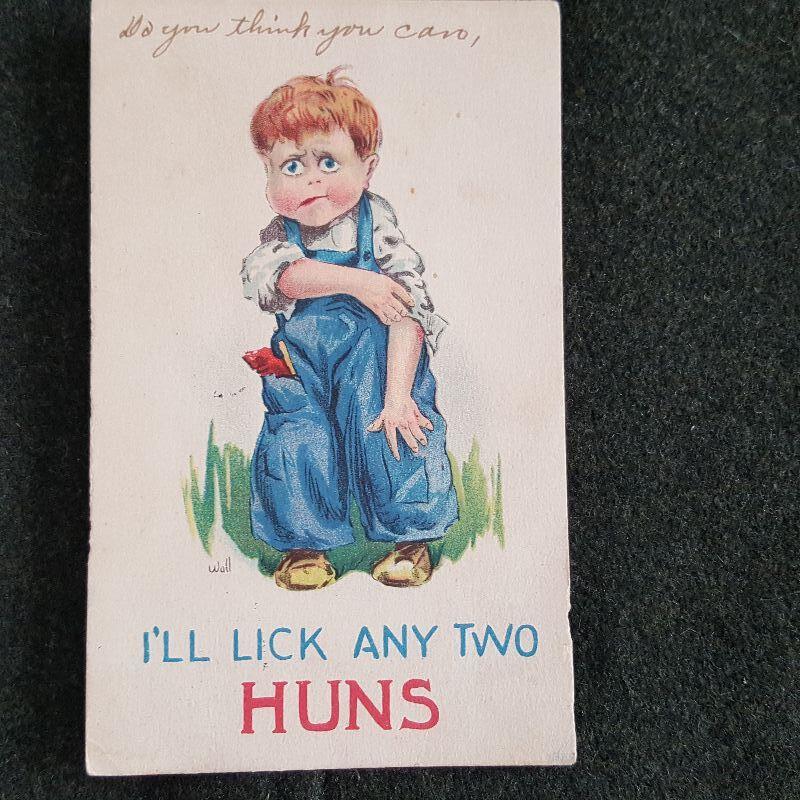 This auction lot is for an unusual and humorous WWI Military Defense Postcard. I'll Lick Any Two Huns. The original sender wrote on the front saying: Do you think you can. Postmarked Baltimore 1918 - original stamp is missing. Great graphics, perfect for framing.