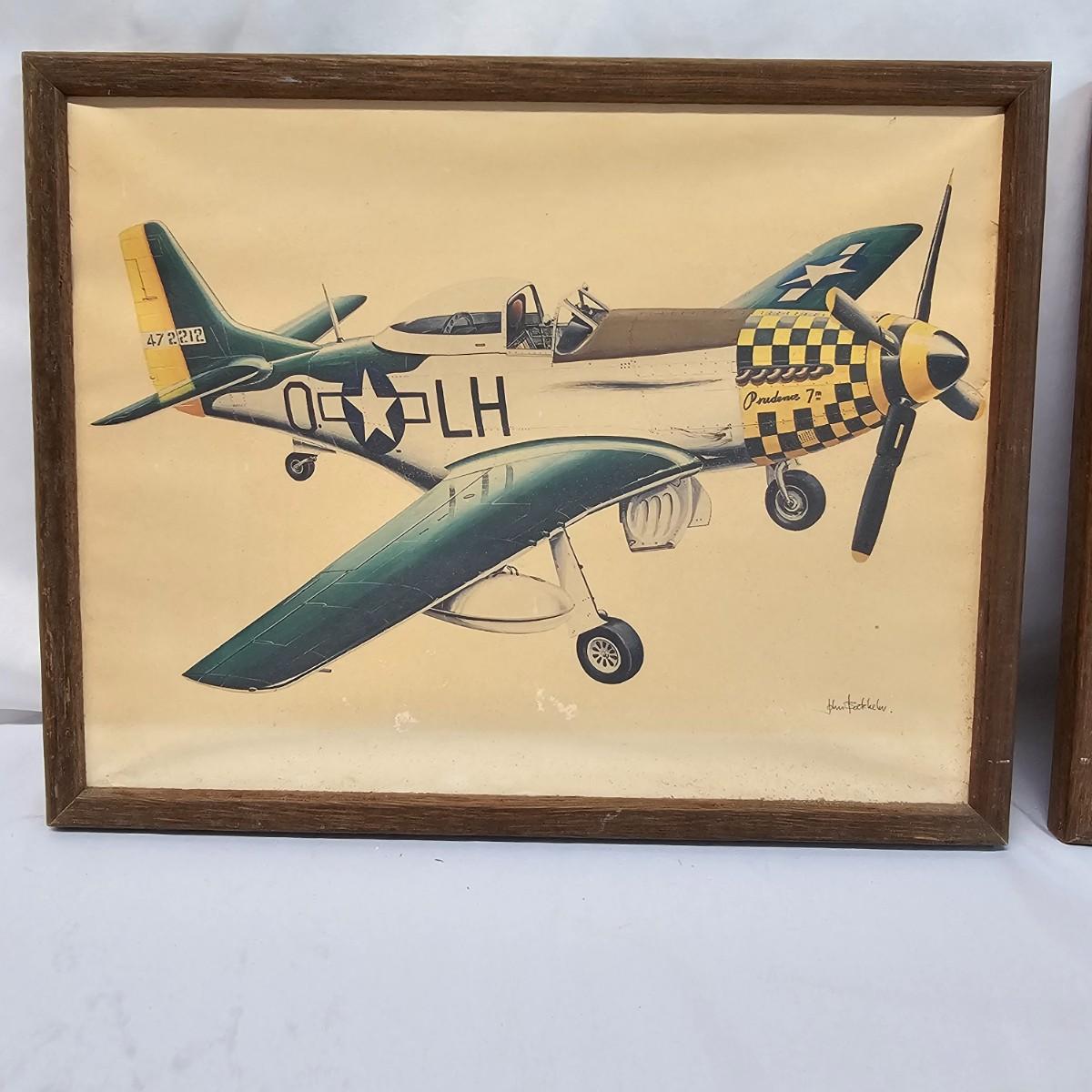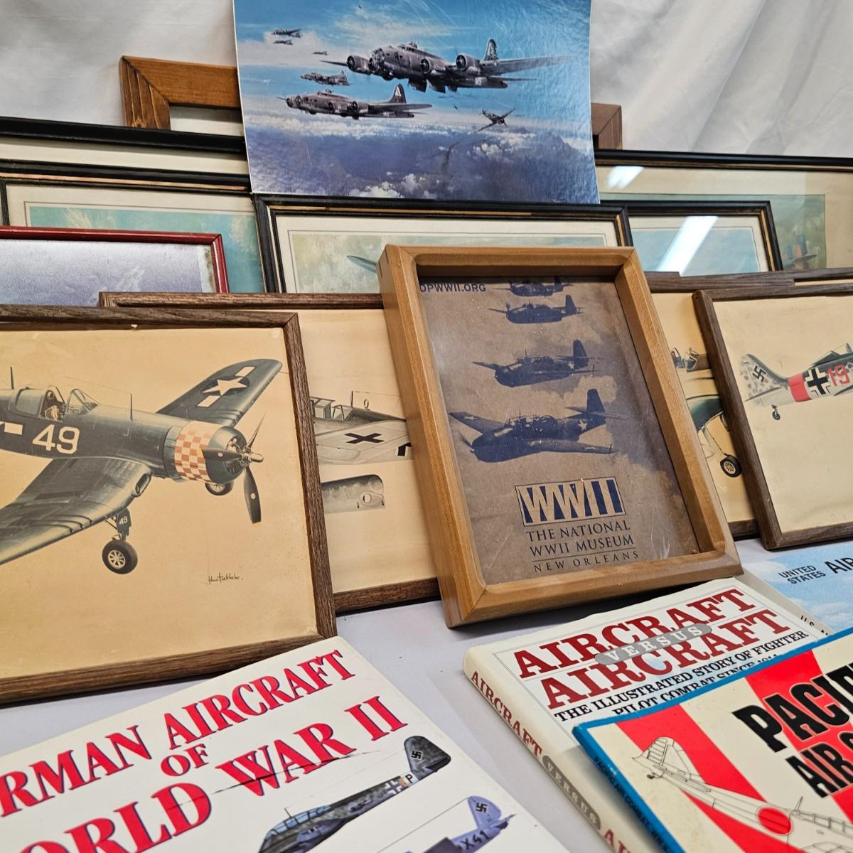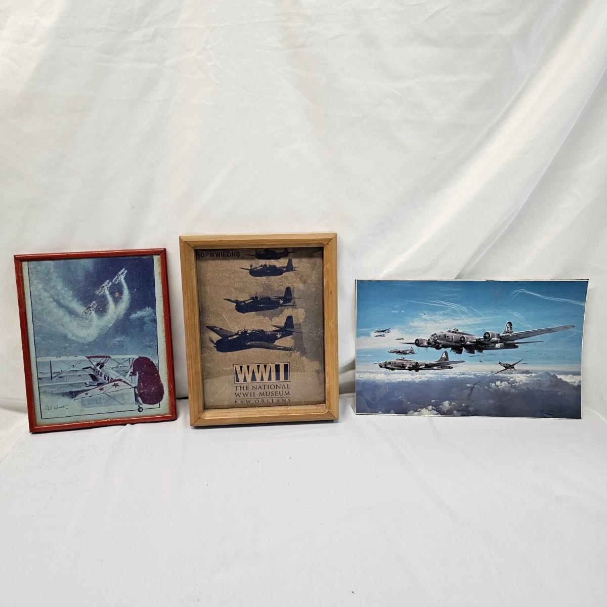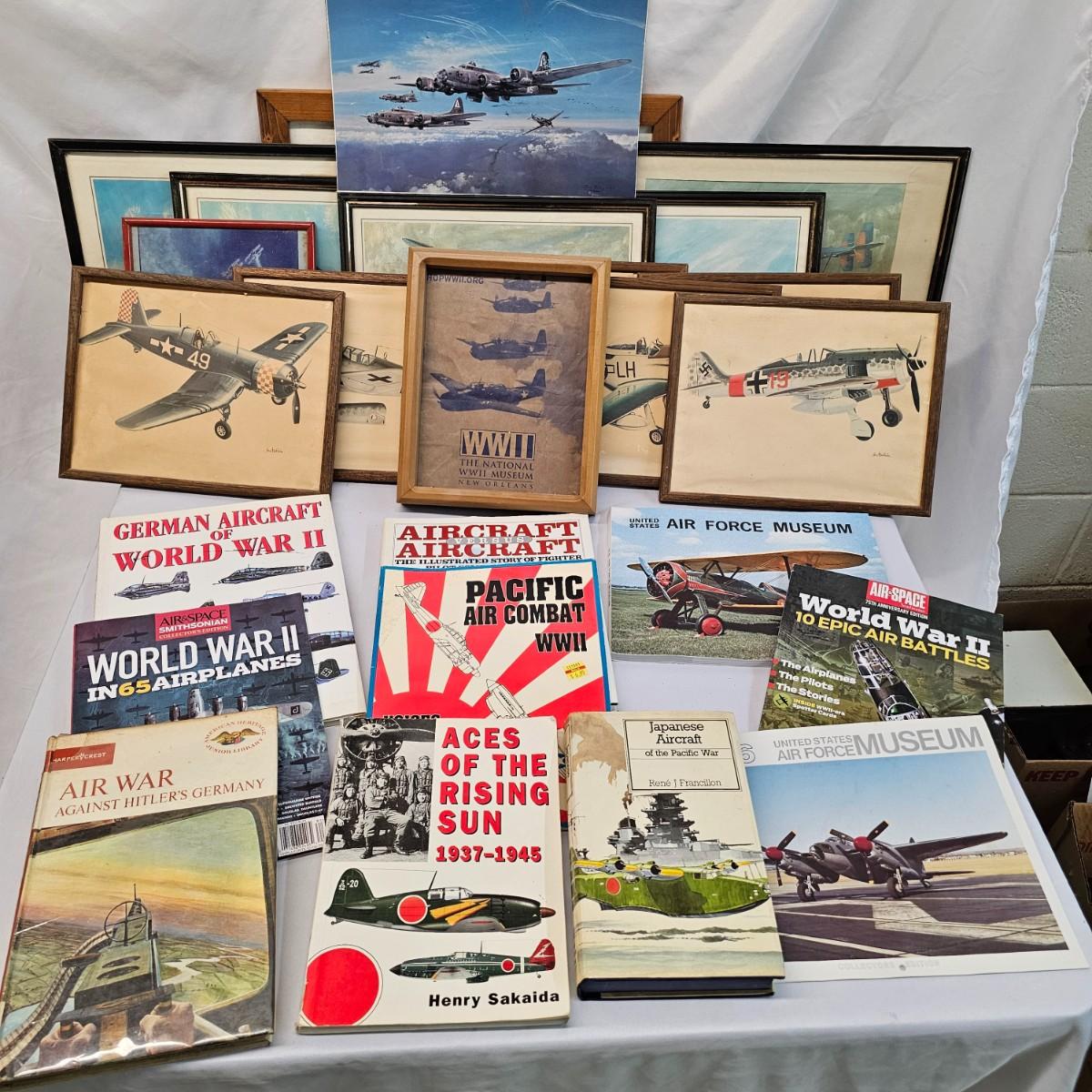 Pictures and stories of the aircrafts and their pilots that fought in World War II. Information about the Allied and German/Japanese flyers plus the equipment they used. Largest print measures 18.5" x 13.5", others are 9.5" x 11.5", 16" x 12" and other. Smaller wooden frame prints have no glass, just prints. 15 prints total. See photos for details. Local pickup only.