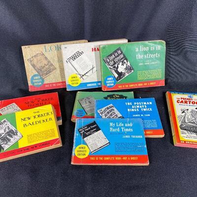 Vintage WWII Armed Services edition pocket books. 8 pocket size complete books and a joke book. Some wear and pages are brittle but in fair shape for age.
