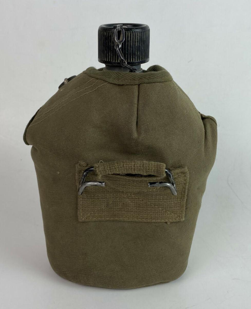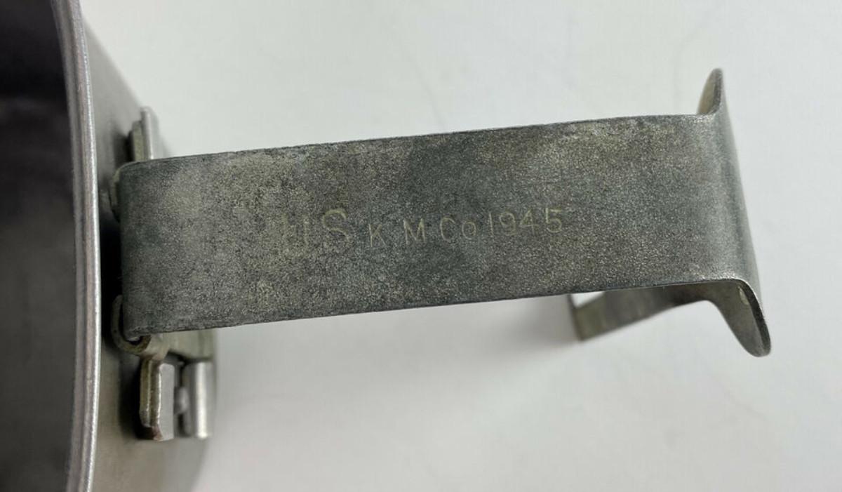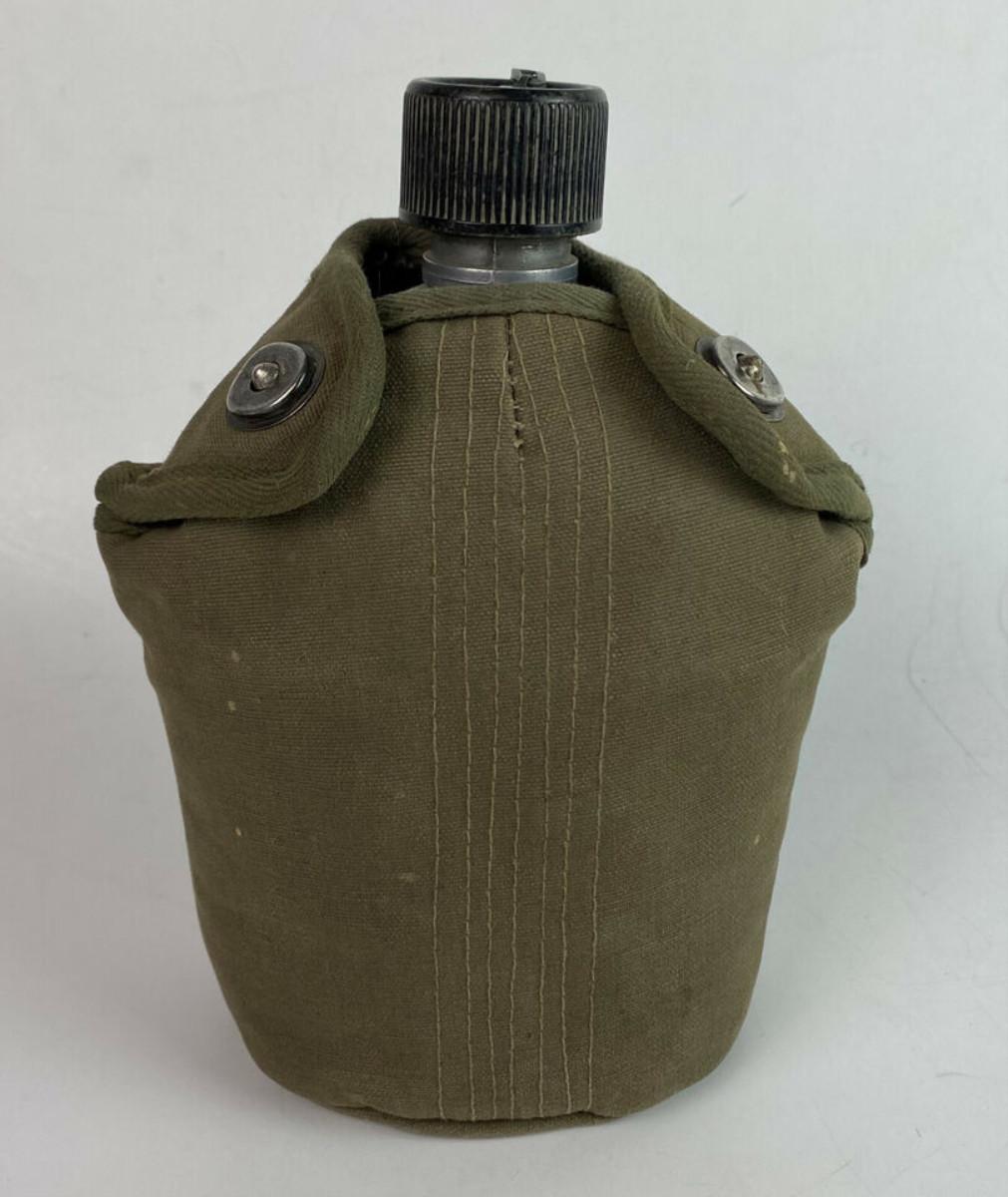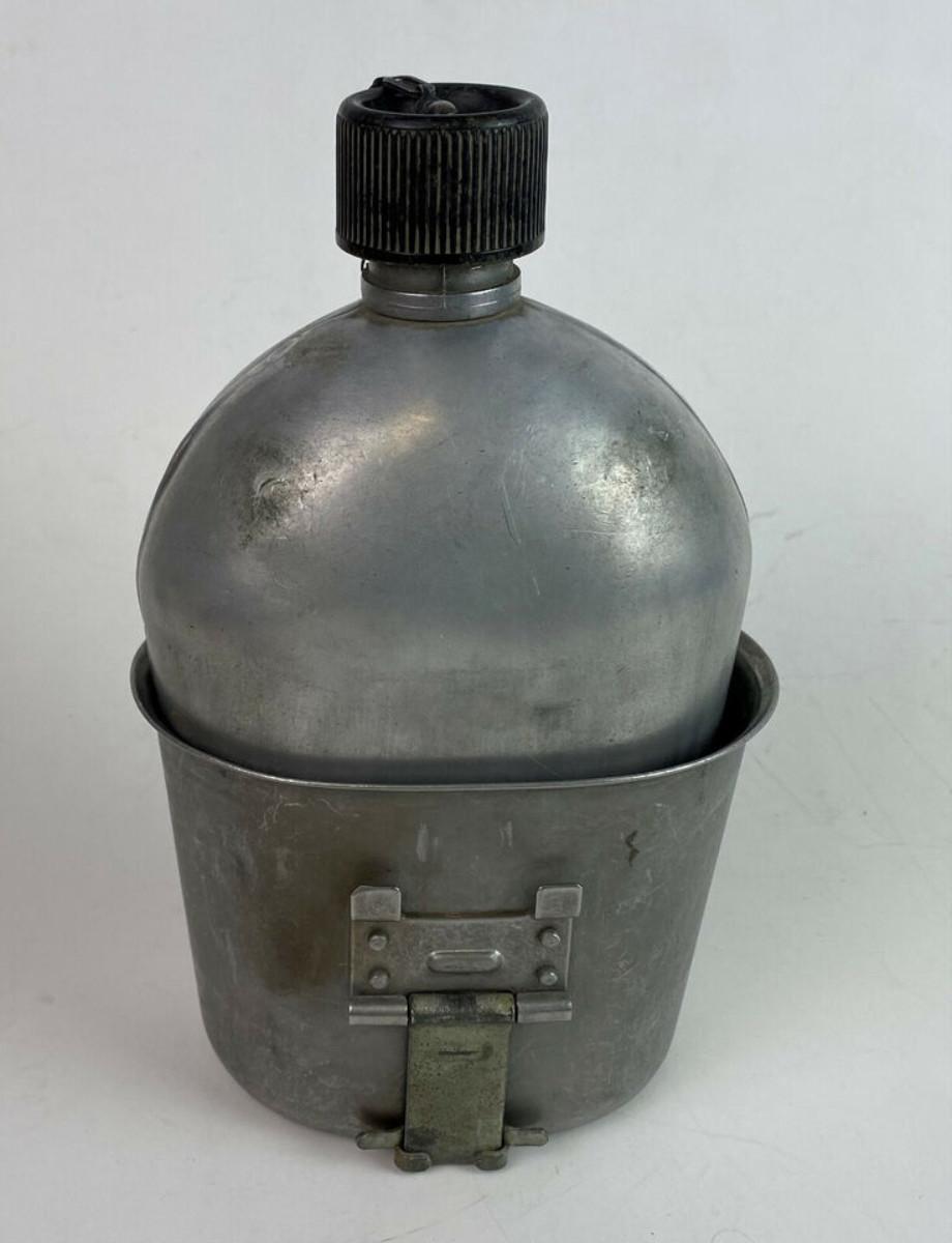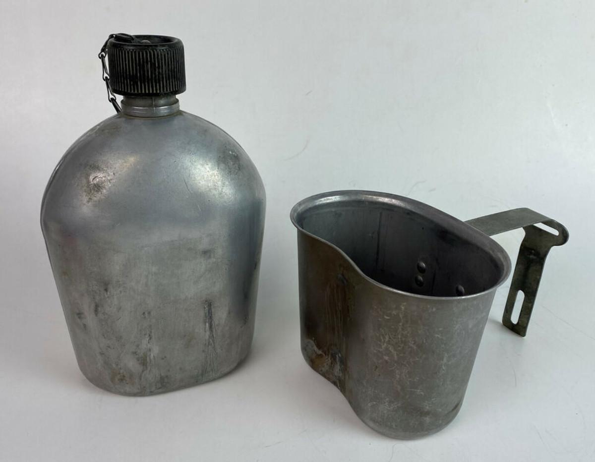 WWII and Cold War vintage on this original issue U.S. Army Canteen, cup and cover...Normal use on the canteen from MIRRO/1956 and the cup by K.M. Co./1945...the seam is loose on the back of the cloth cover where the belt hook is attached(pictured).