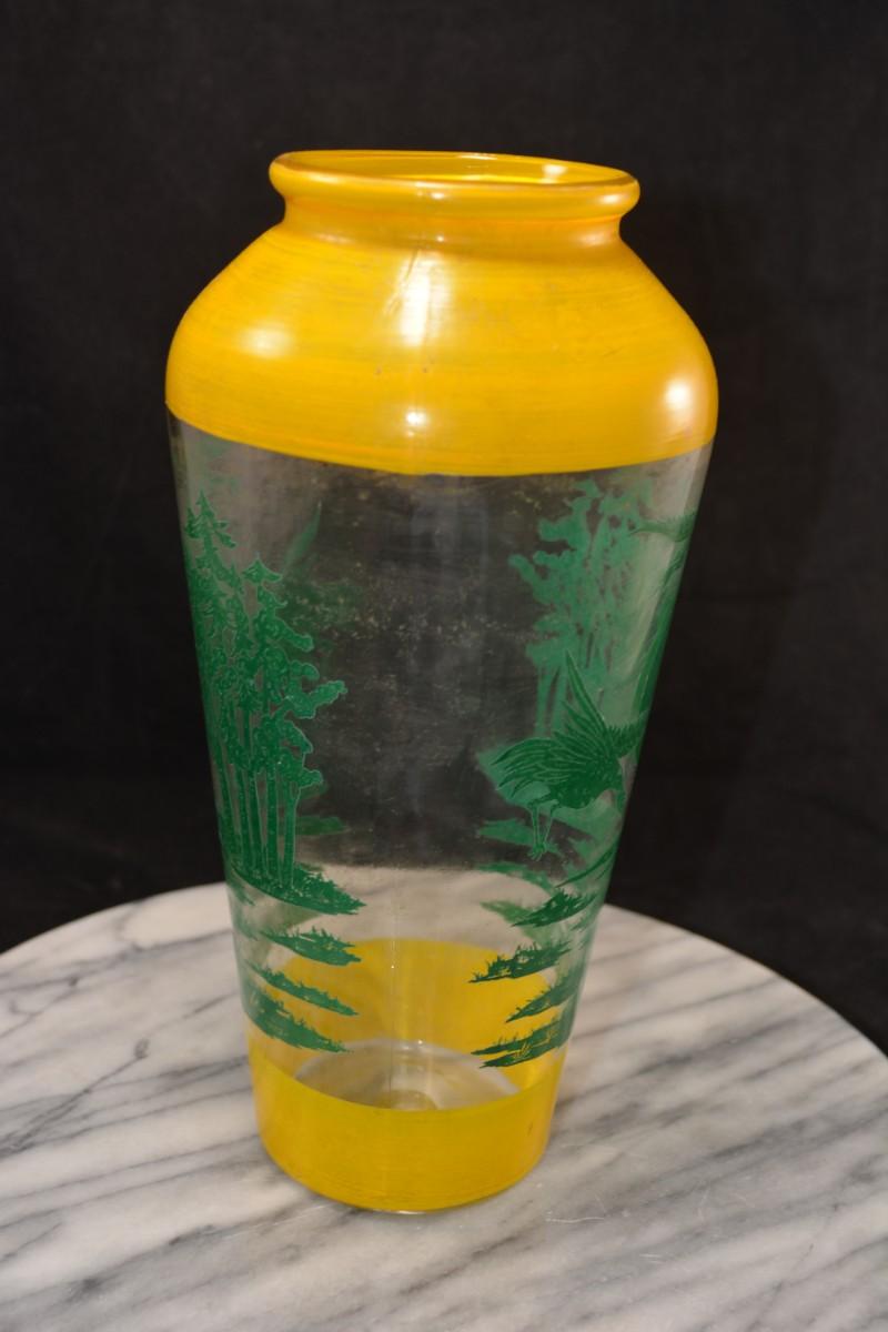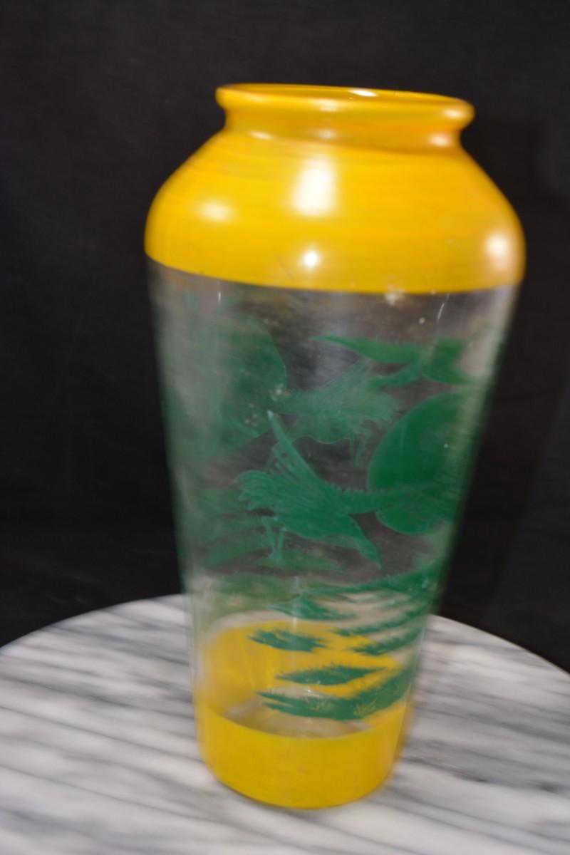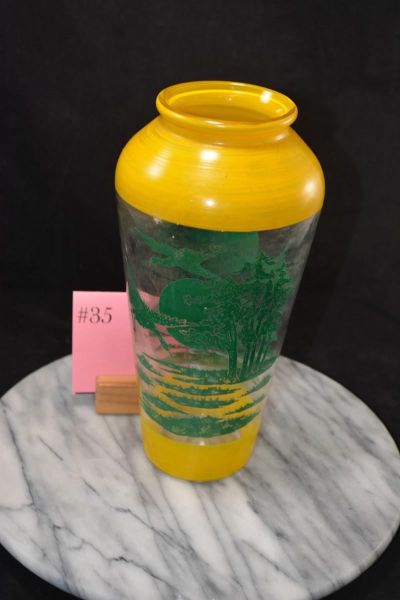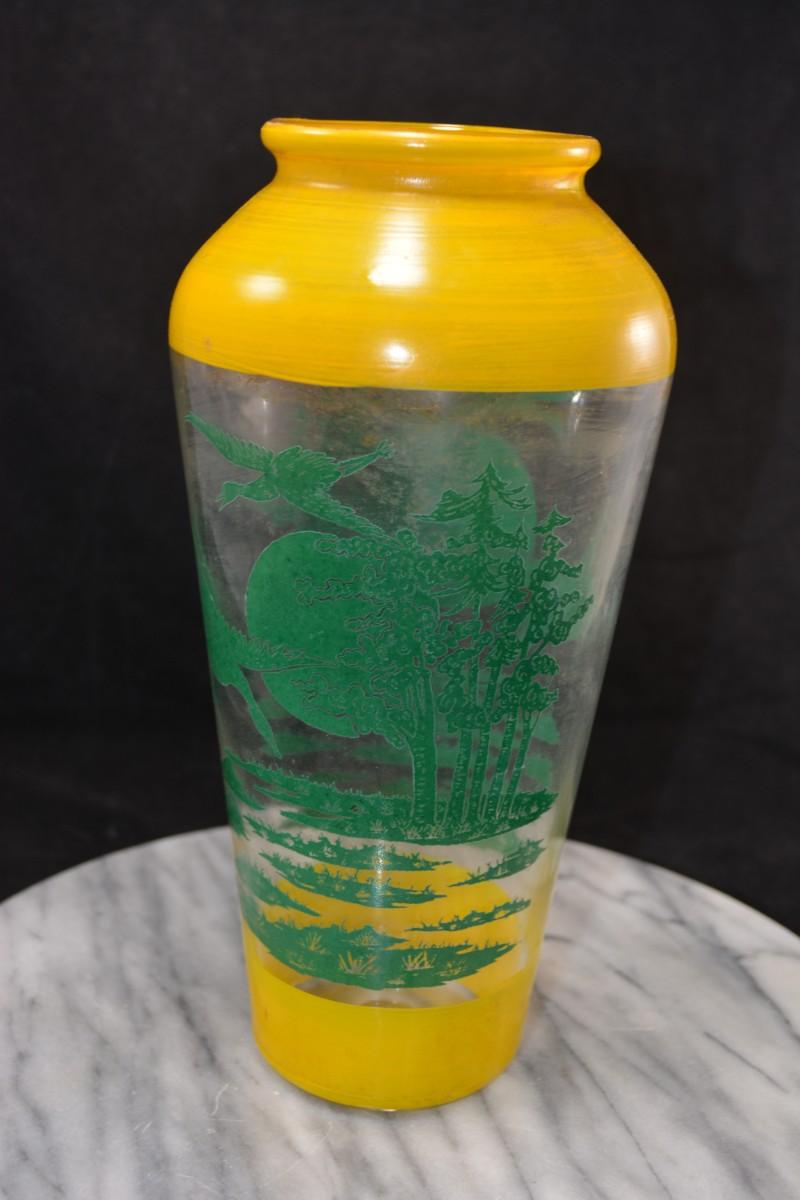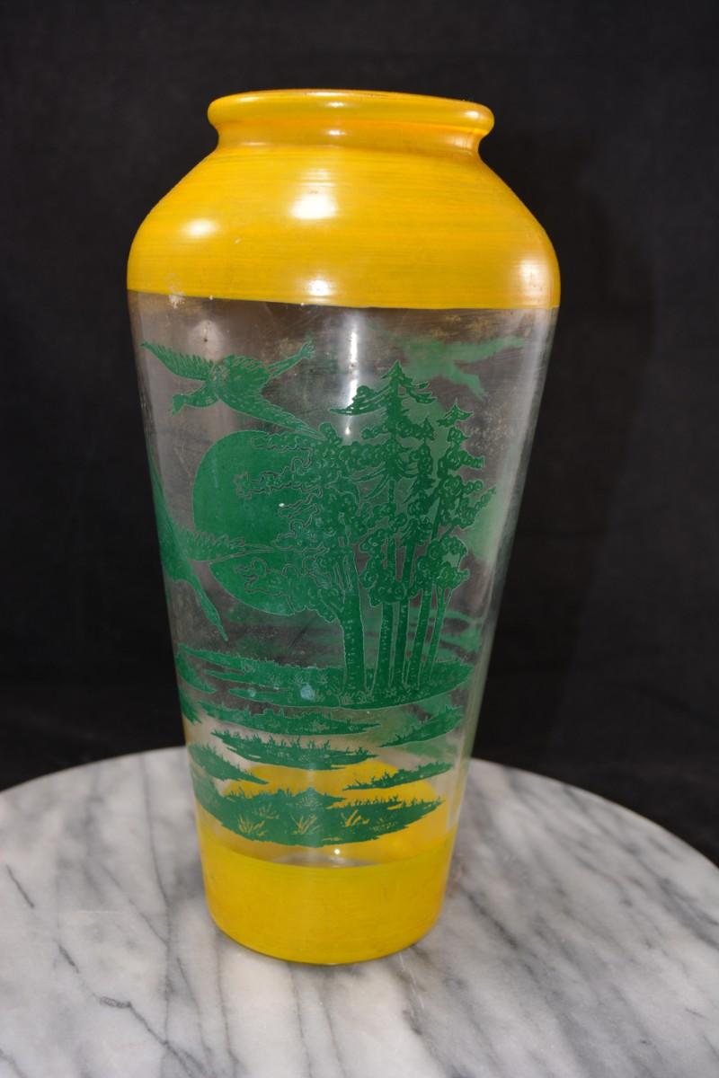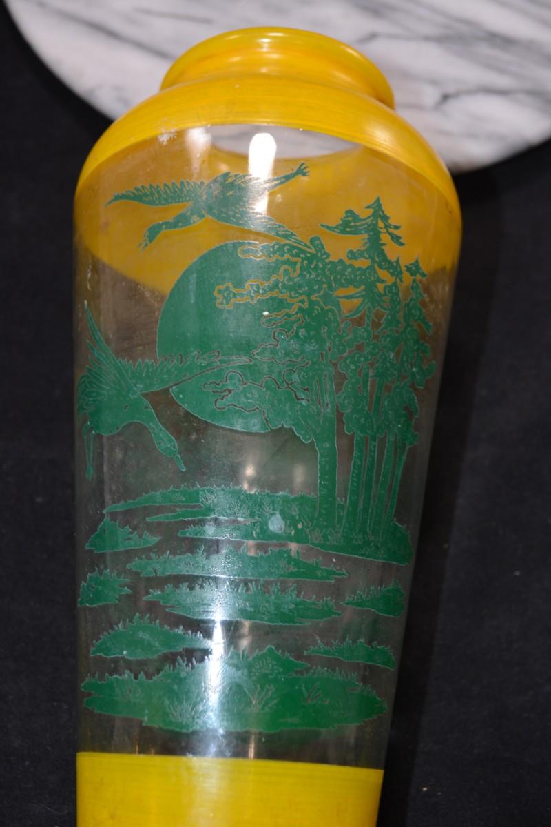 WWII Era Asian Glass Vase w/ Moon, Birds & Trees 10”