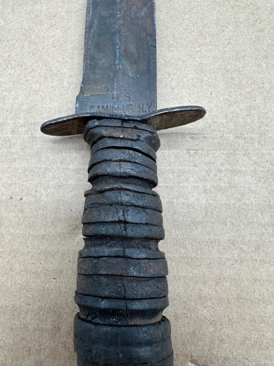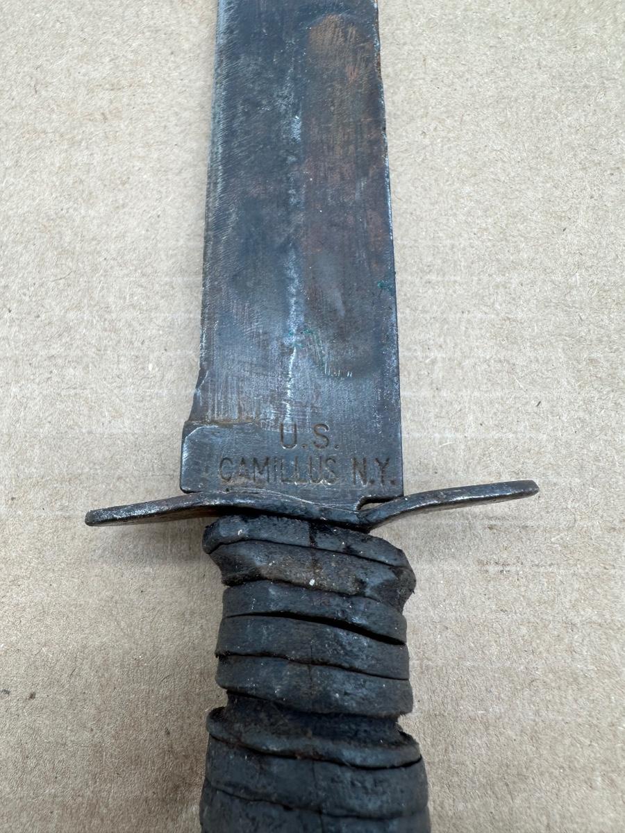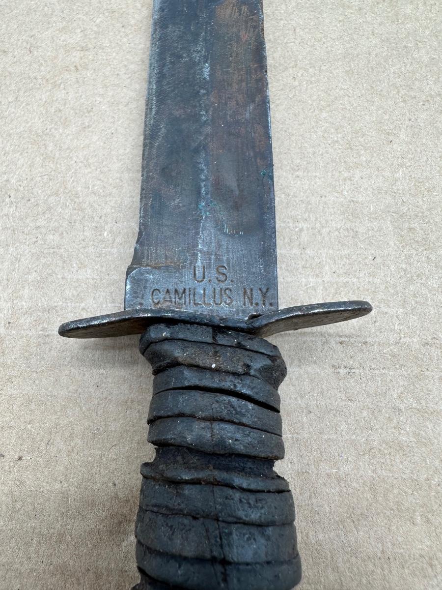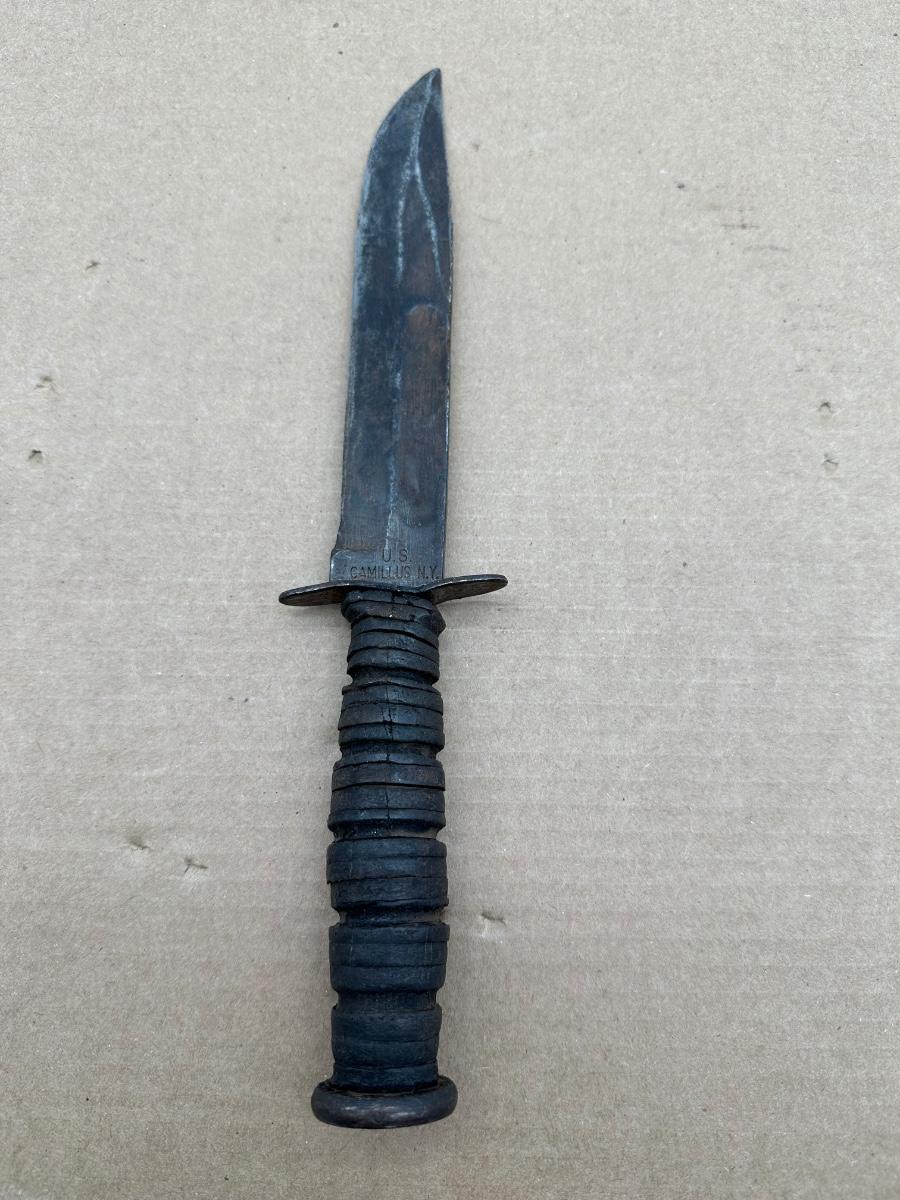 Original U.S. military–issued Camillus fixed blade knife, stamped “U.S. CAMILLUS N.Y.” at the ricasso. This knife is commonly associated with U.S. Navy service during the World War II era, and was also used by other branches prior to widespread KA-BAR adoption.