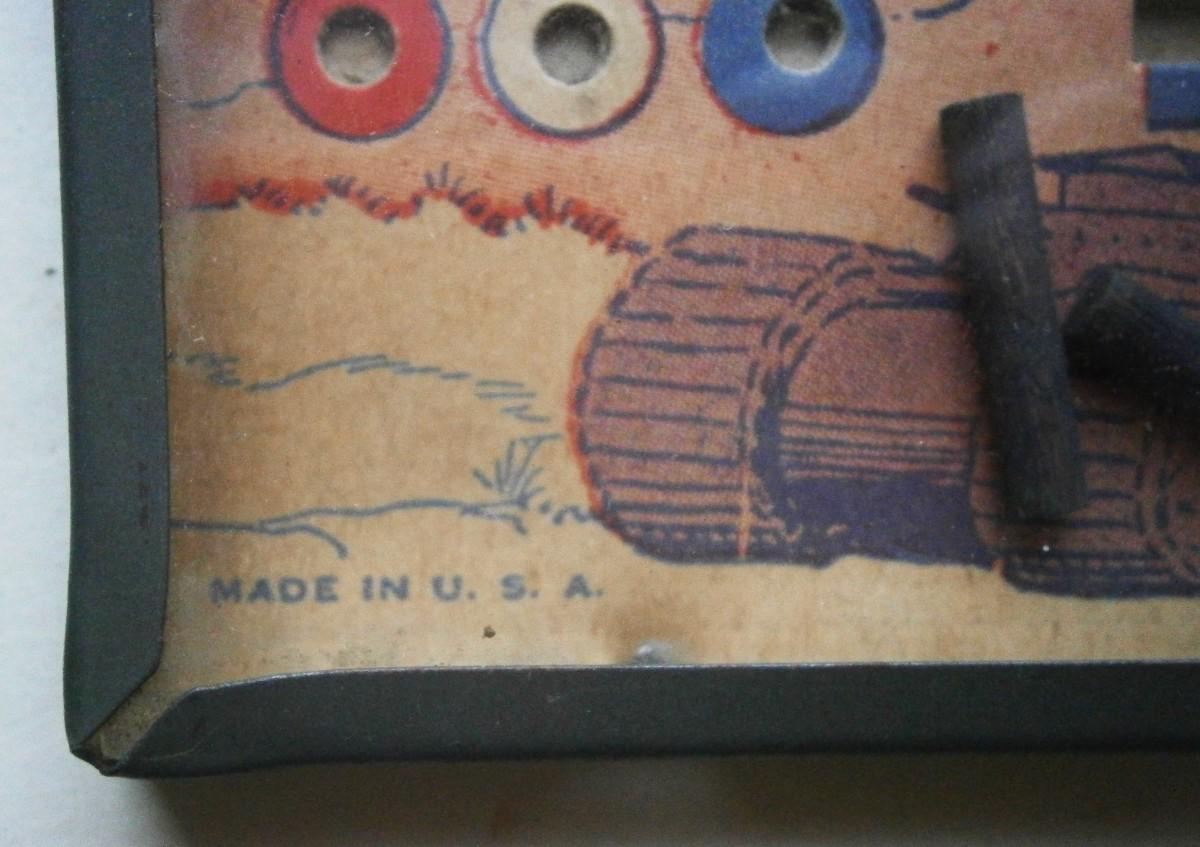 WWII Era "V" Victory Dexterity Puzzle depicting battlefield with tanks and American & English Flags, 5 x 3 1/2 in. in metal frame with cardboard image and glass front, wood and steel bearings tend to stick due to background being slightly warped, great Patriotic imagery.
