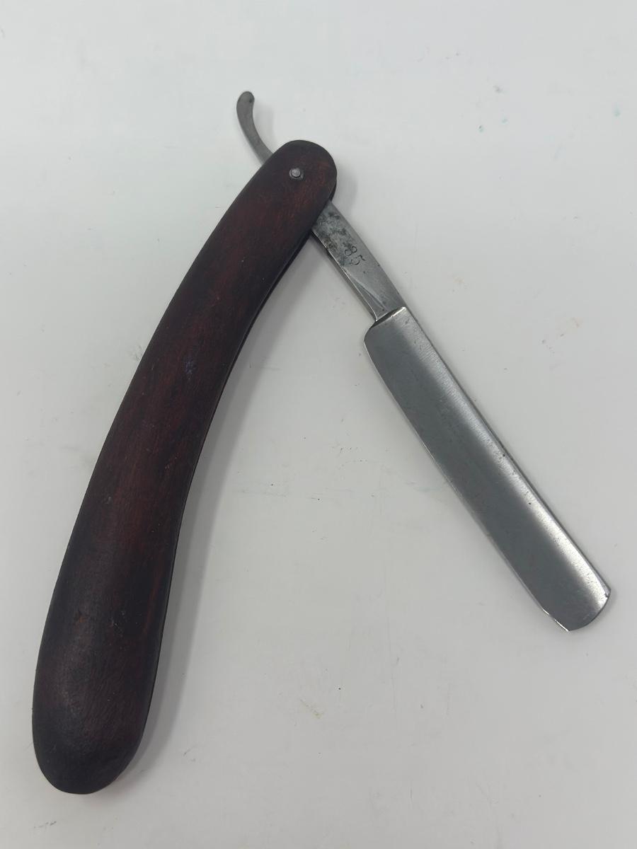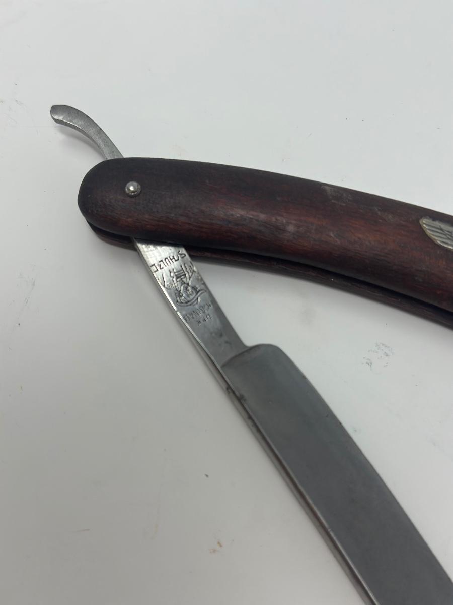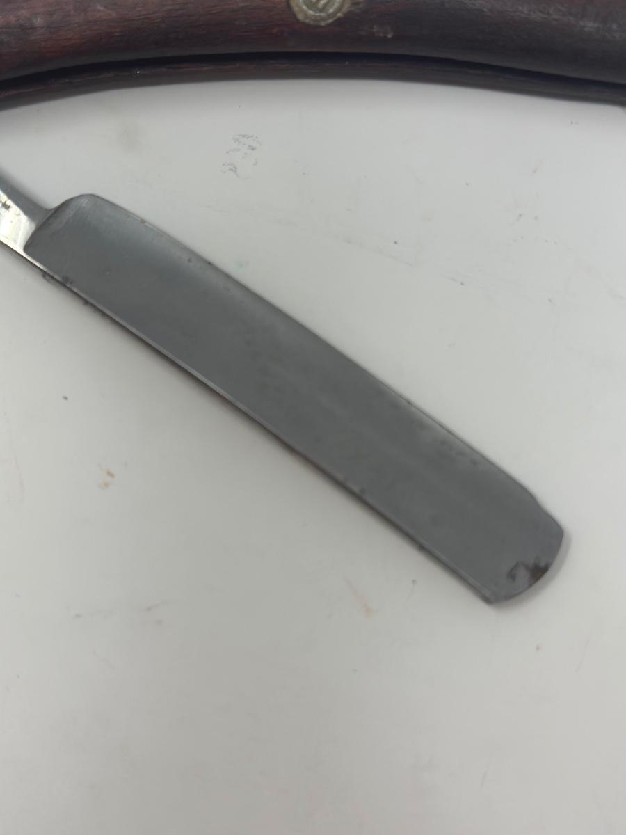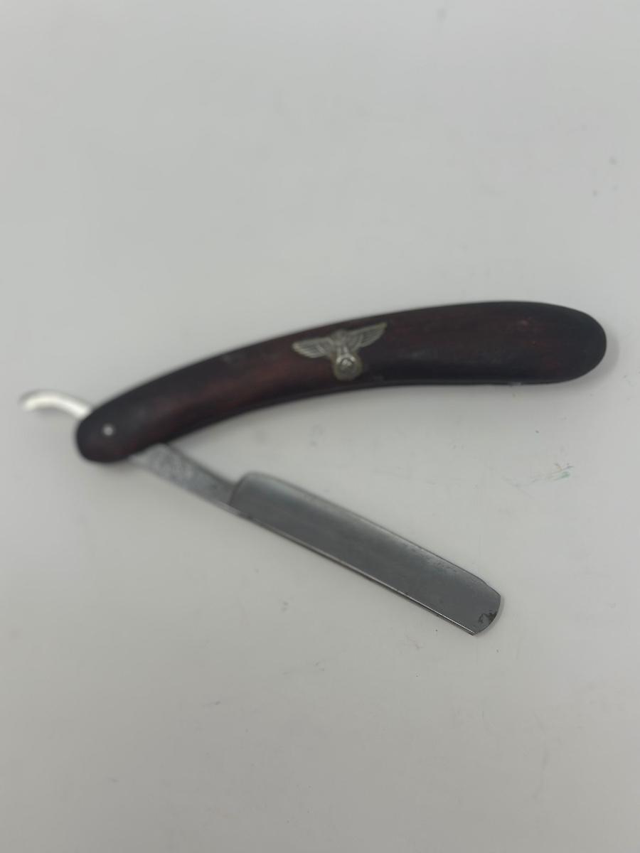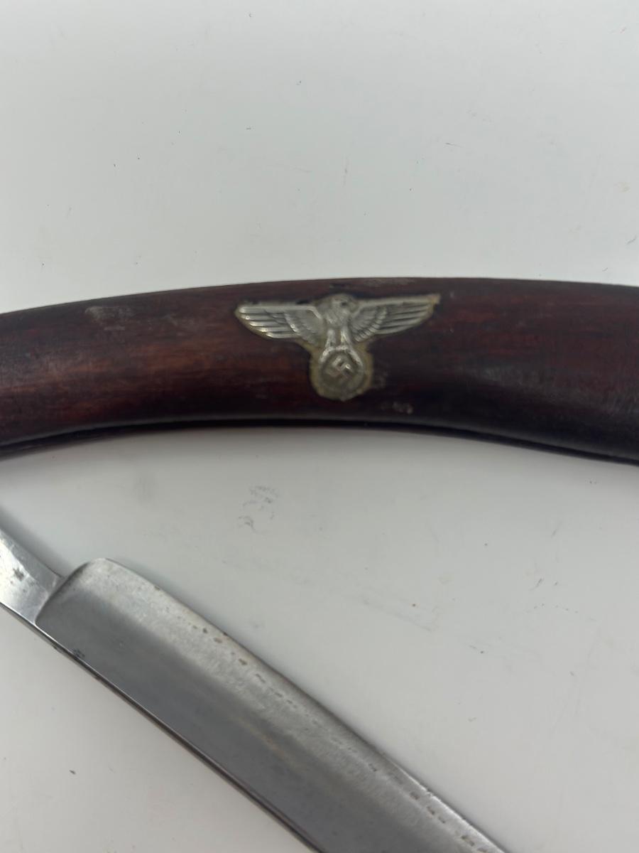 In excellent condition, this vintage WWII NSDAP straight razor features a wood handle with a metal eagle and swastika emblem attached.