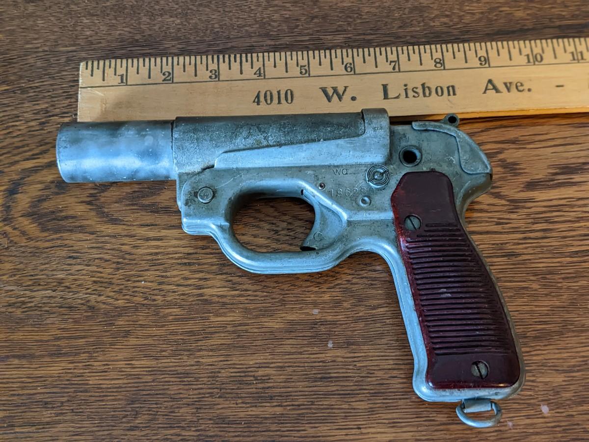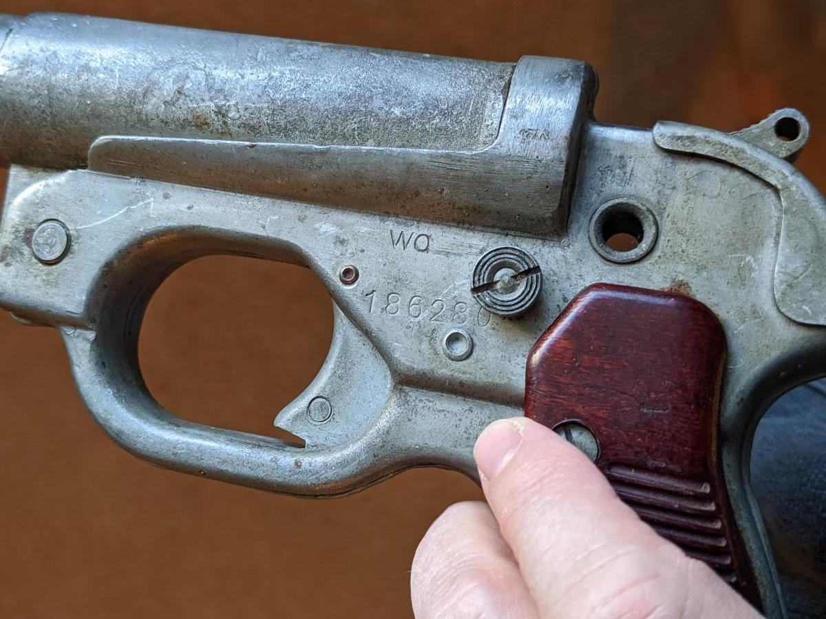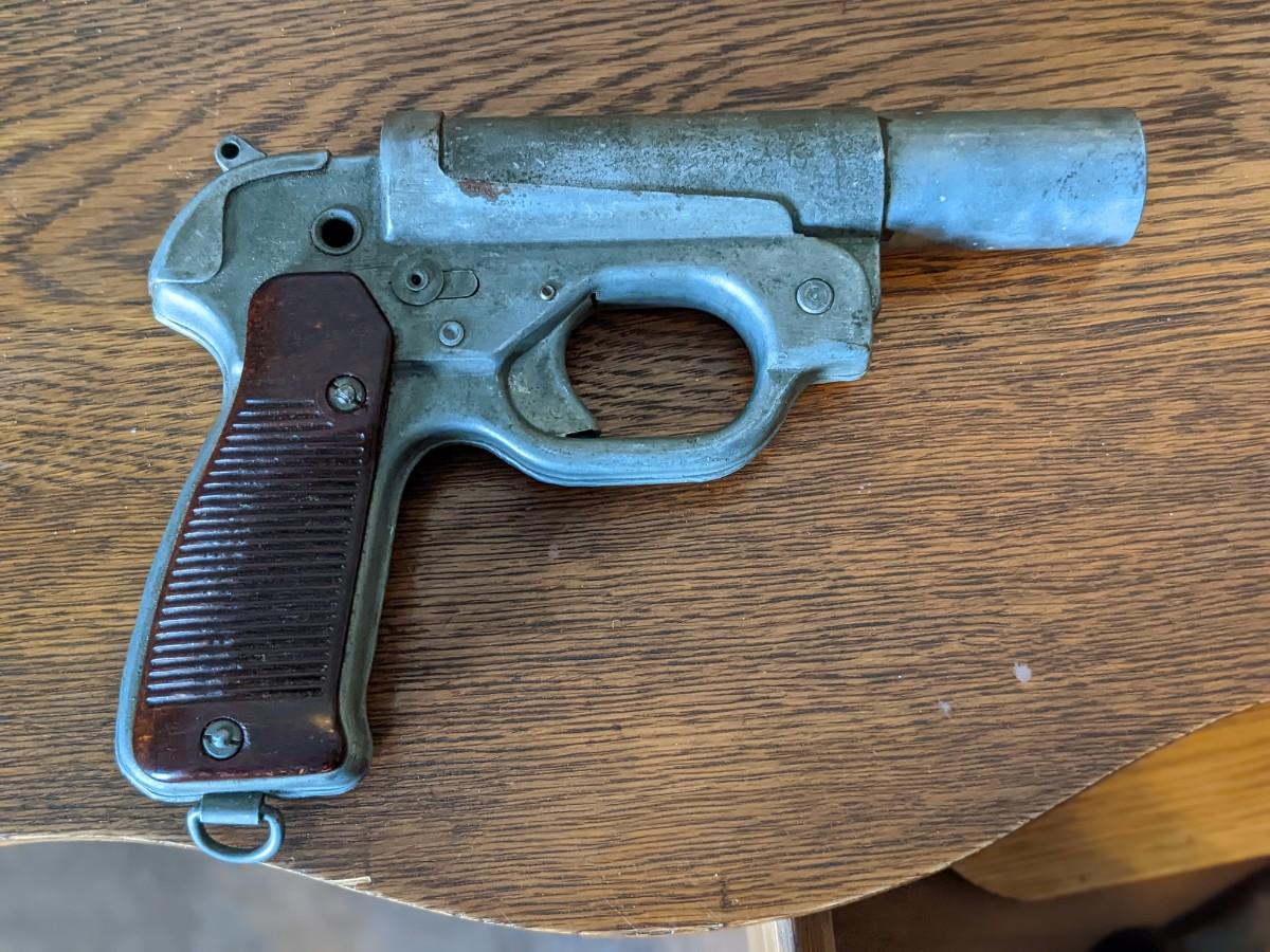 German Wehrmacht LP-42 signal flare pistol that entered service in 1943. Leuchtpistol 42 is steel construction, 26.5 mm, and bears original German maker code; wa,which stands for Hasag, Hugo Schneider AG, Abteilung Lampenfabrik, Leipzig.
