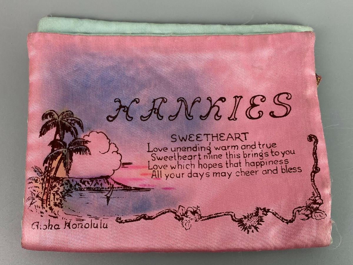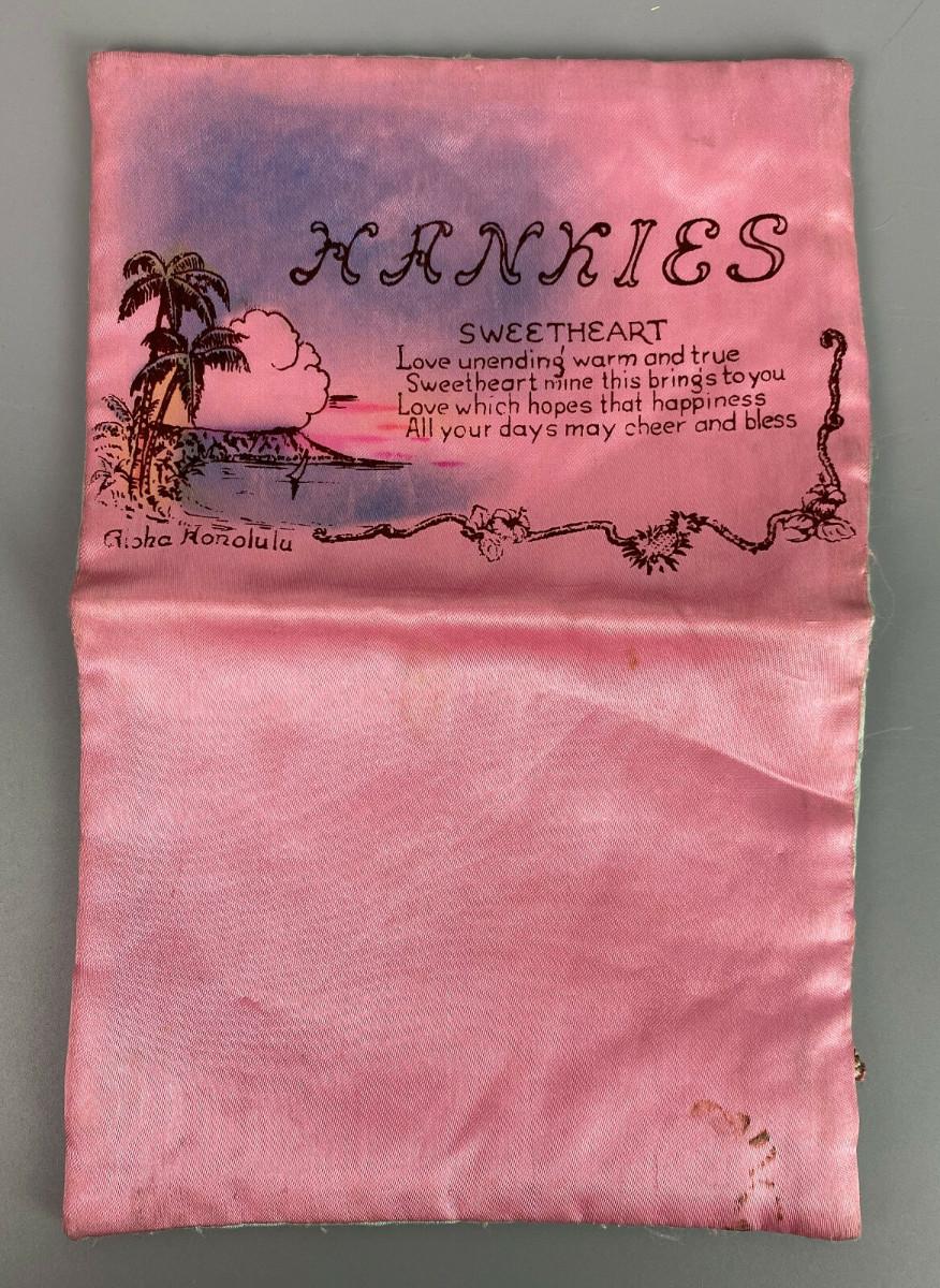 souvenir of the Hawaiian Islands from the Second War...for a soldier or sailors sweetheart..a 10 1/2" x 7" satin hankie cachet with an imprint...Light soiling on one corner on back.