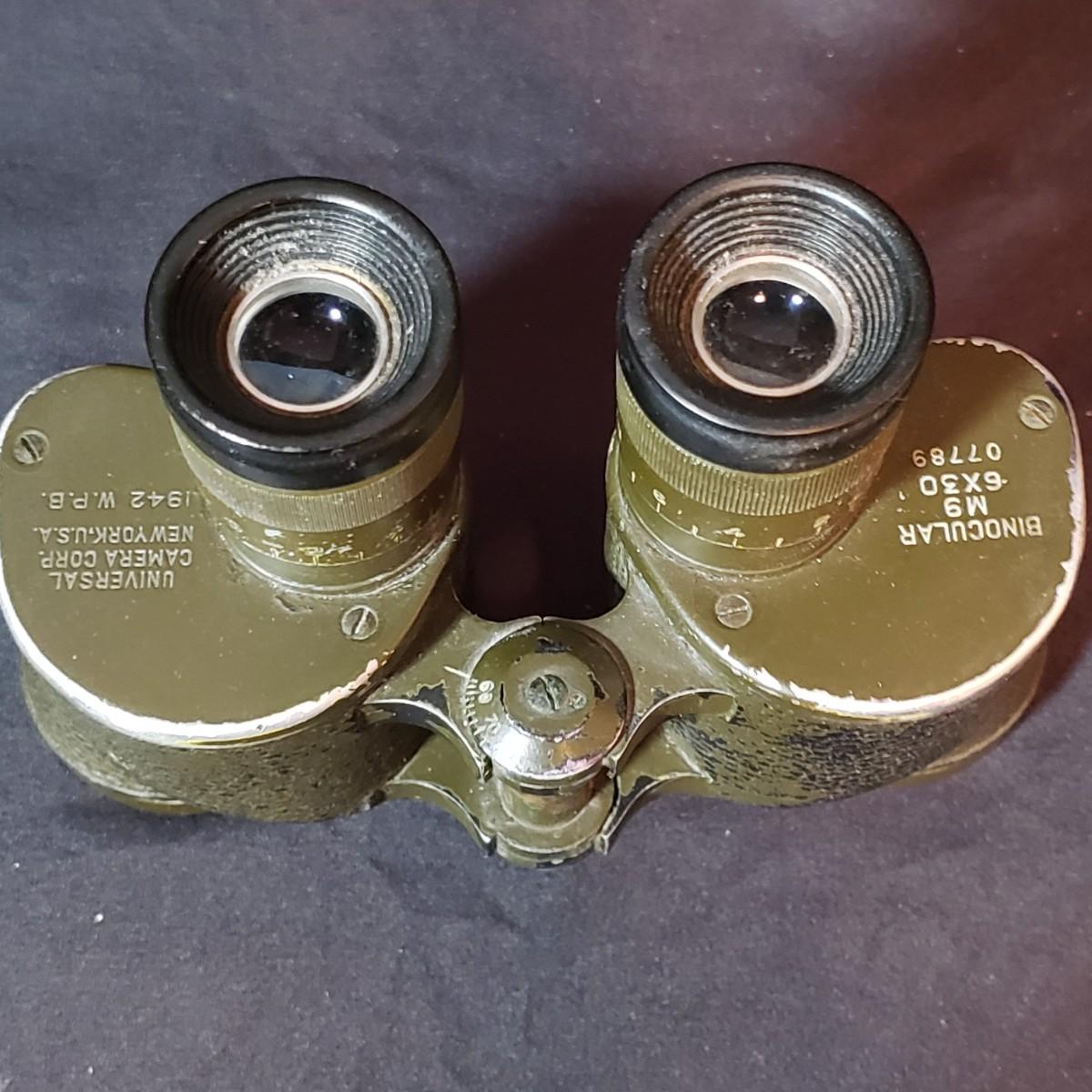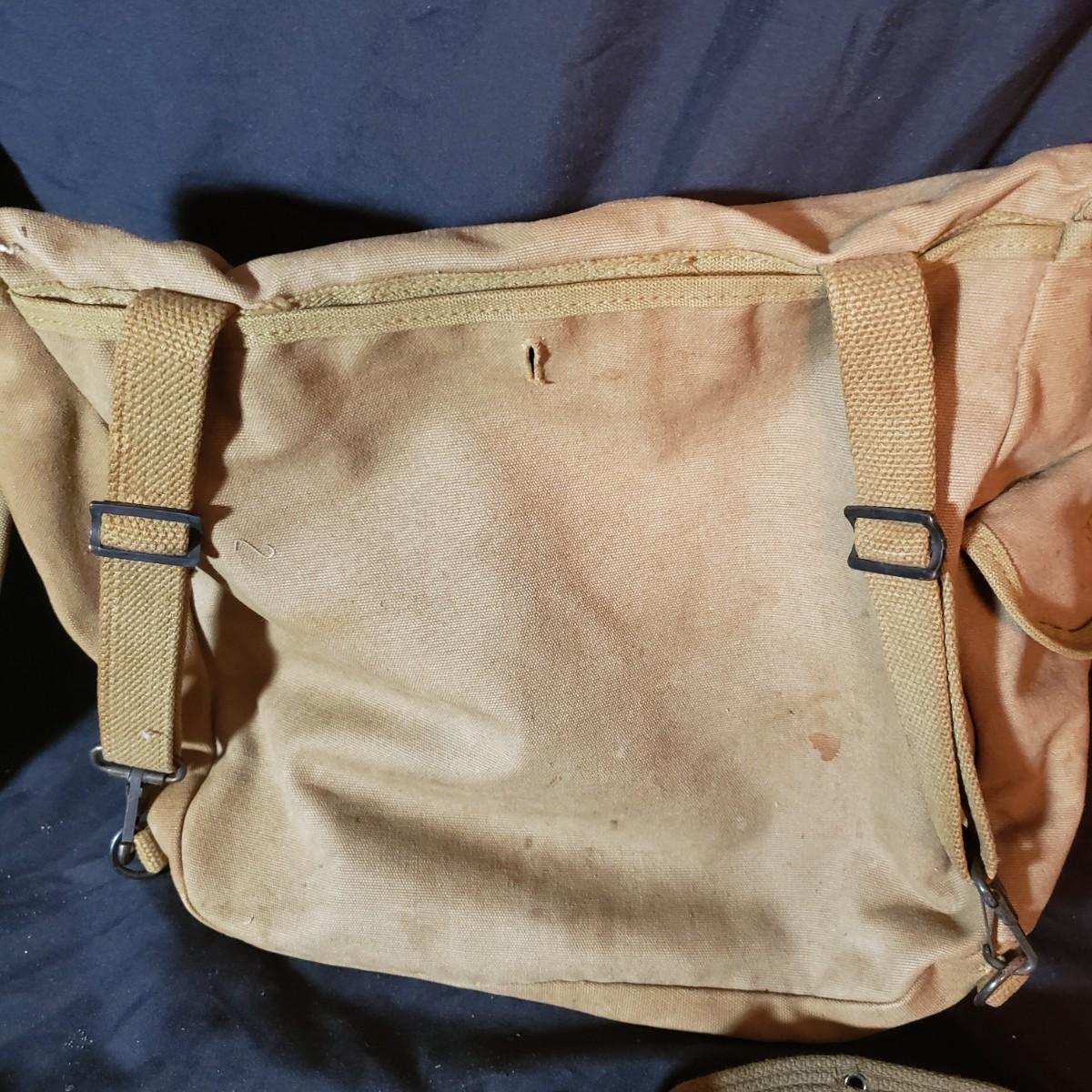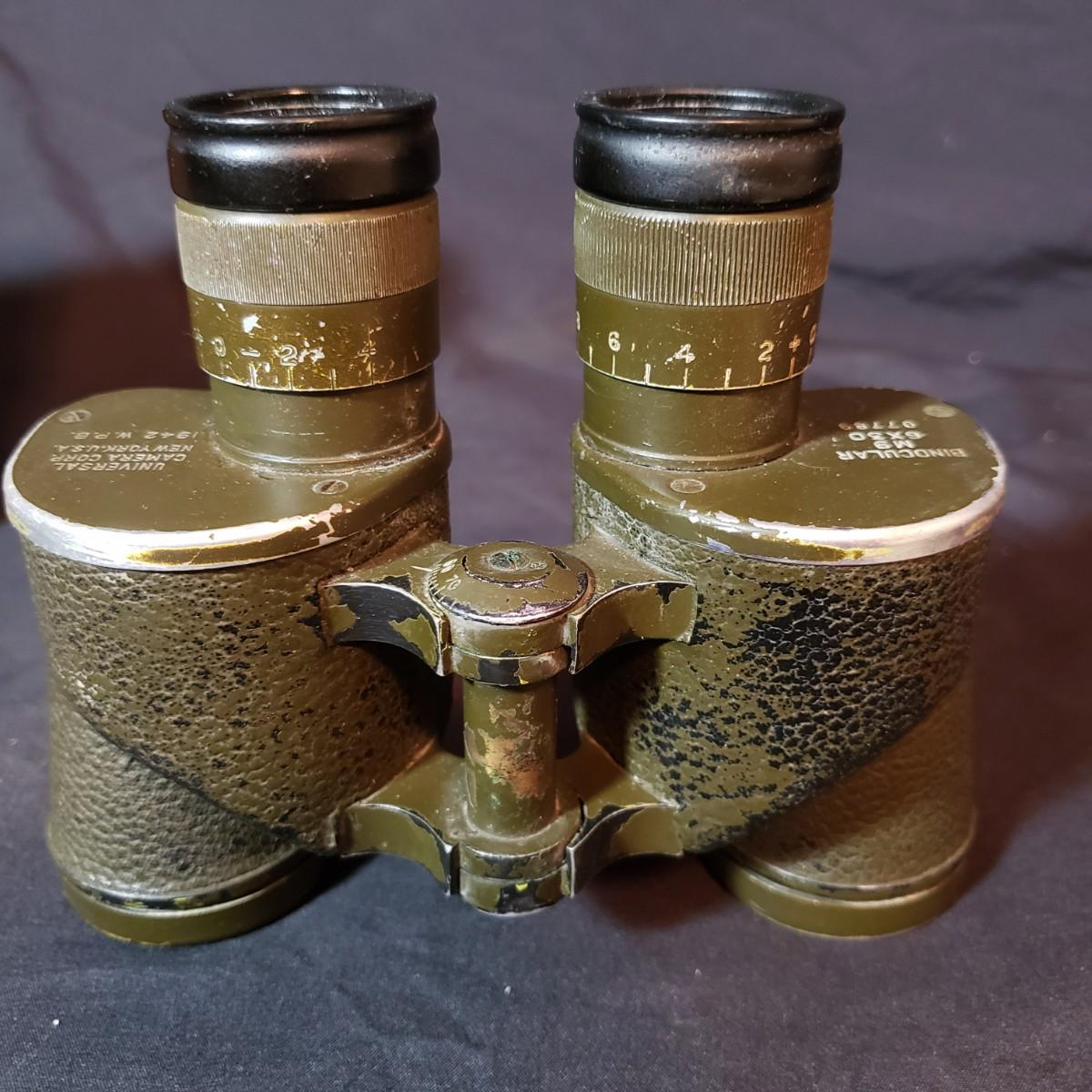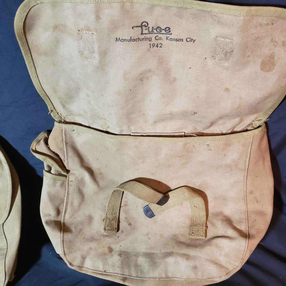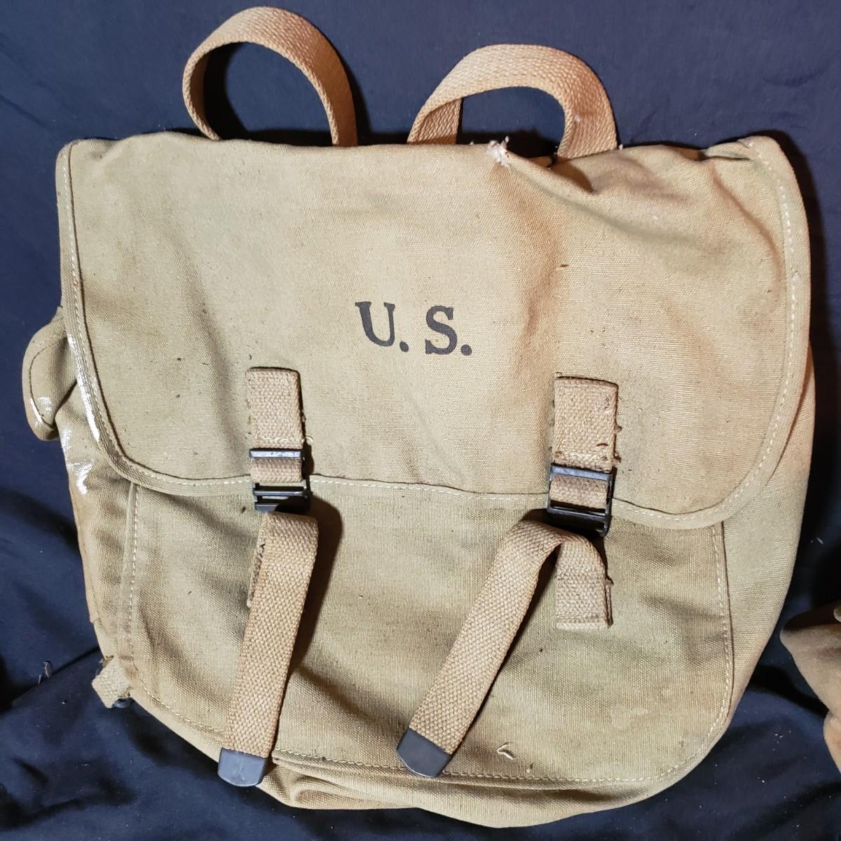 Various items that appear to be WWII military pieces. The two similar musette bags are stamped, but the second one is hard to decipher. See pictures for details. They measure approximately 15" x 5" x 12"H. For their age these appear to be in good condition. The canteen cover is wool lined inside, and the belt still works. The binoculars are made by Universal Camera Corp. Stamped 1942. It comes with a leather carrying case, no strap, but a handle on top.