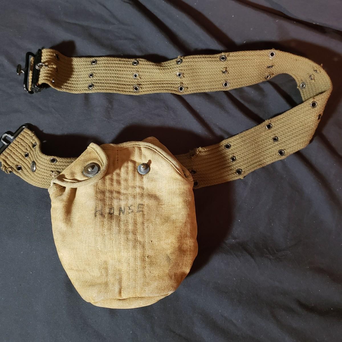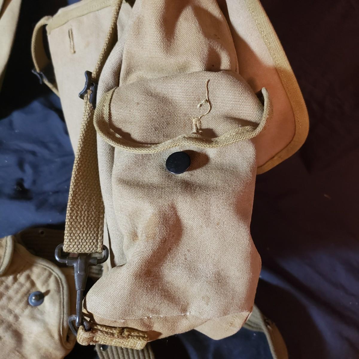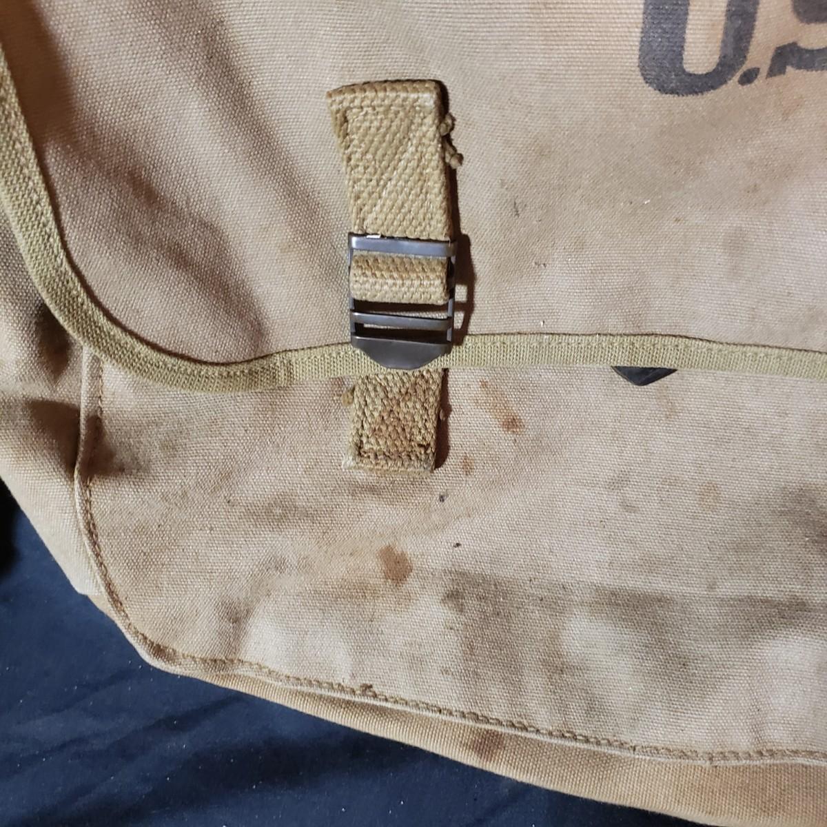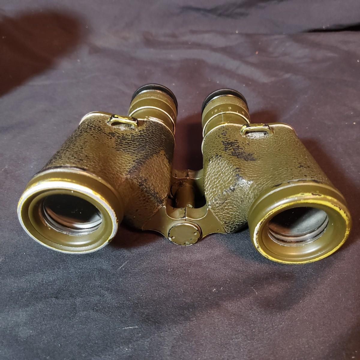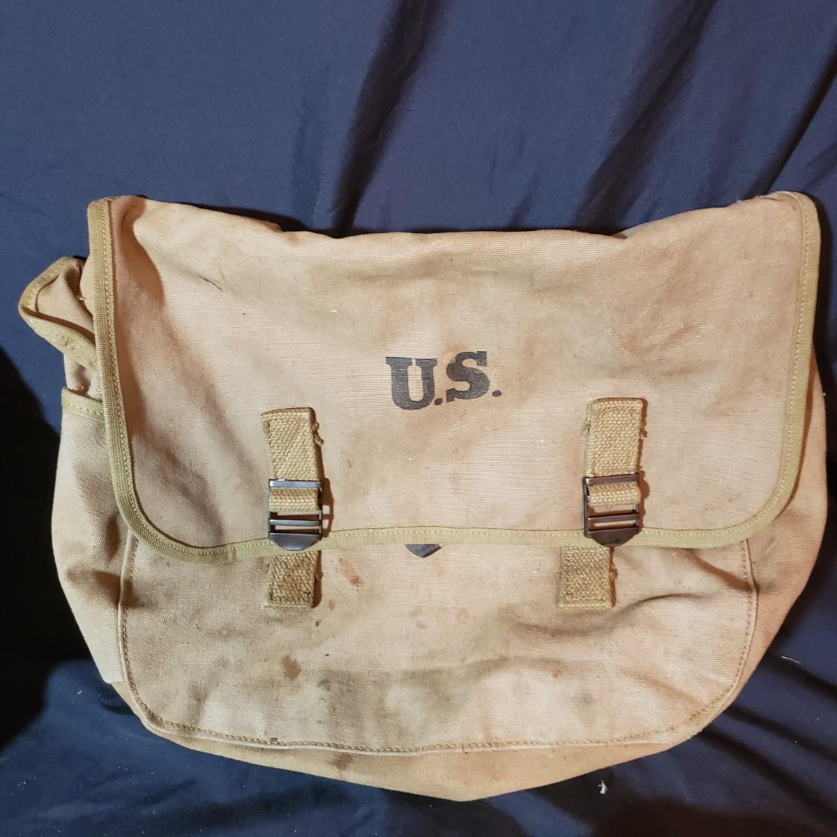 Various items that appear to be WWII military pieces. The two similar musette bags are stamped, but the second one is hard to decipher. See pictures for details. They measure approximately 15" x 5" x 12"H. For their age these appear to be in good condition. The canteen cover is wool lined inside, and the belt still works. The binoculars are made by Universal Camera Corp. Stamped 1942. It comes with a leather carrying case, no strap, but a handle on top.