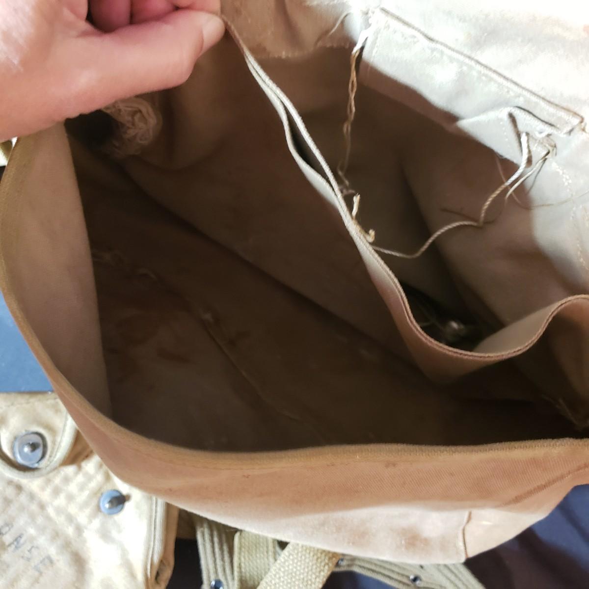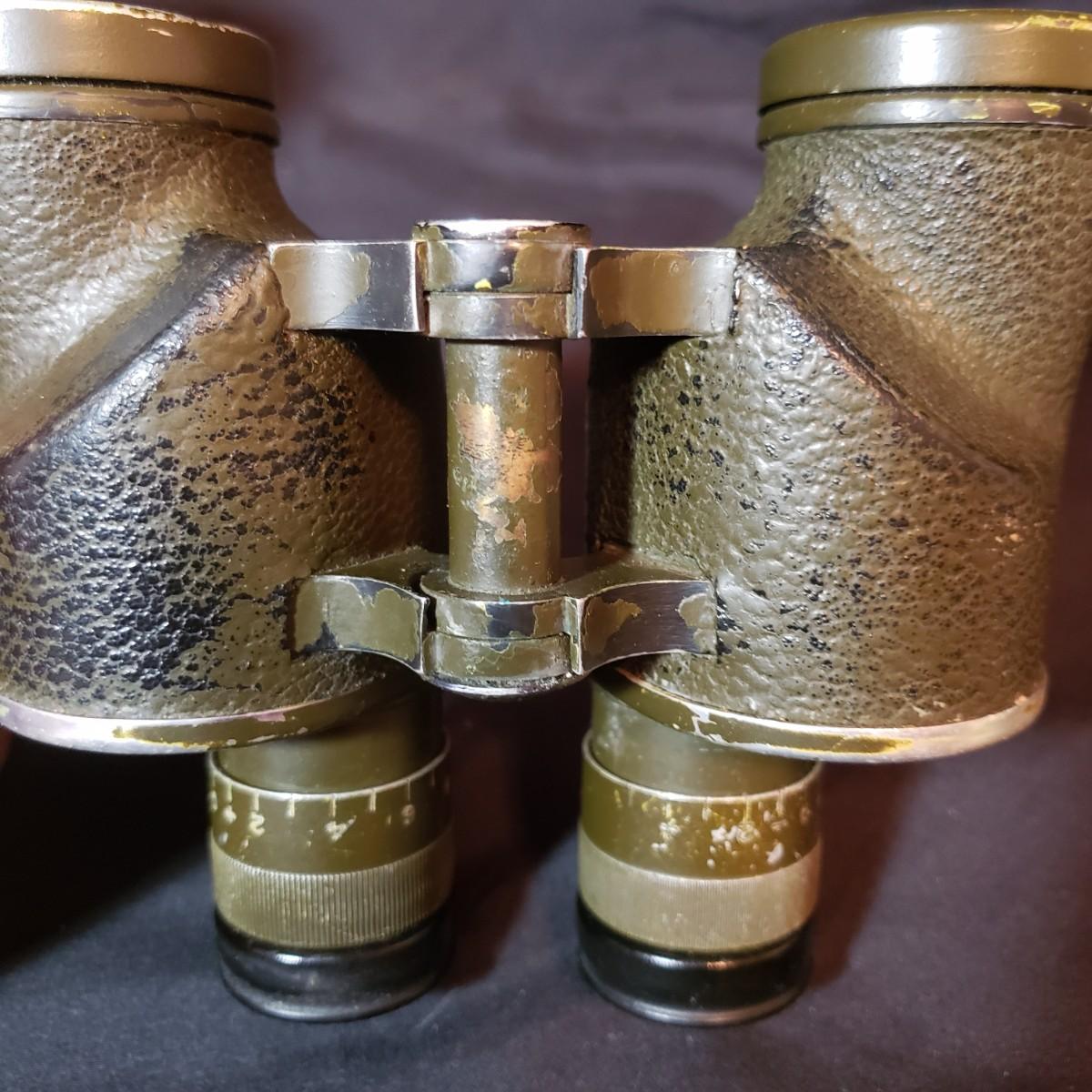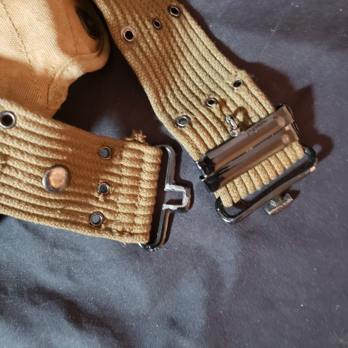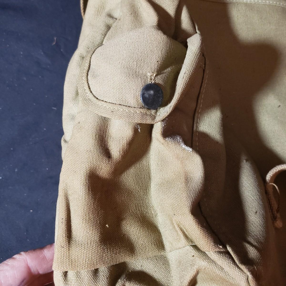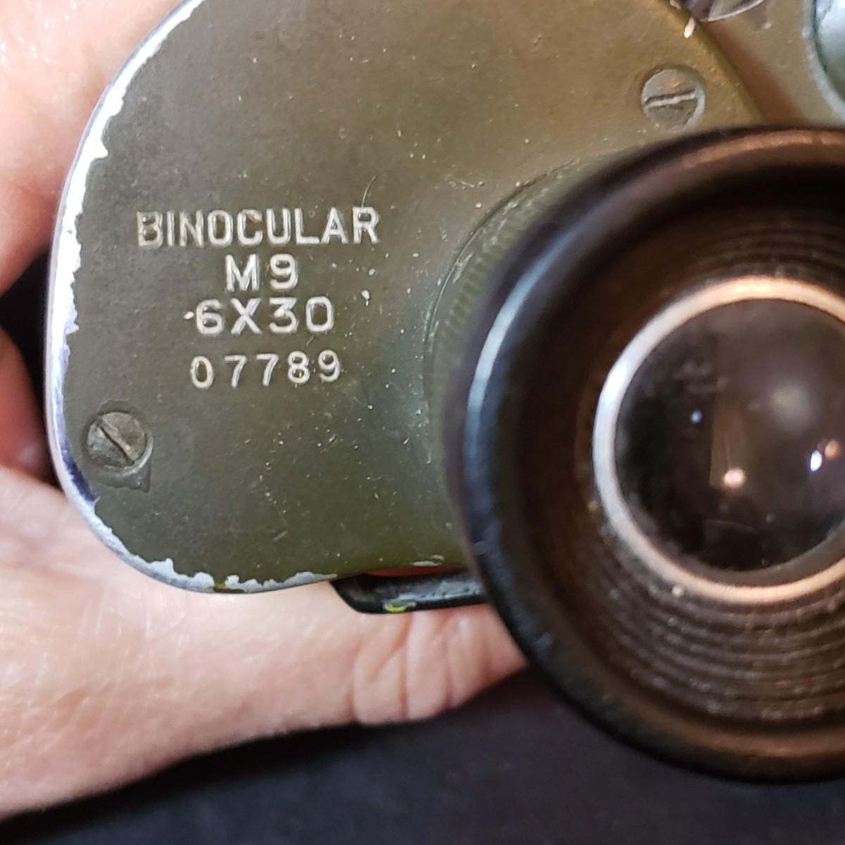 Various items that appear to be WWII military pieces. The two similar musette bags are stamped, but the second one is hard to decipher. See pictures for details. They measure approximately 15" x 5" x 12"H. For their age these appear to be in good condition. The canteen cover is wool lined inside, and the belt still works. The binoculars are made by Universal Camera Corp. Stamped 1942. It comes with a leather carrying case, no strap, but a handle on top.