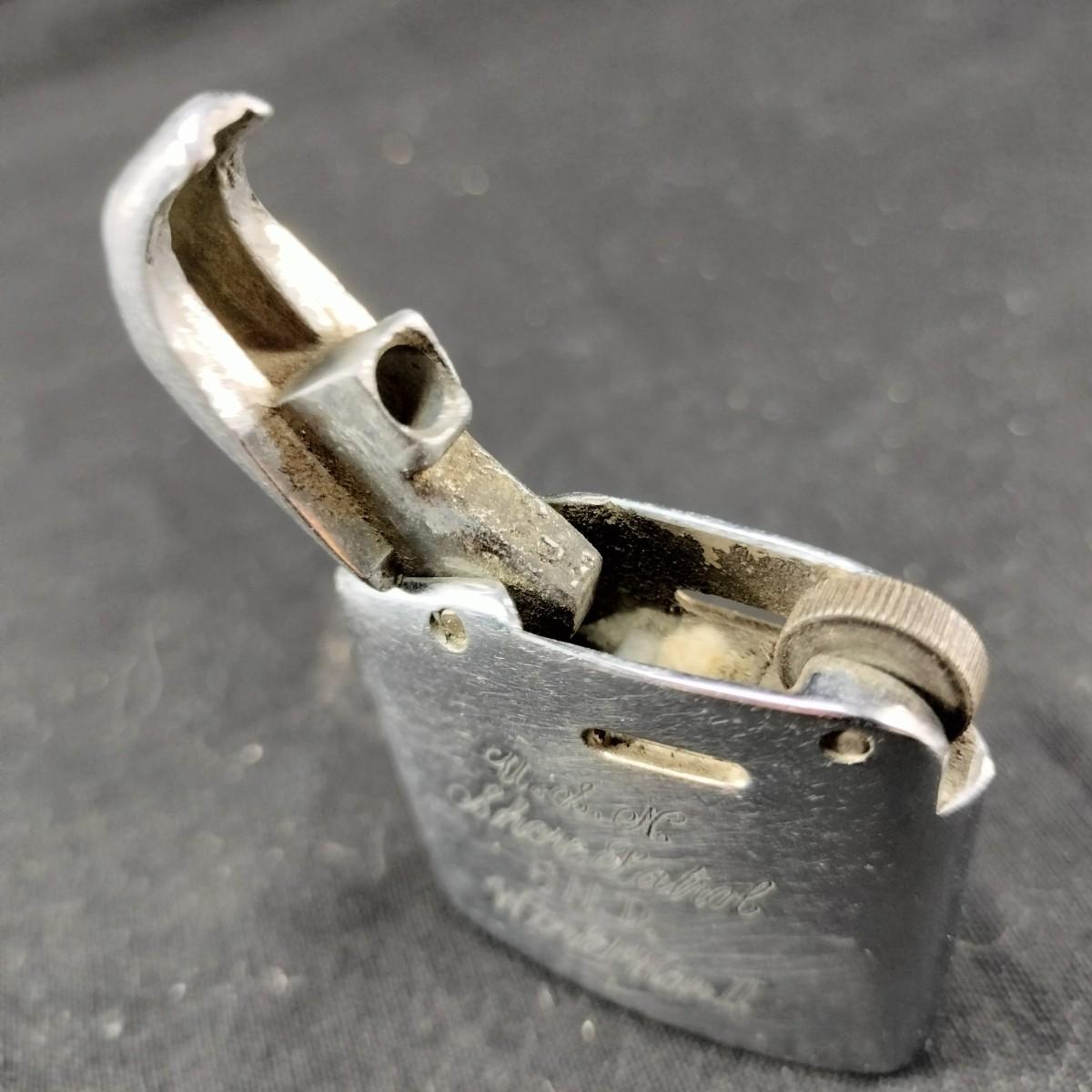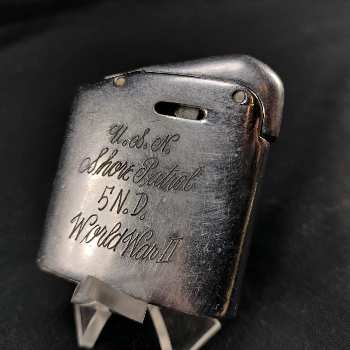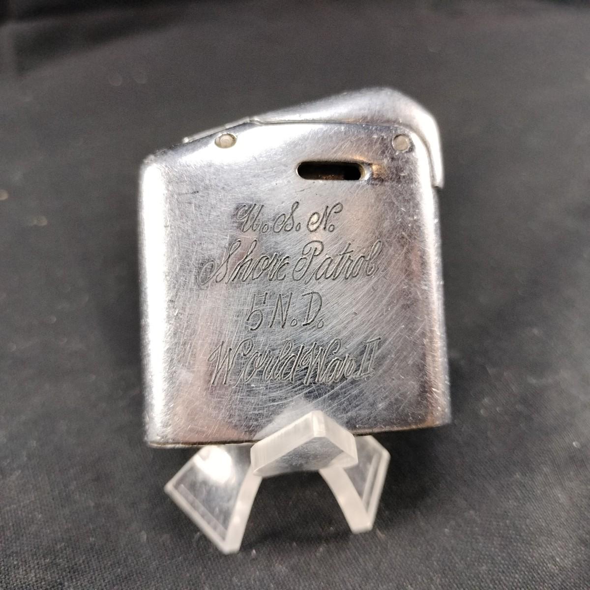 This auction lot is for a WWII Naval Officer Lighter. This vintage stainless steel lighter is from WWII. It belonged to a navel officer. As you can see in the photos it is inscribed: USA Shore Patrol 5 N.D. World War II. It does not work as it is. Could possibly just need flint and fluid - we don't know. It is in worn but vintage condition.