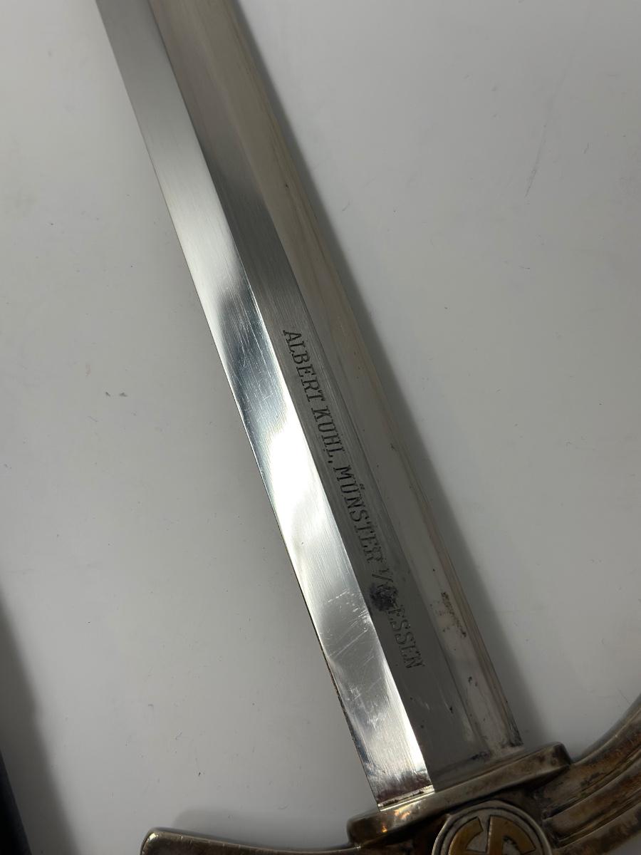 Stamped Albert Kuhl, Munster I/W Essen. This WWII German Luftwaffe dagger has two swastikas depicted on the hilt.