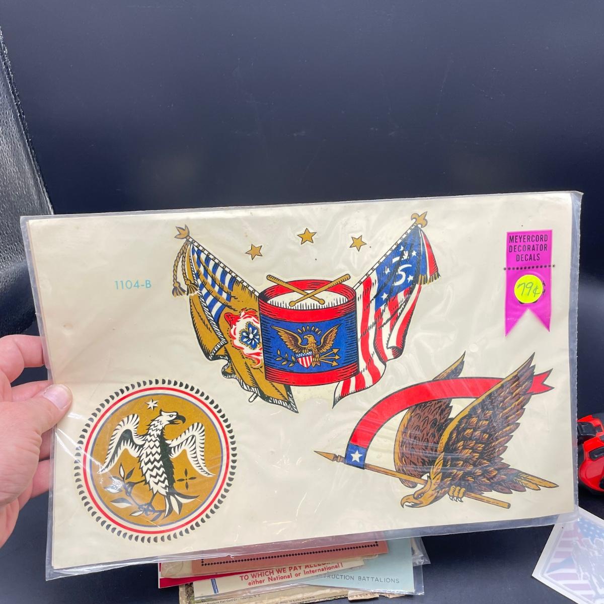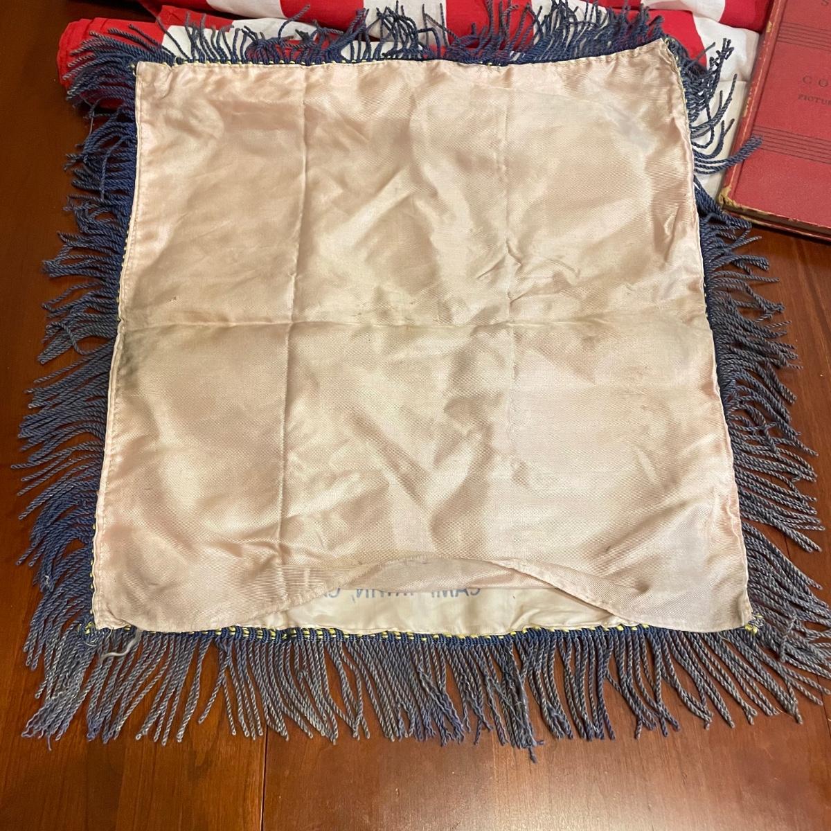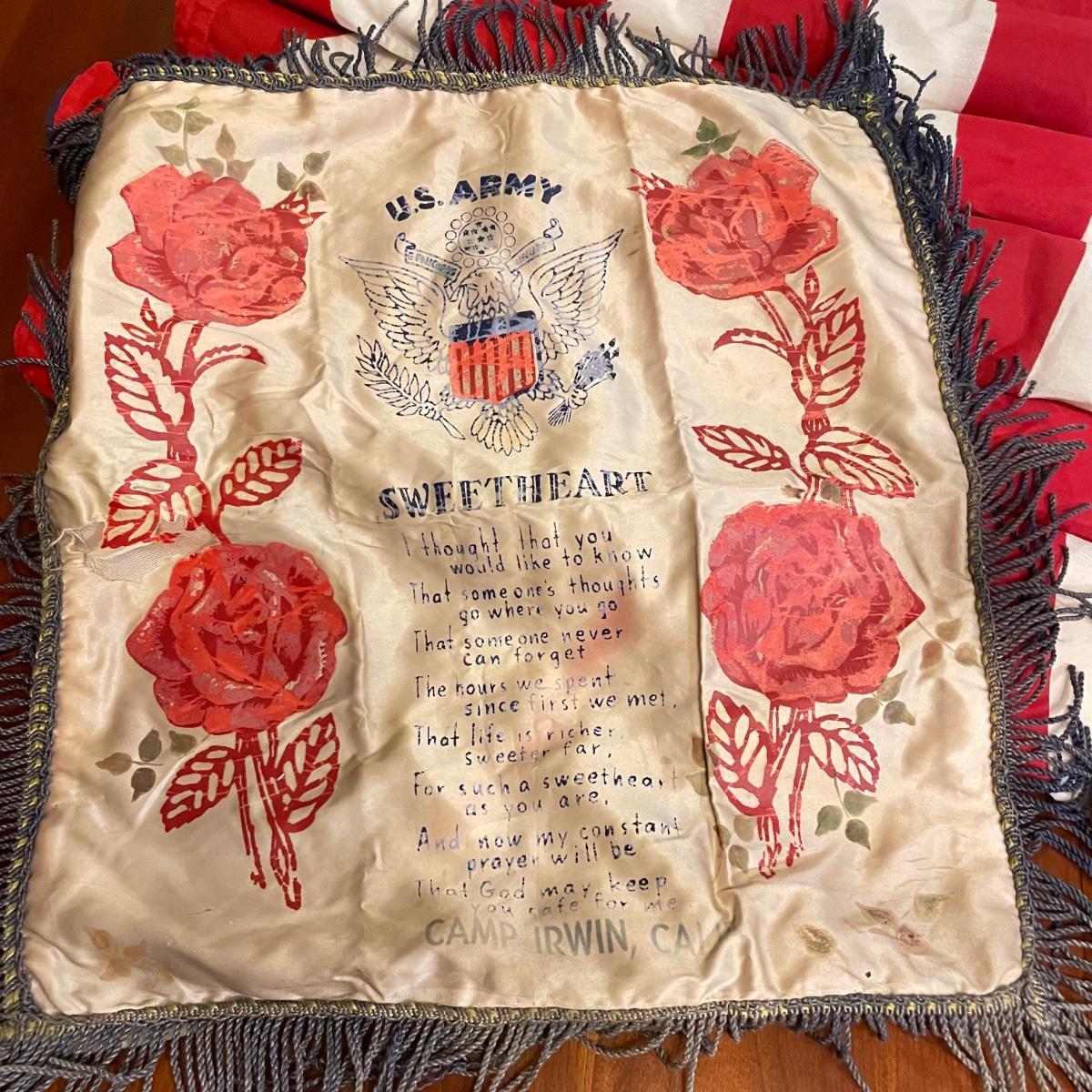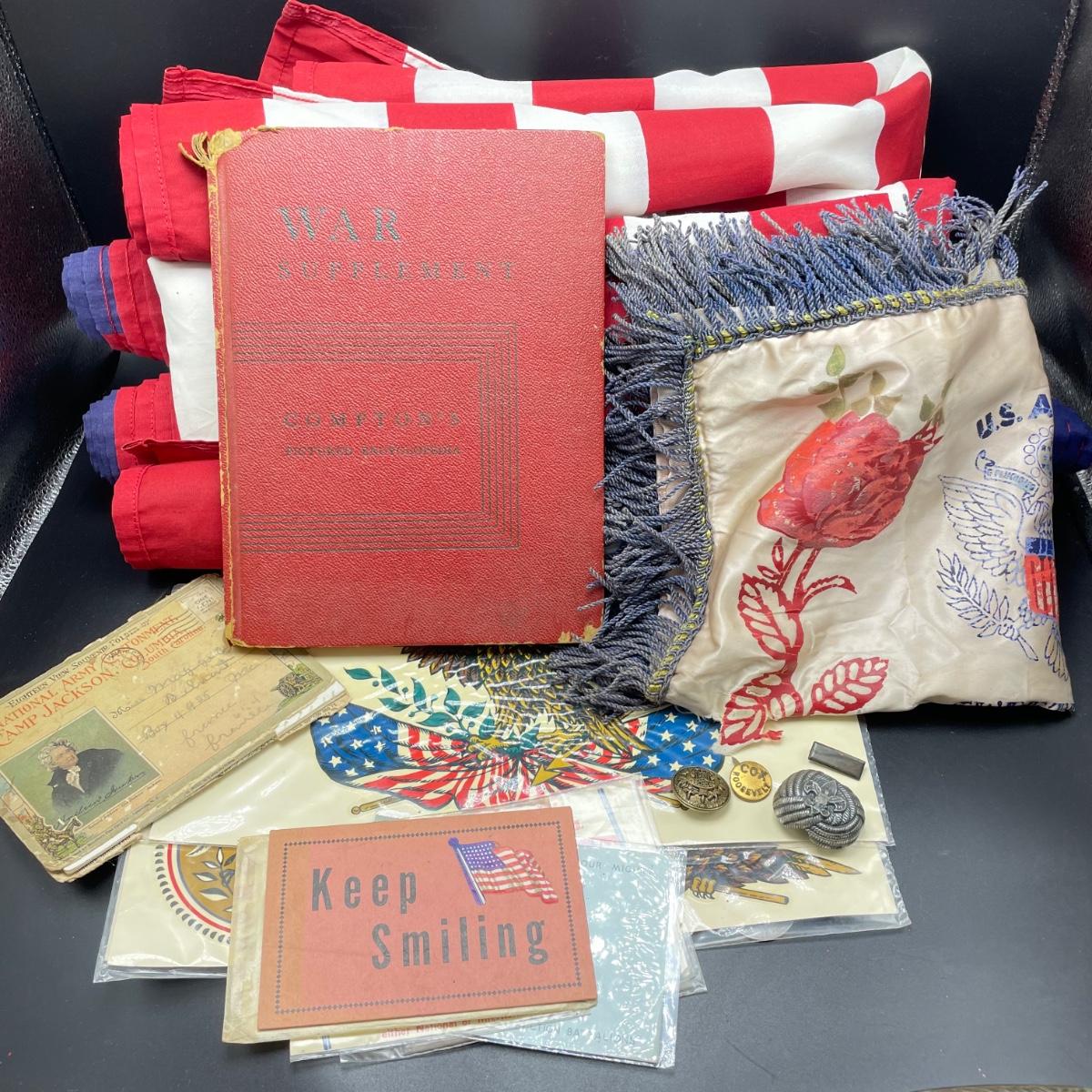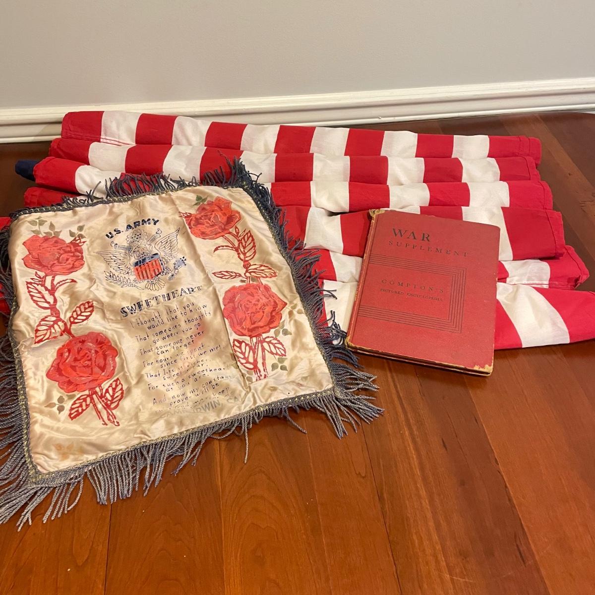 World War II pillowcase with amazing fringe and nice colors with a 1939 Compton’s War Supplement Pictured Encyclopedia. Lot also includes six 3’ x 5’ fifty star flags in amazing shape. American pins and buttons, including one sterling along with vintage decals and flags. See images. Shipping available.