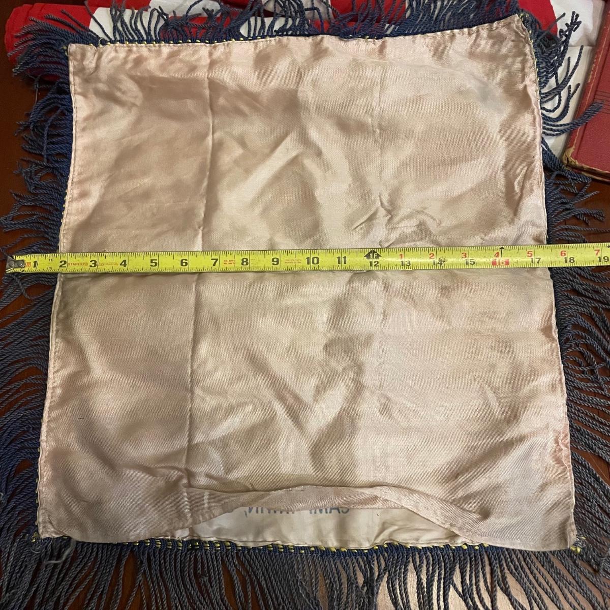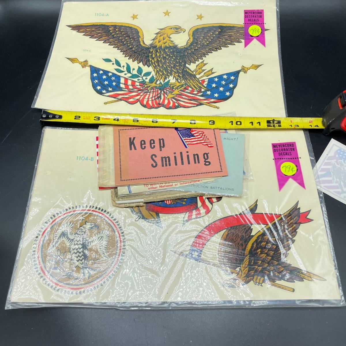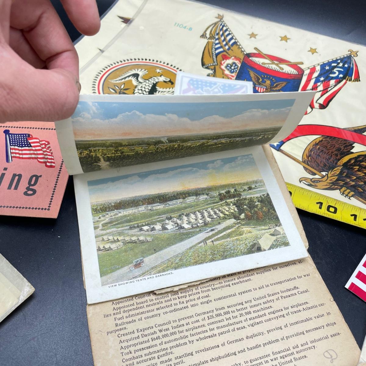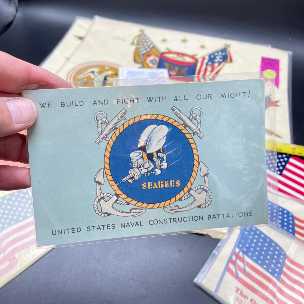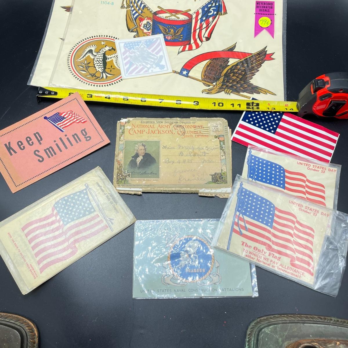 World War II pillowcase with amazing fringe and nice colors with a 1939 Compton’s War Supplement Pictured Encyclopedia. Lot also includes six 3’ x 5’ fifty star flags in amazing shape. American pins and buttons, including one sterling along with vintage decals and flags. See images. Shipping available.