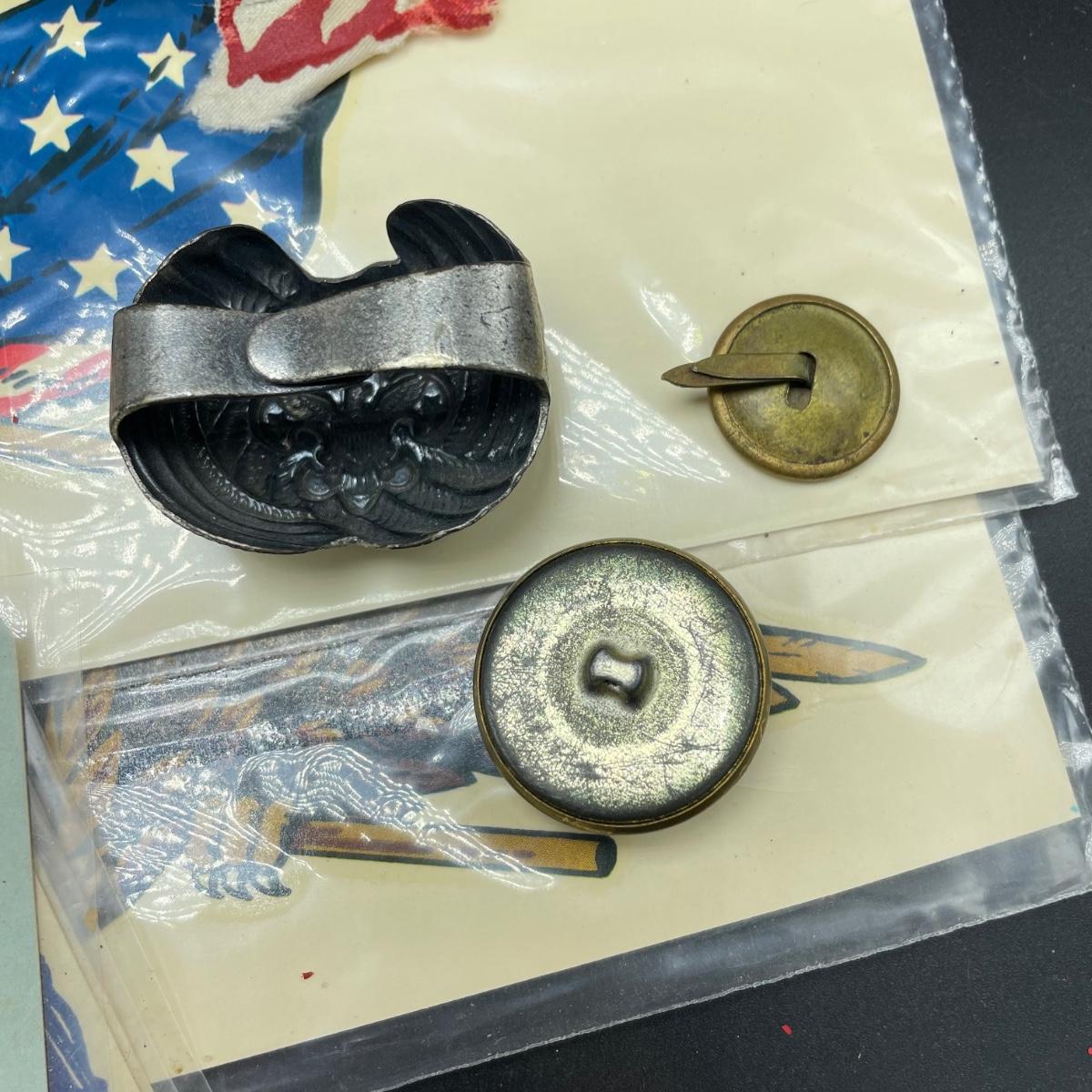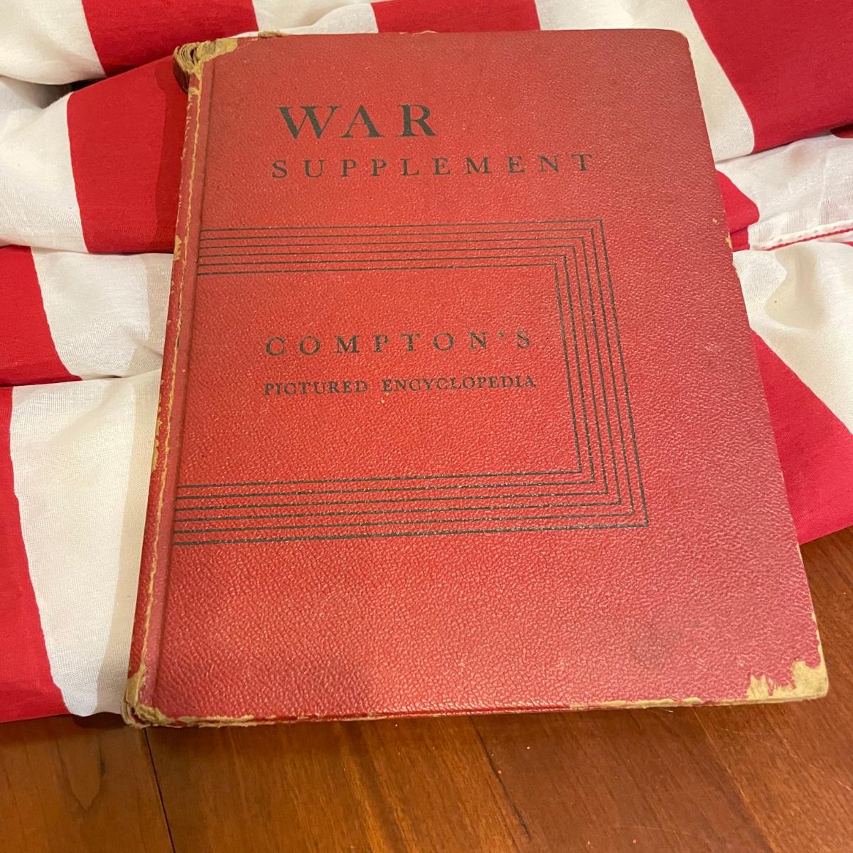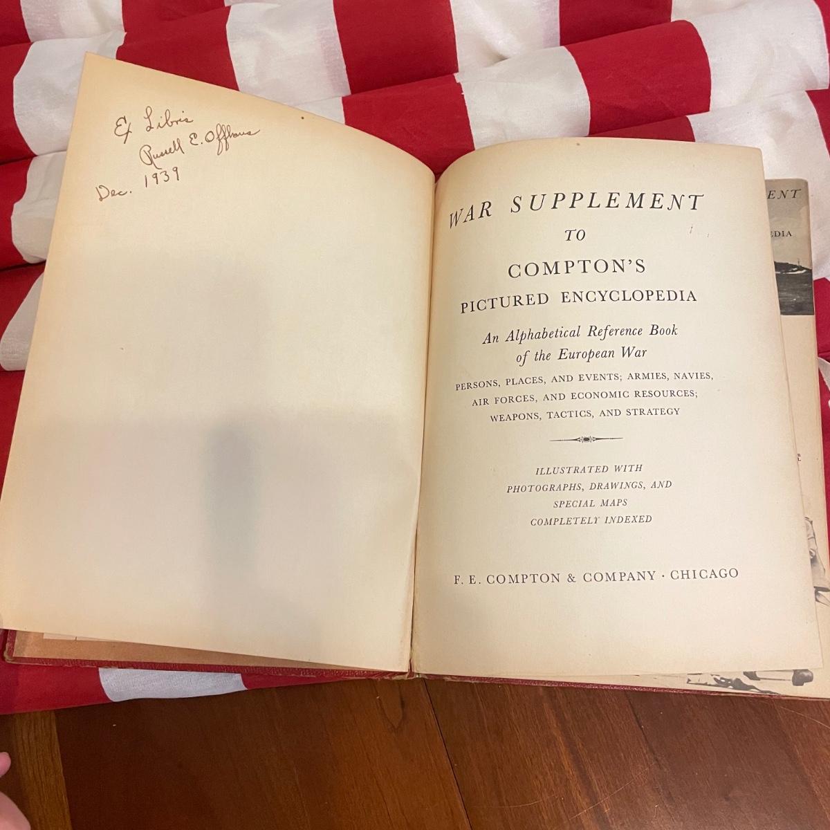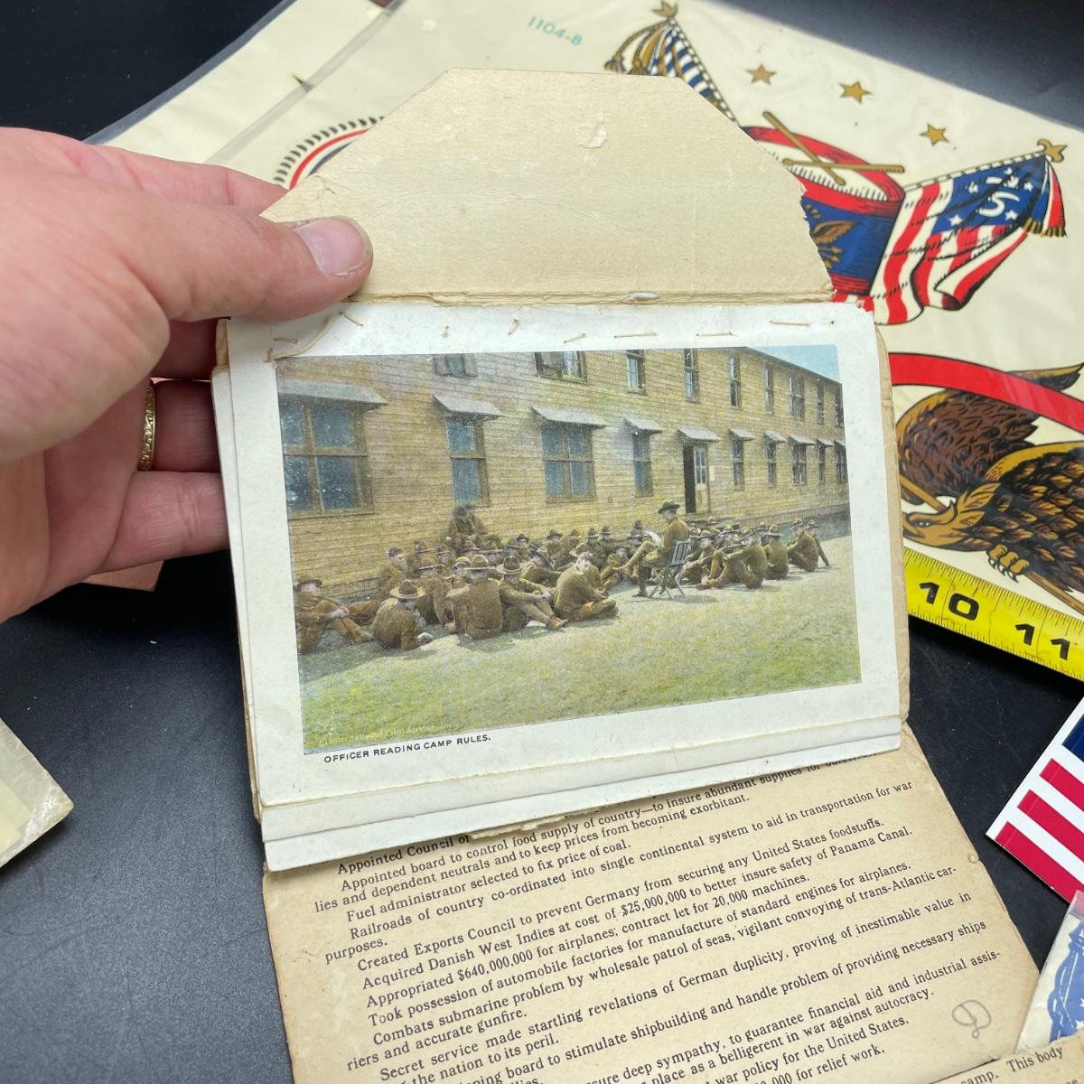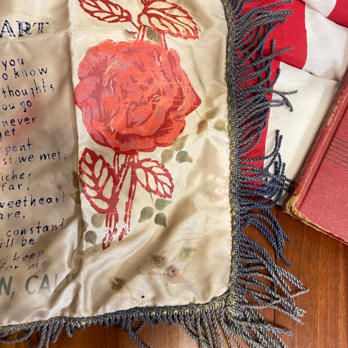 World War II pillowcase with amazing fringe and nice colors with a 1939 Compton’s War Supplement Pictured Encyclopedia. Lot also includes six 3’ x 5’ fifty star flags in amazing shape. American pins and buttons, including one sterling along with vintage decals and flags. See images. Shipping available.