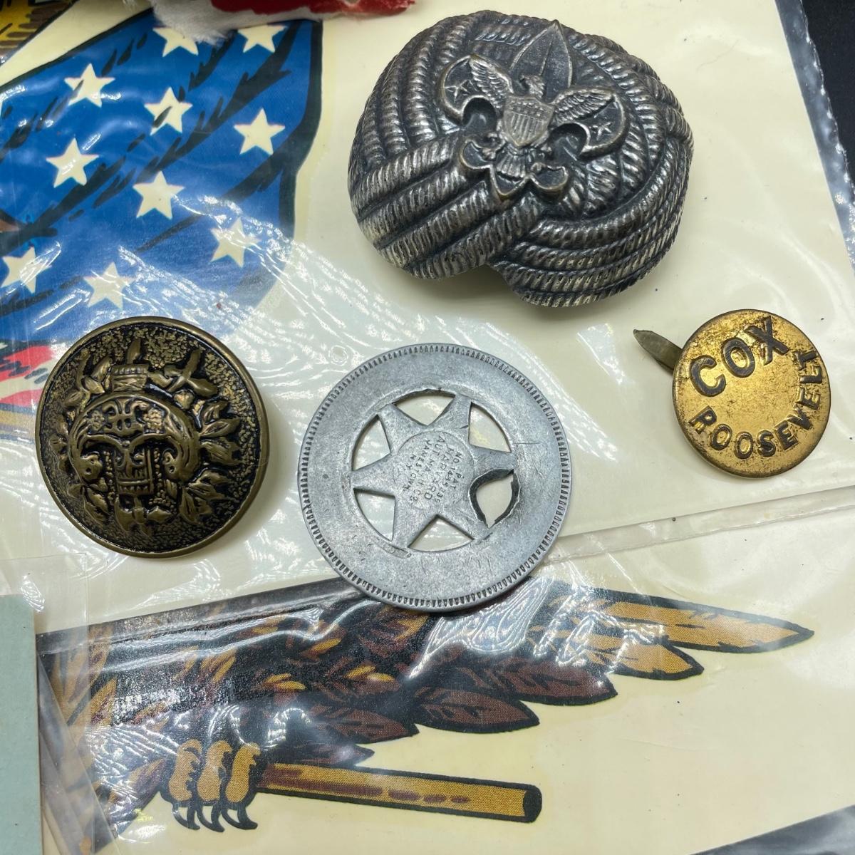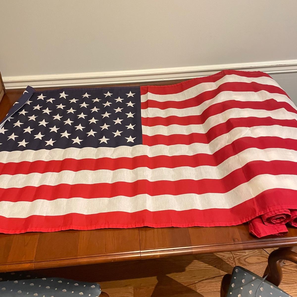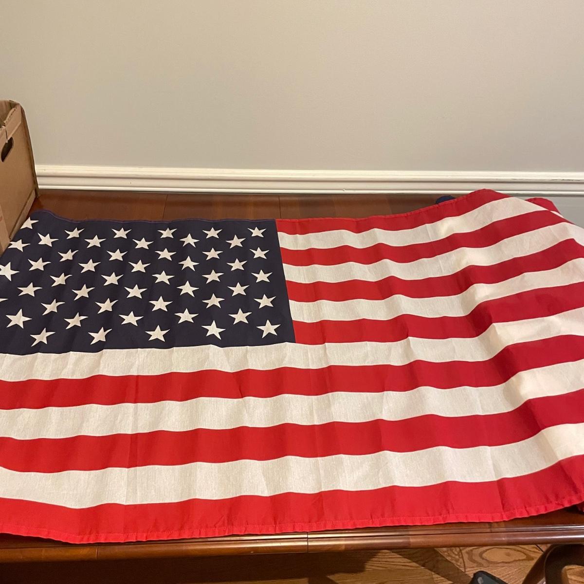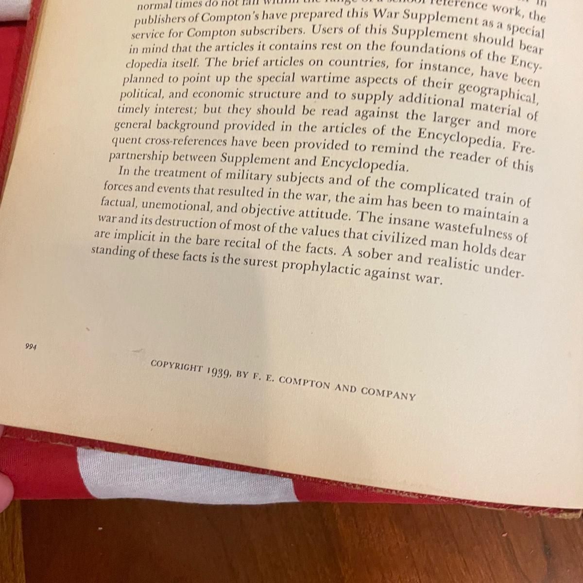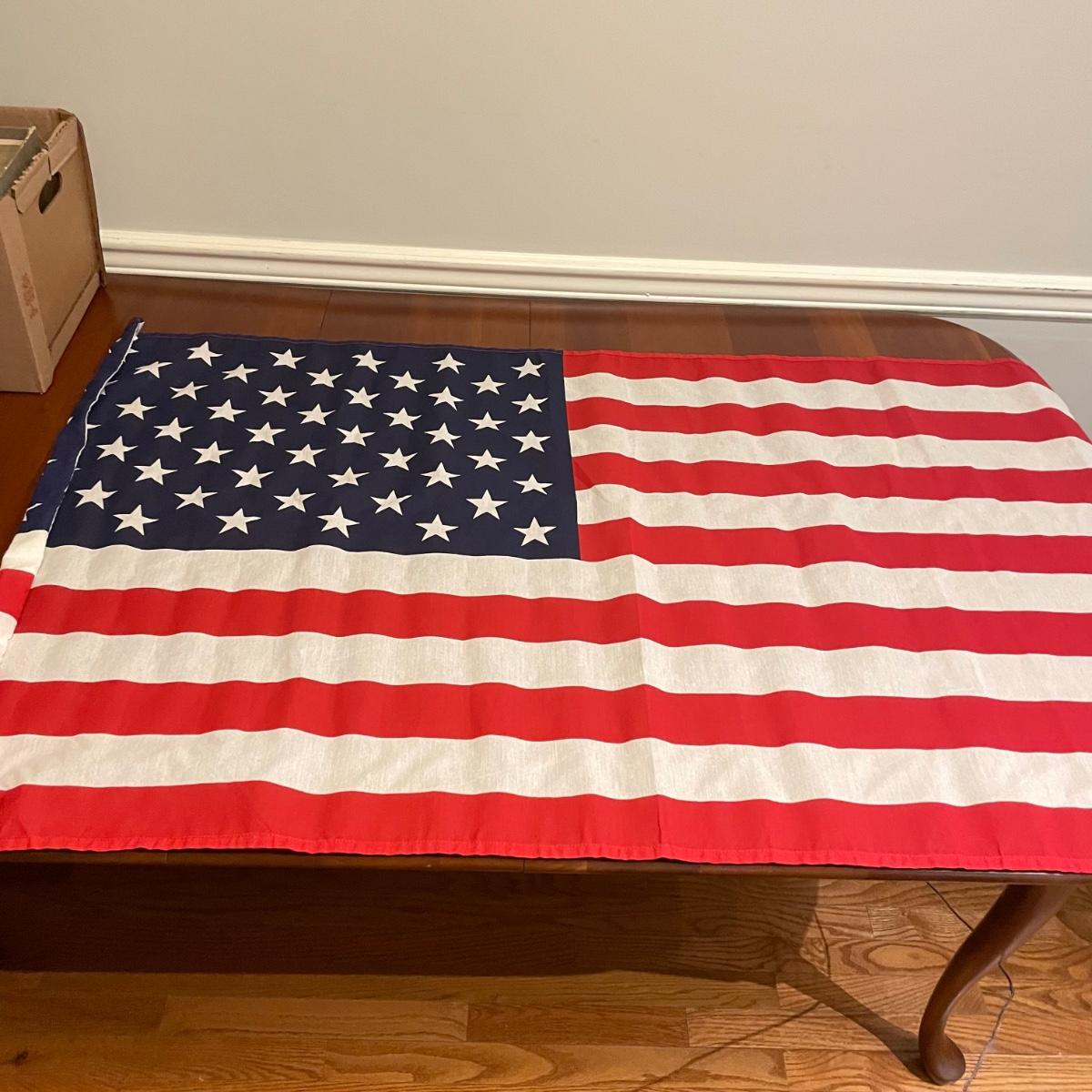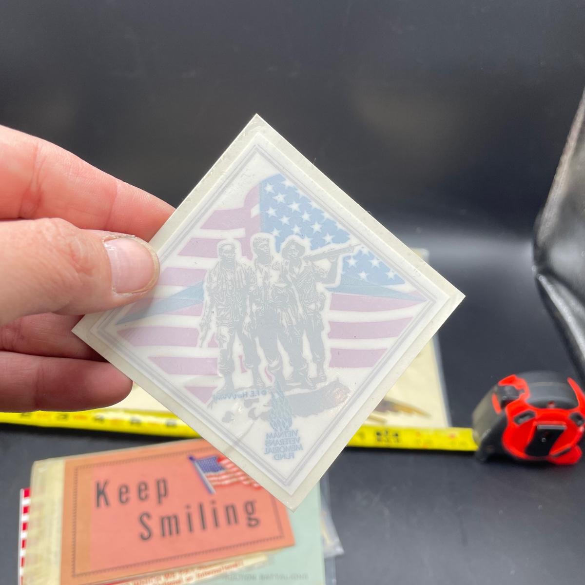 World War II pillowcase with amazing fringe and nice colors with a 1939 Compton’s War Supplement Pictured Encyclopedia. Lot also includes six 3’ x 5’ fifty star flags in amazing shape. American pins and buttons, including one sterling along with vintage decals and flags. See images. Shipping available.