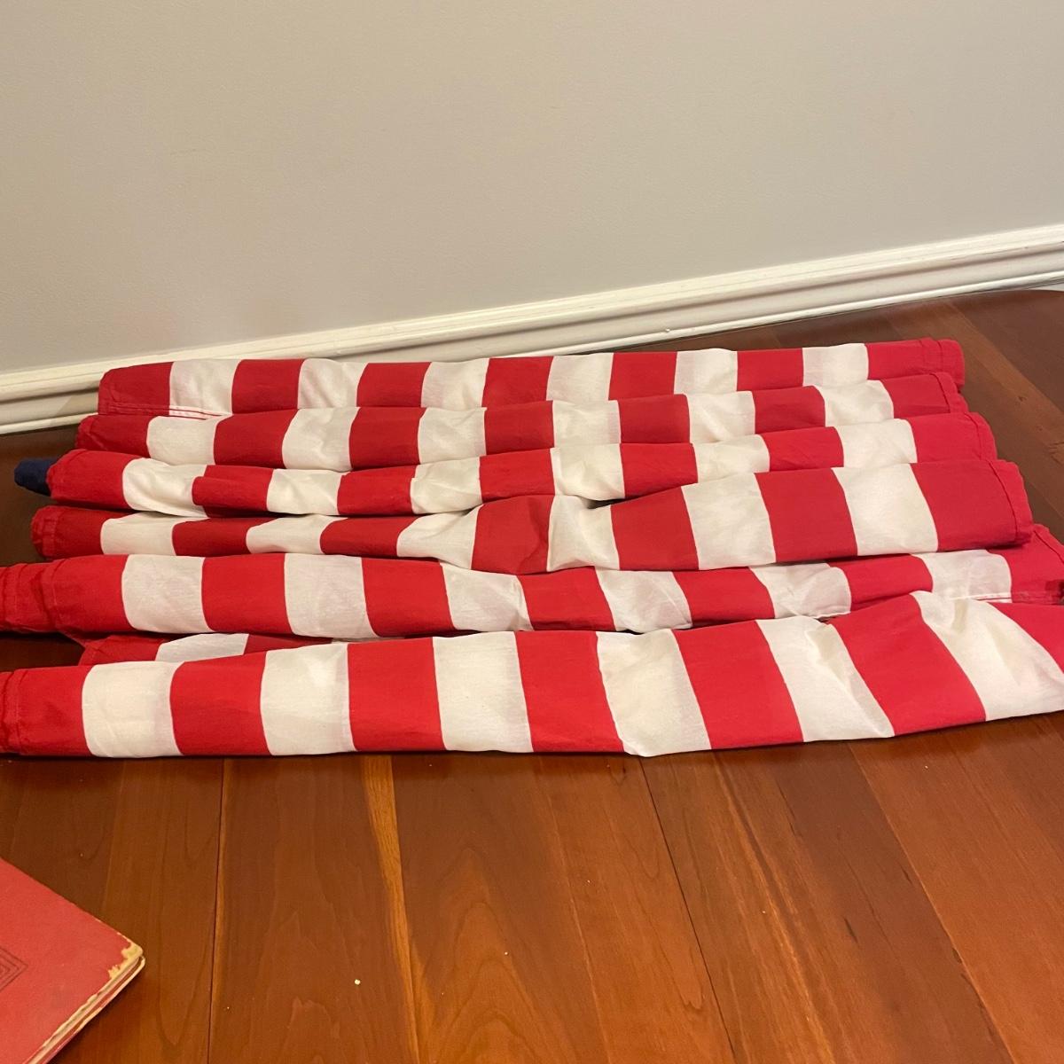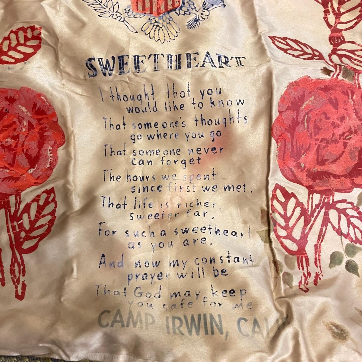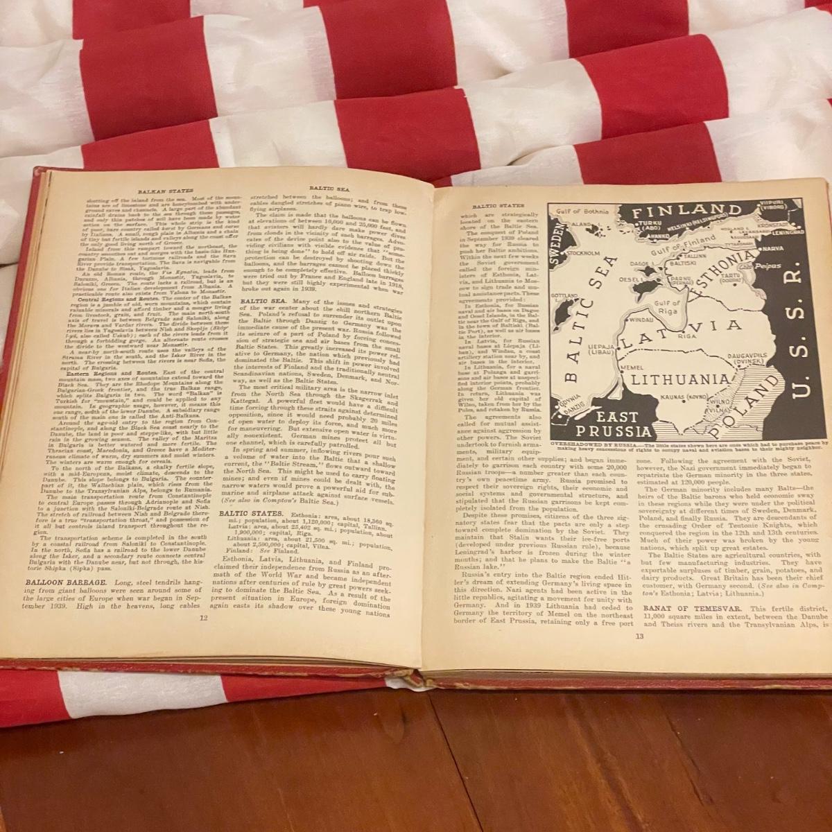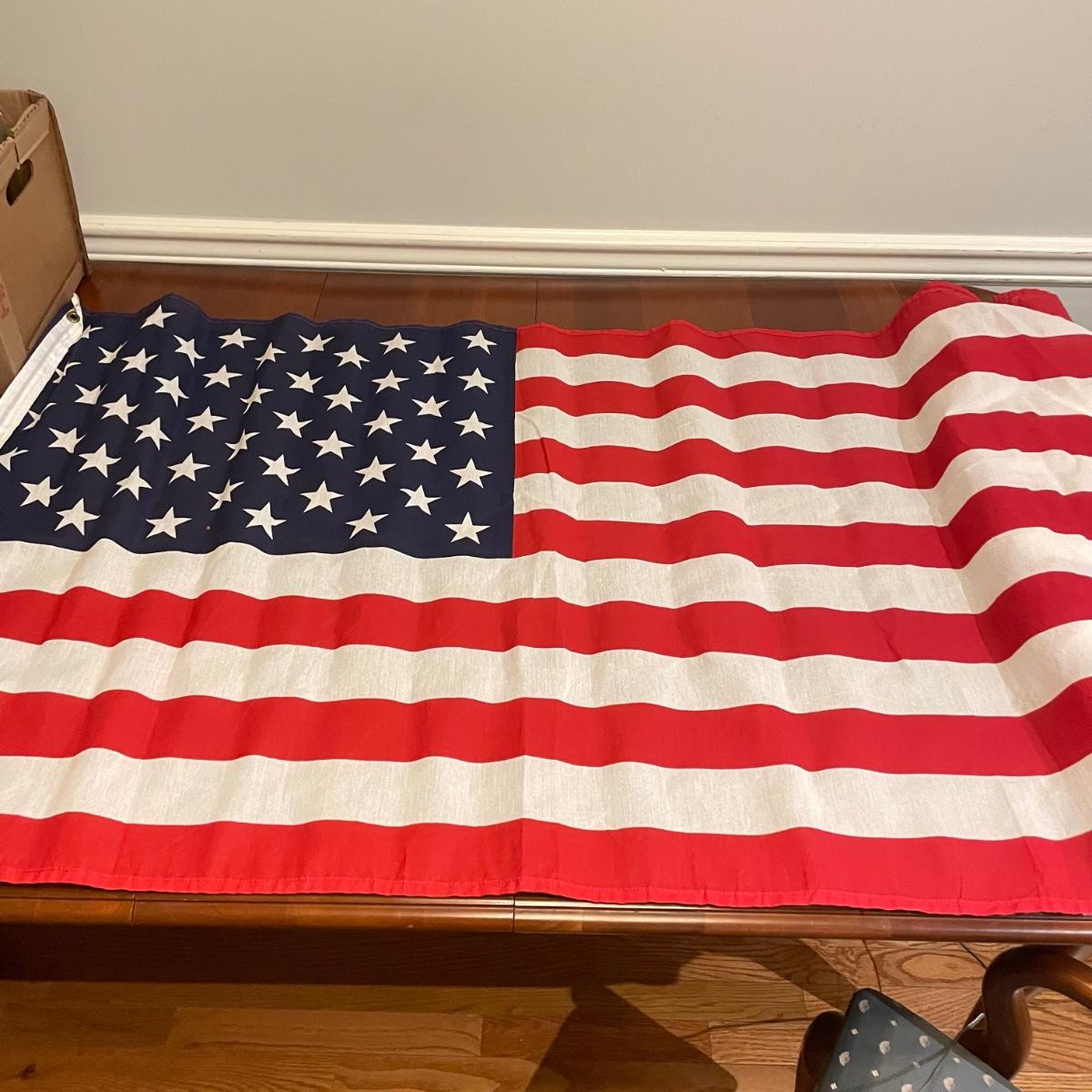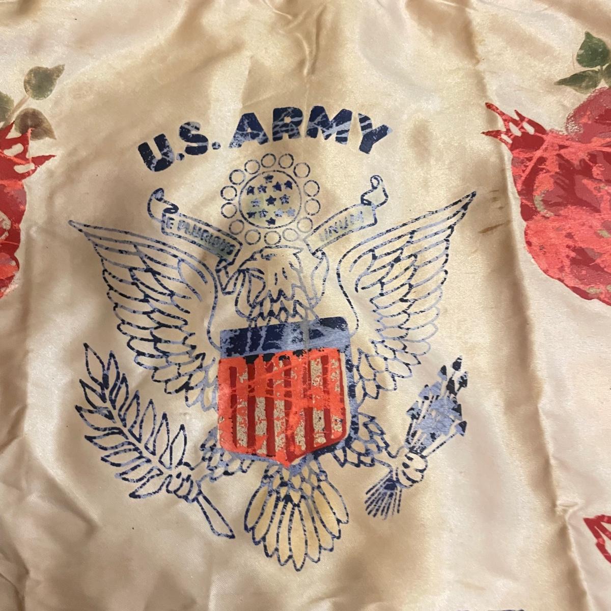 World War II pillowcase with amazing fringe and nice colors with a 1939 Compton’s War Supplement Pictured Encyclopedia. Lot also includes six 3’ x 5’ fifty star flags in amazing shape. American pins and buttons, including one sterling along with vintage decals and flags. See images. Shipping available.