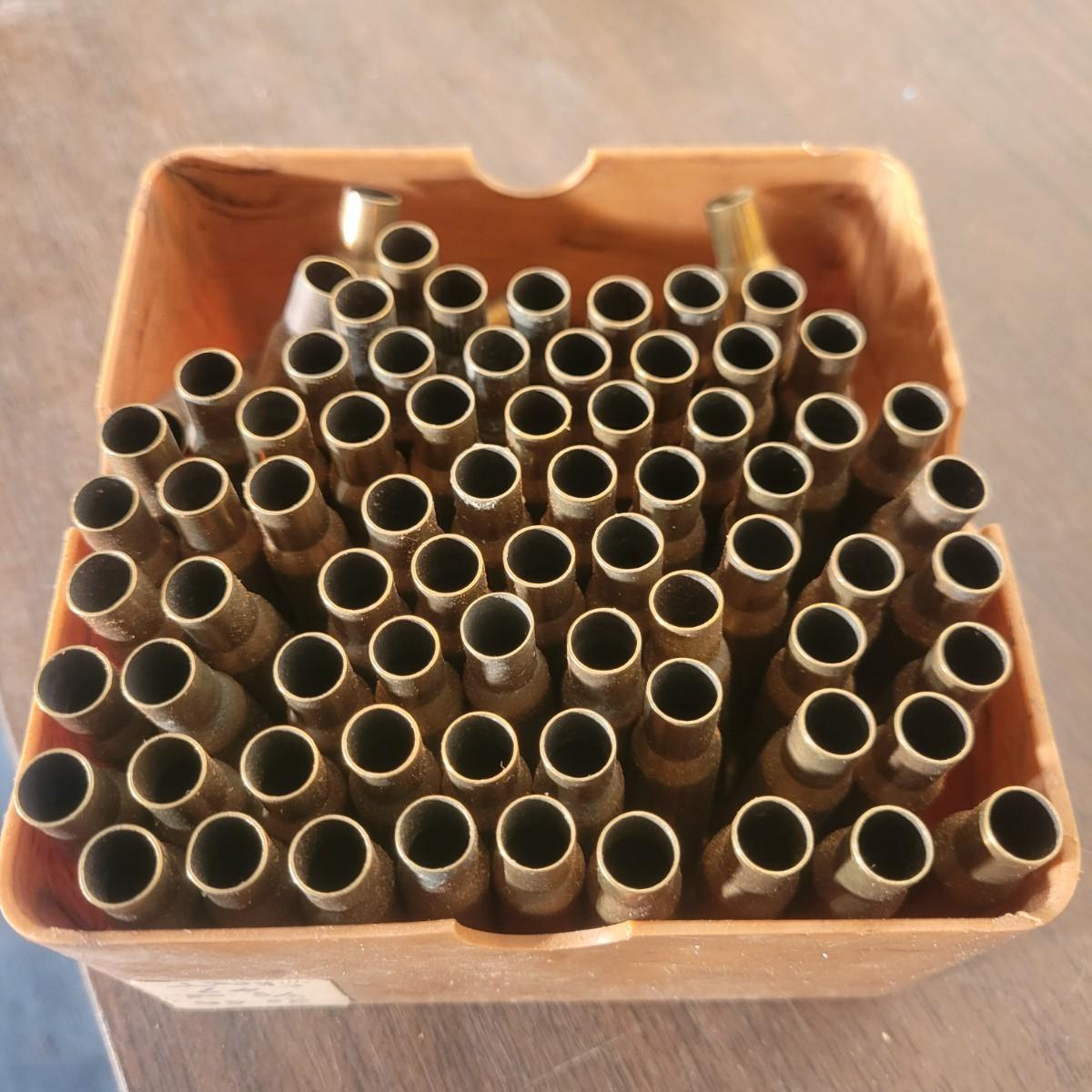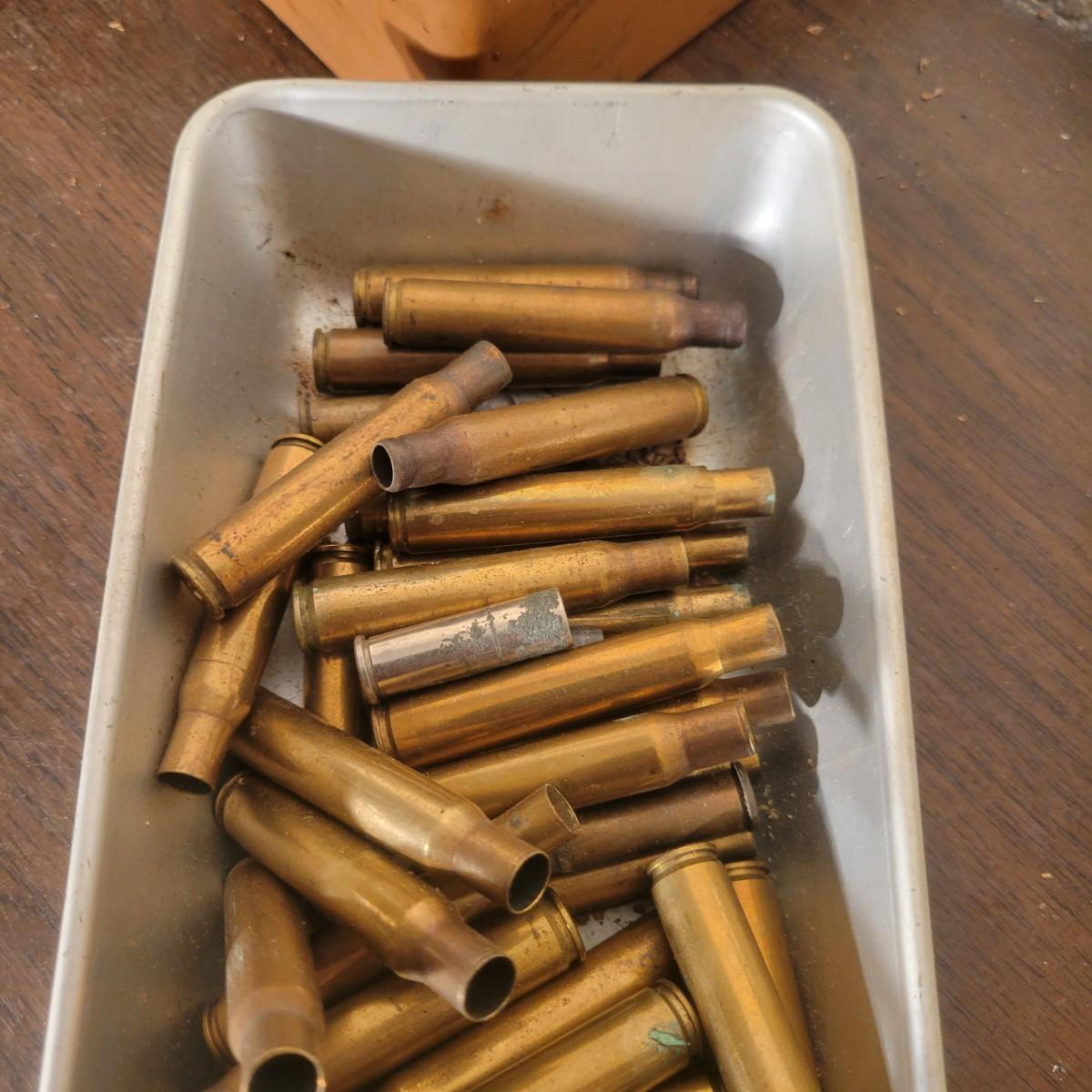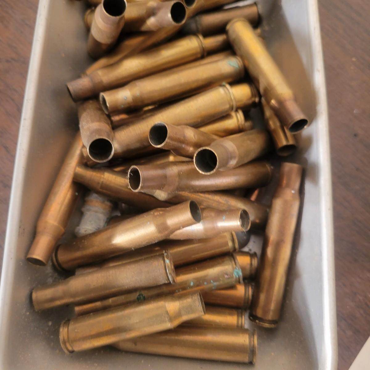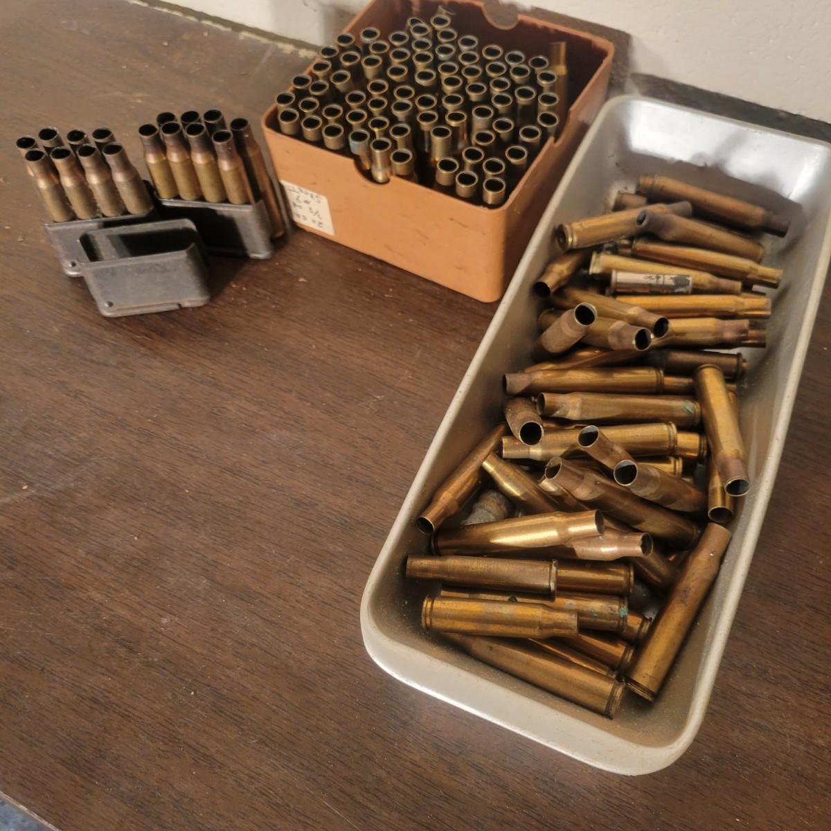 An assortment of brass casings and magazines for a M1 Garand. Brass casings range from WWII thru Korea and are a variety of calibers. Local pickup only