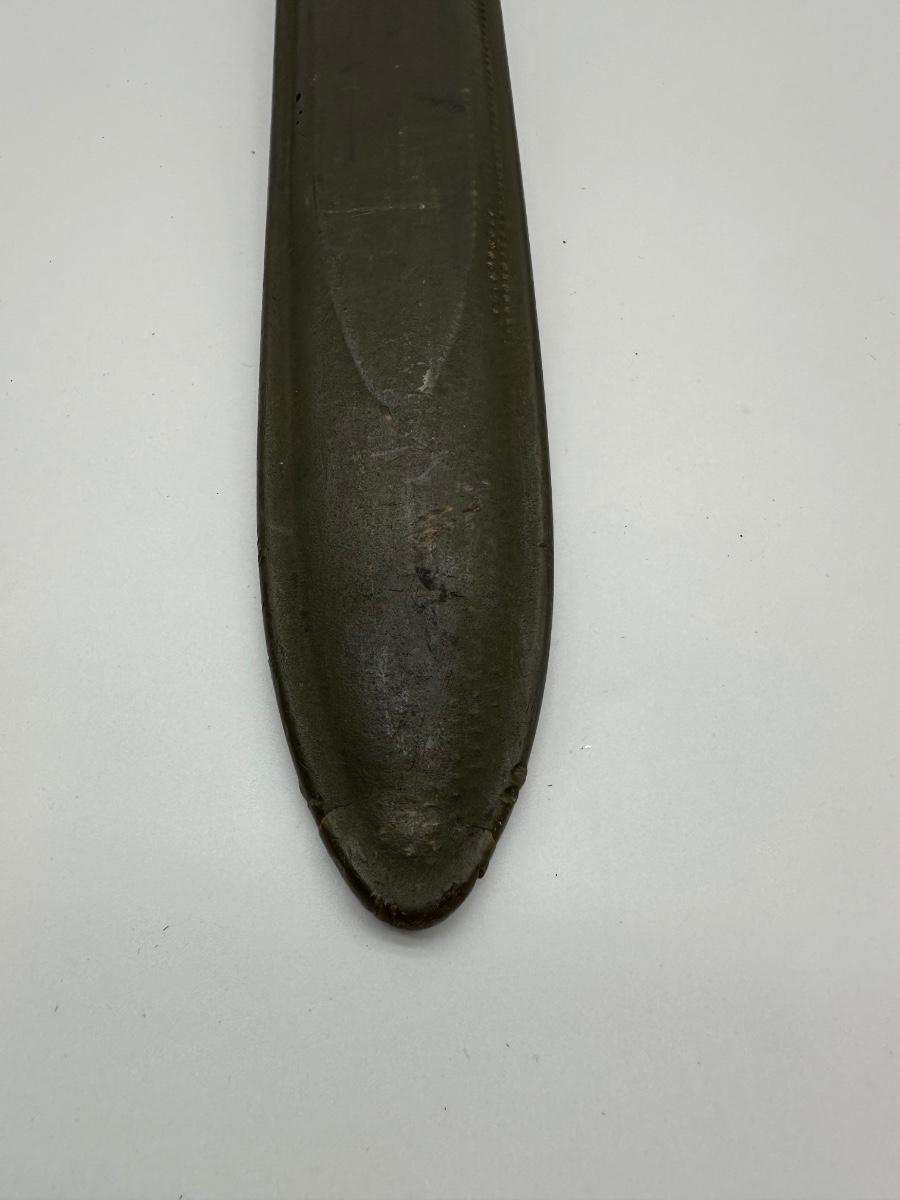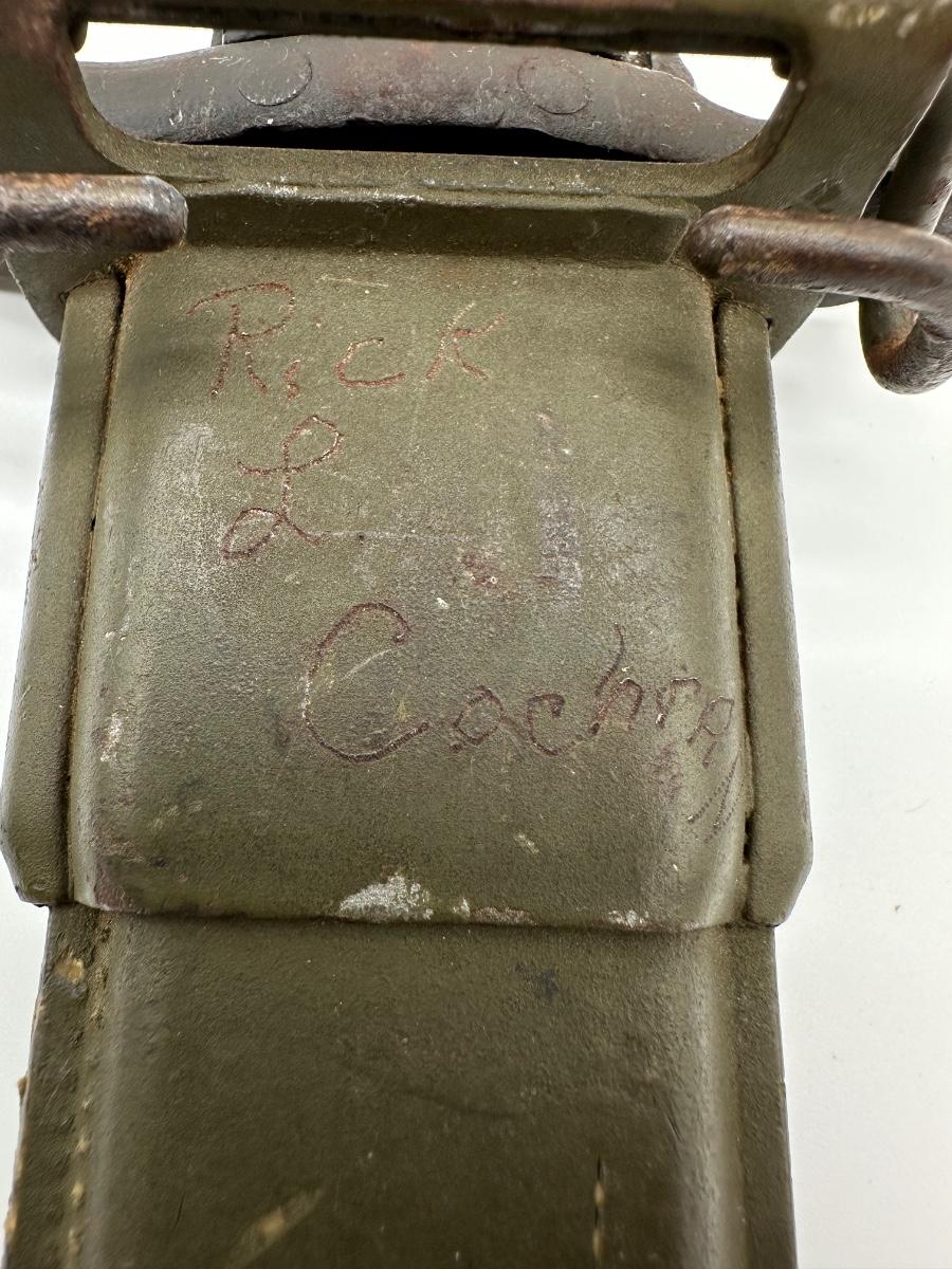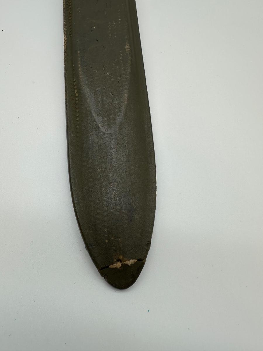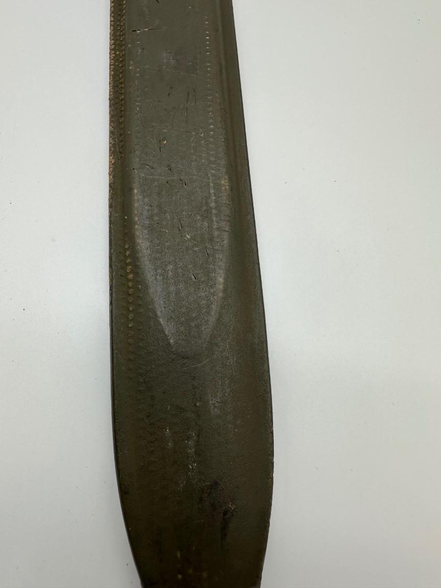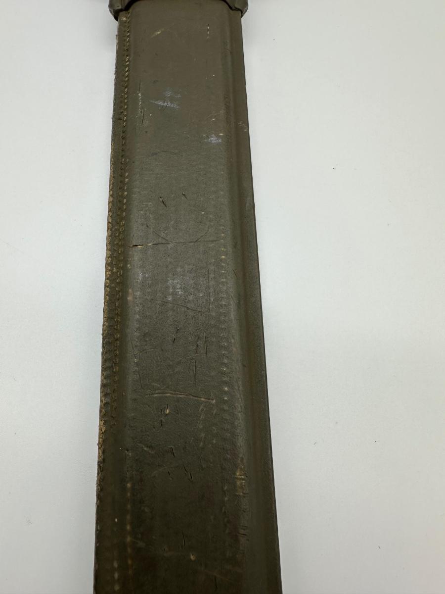 Original WWII U.S. M1 Garand bayonet manufactured in 1943 by UFH (Union Fork & Hoe). Blade is properly marked “U.F.H / U.S. / 1943” with correct fuller and crossguard. Includes original WWII-era scabbard (likely M8/M3 type). Honest wartime wear consistent with age and service. Solid collectible example of a WWII U.S. military bayonet.