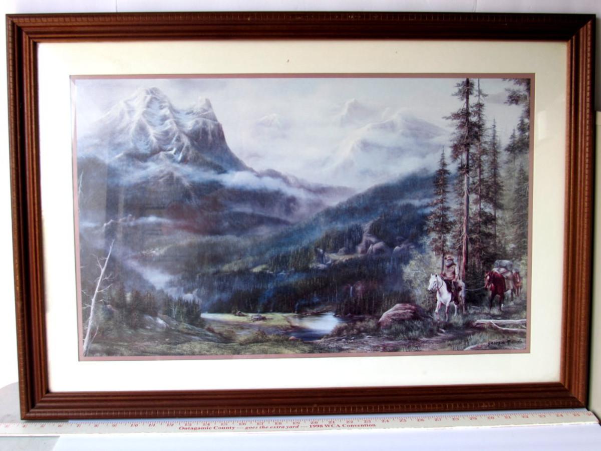 Very pretty mountain and cowboy scene. The edge of the mat has a water stain, but the mat can be replaced.