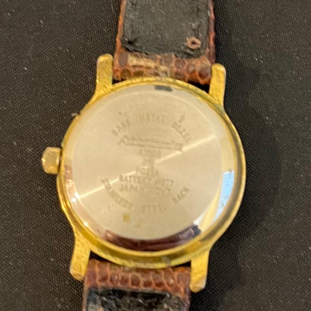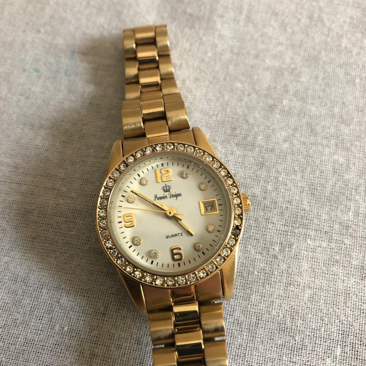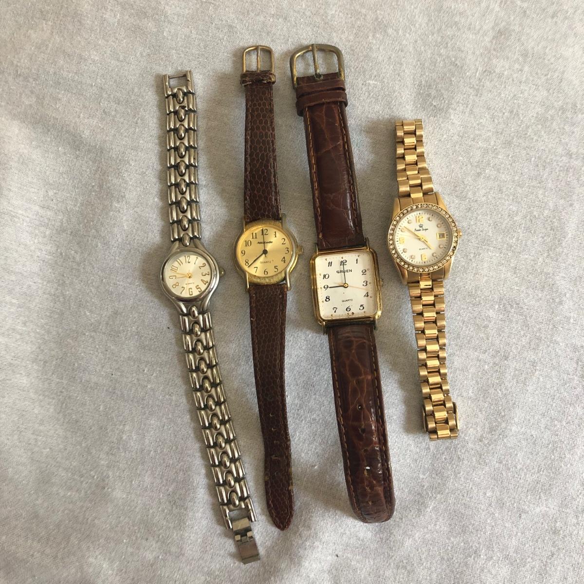 The silver tone watch shows wear to the metal on the back of the band and the leather band watches show wear to the leather. The faces of the silver tone and leather watches do show some surface scratches to the glass. The gold tone Premier Designs watch does show some discoloration in one of the faceted gems that looks like it could be cleaned off. Shipping available.