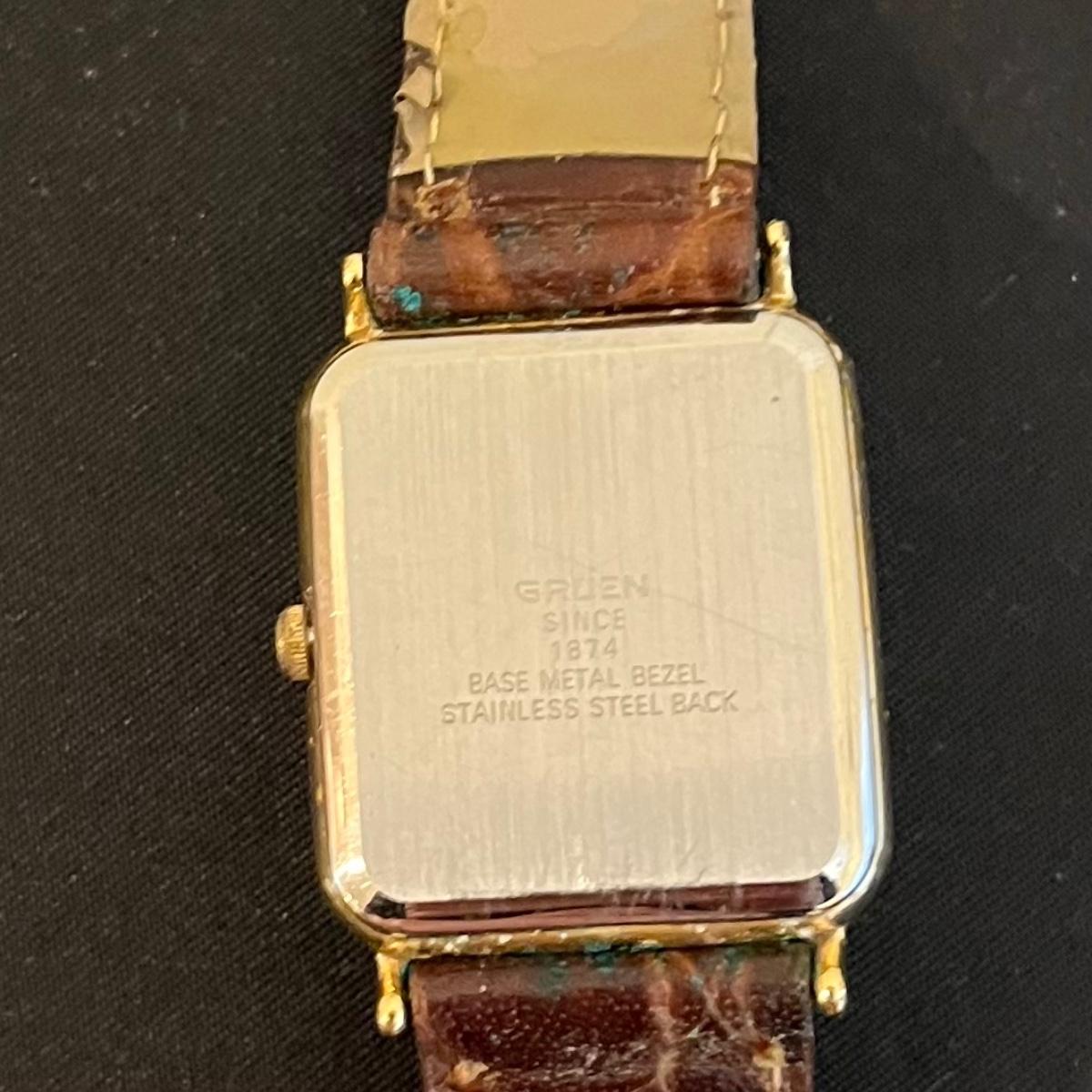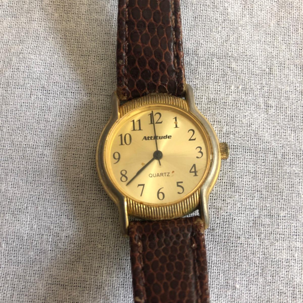 These 4 watches are all analog and marked Quartz with Stainless Steel backs. The gold watch by Premier Designs does not appear to be worn and still has plastic protective film on the face and back of the watch. This watch has a circle of faceted gems around it and inside the face. The two watches with leather bands have gold tone details and the brands Attitude and Gruen on their faces.
