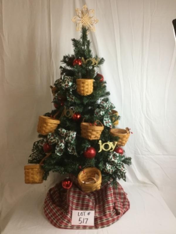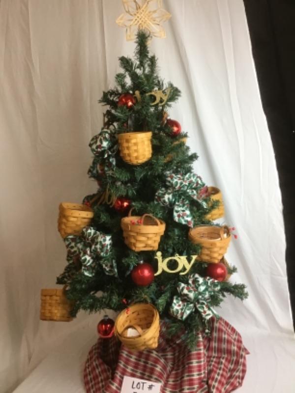 4’ Christmas Tree Decorated with Mini Longaberger Baskets, Red Bulbs, Joy Ornaments,Longaberger Ribbon, Red/Green/Cream Fabric as Tree Skirt.