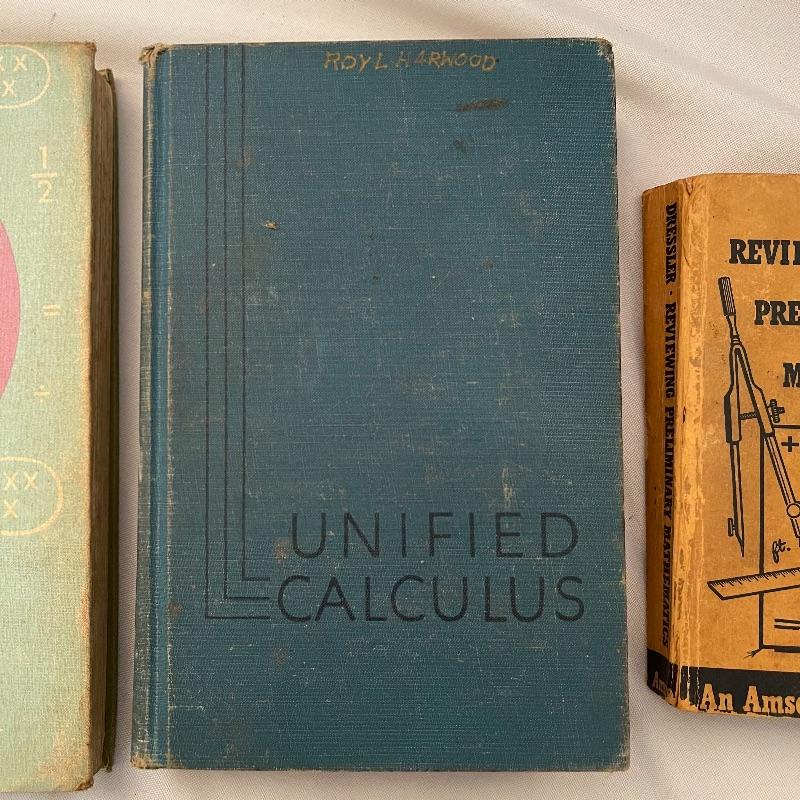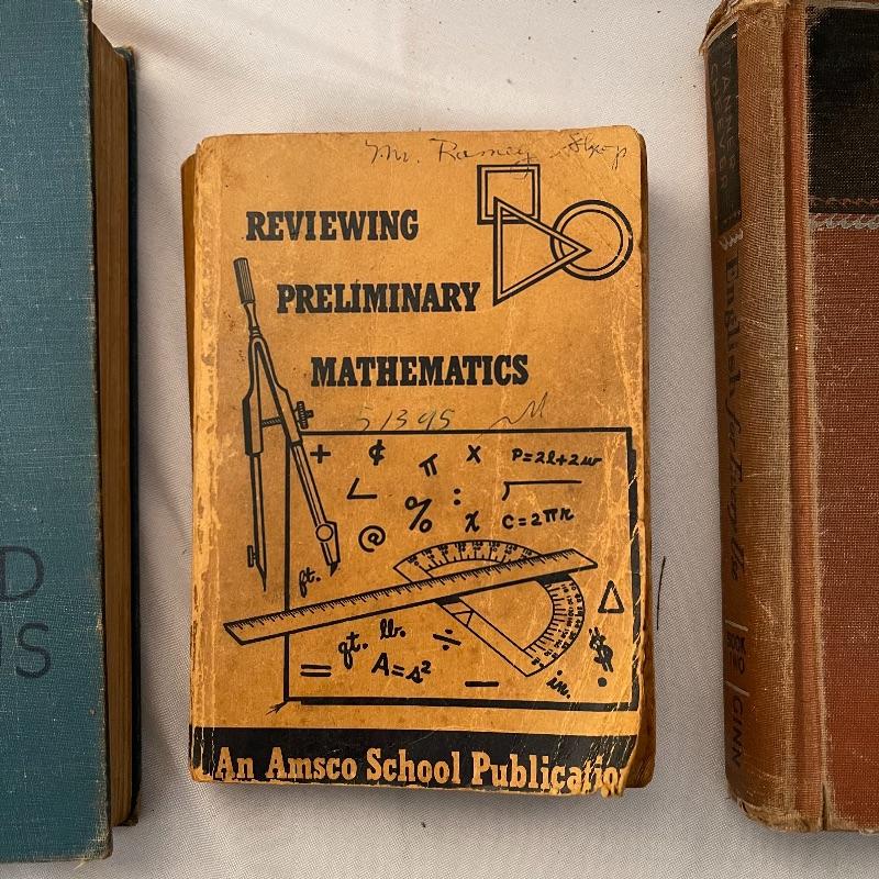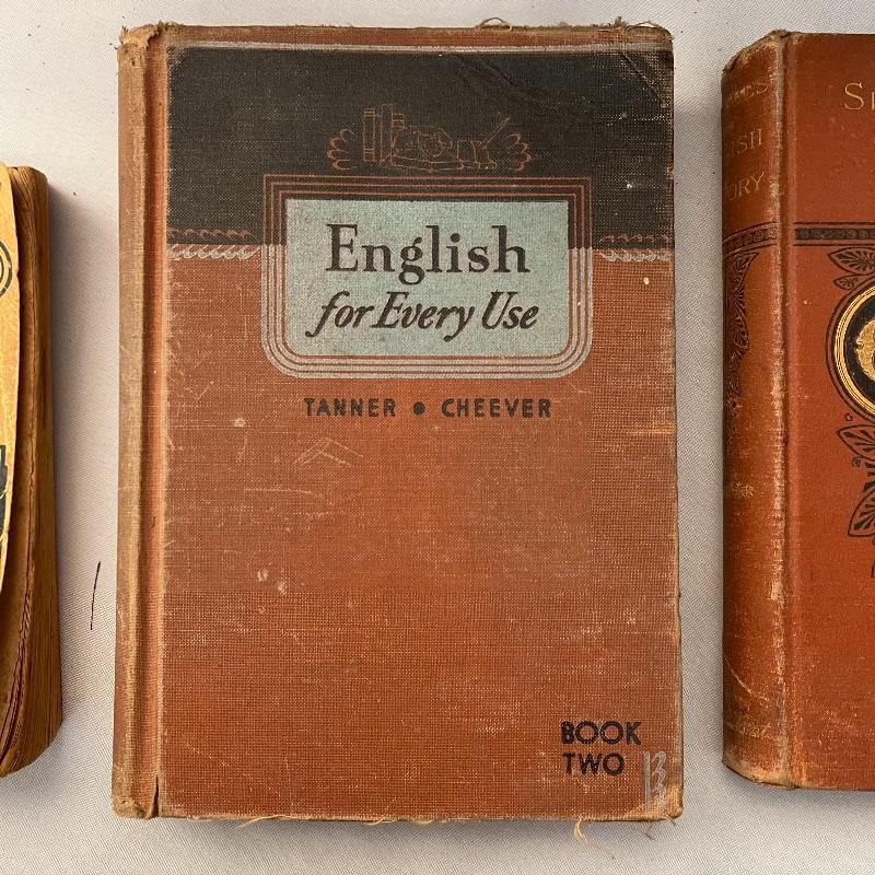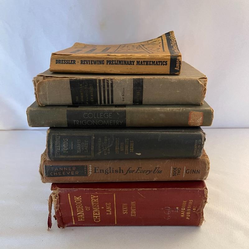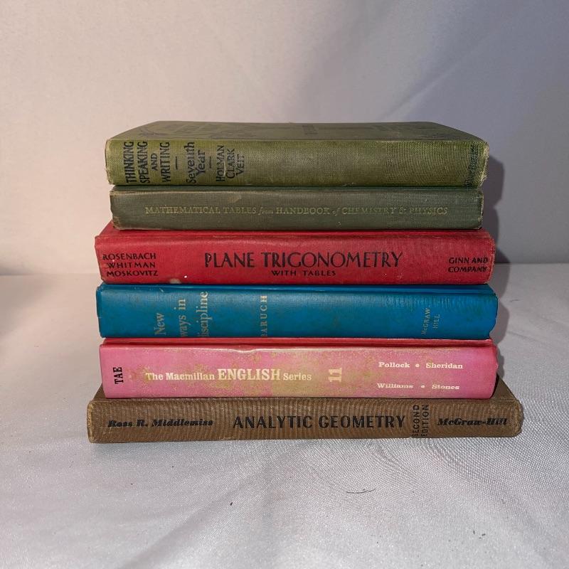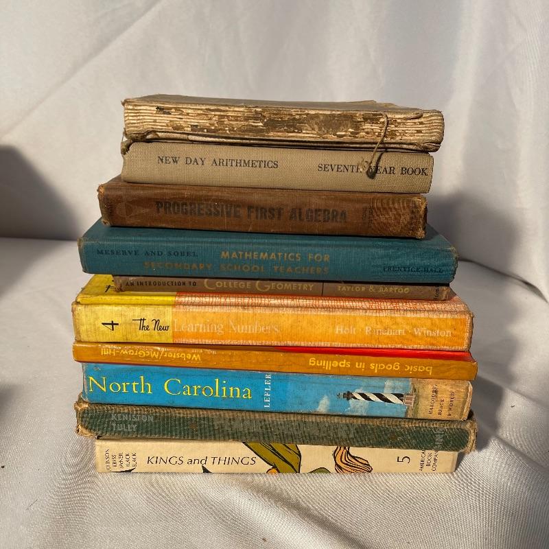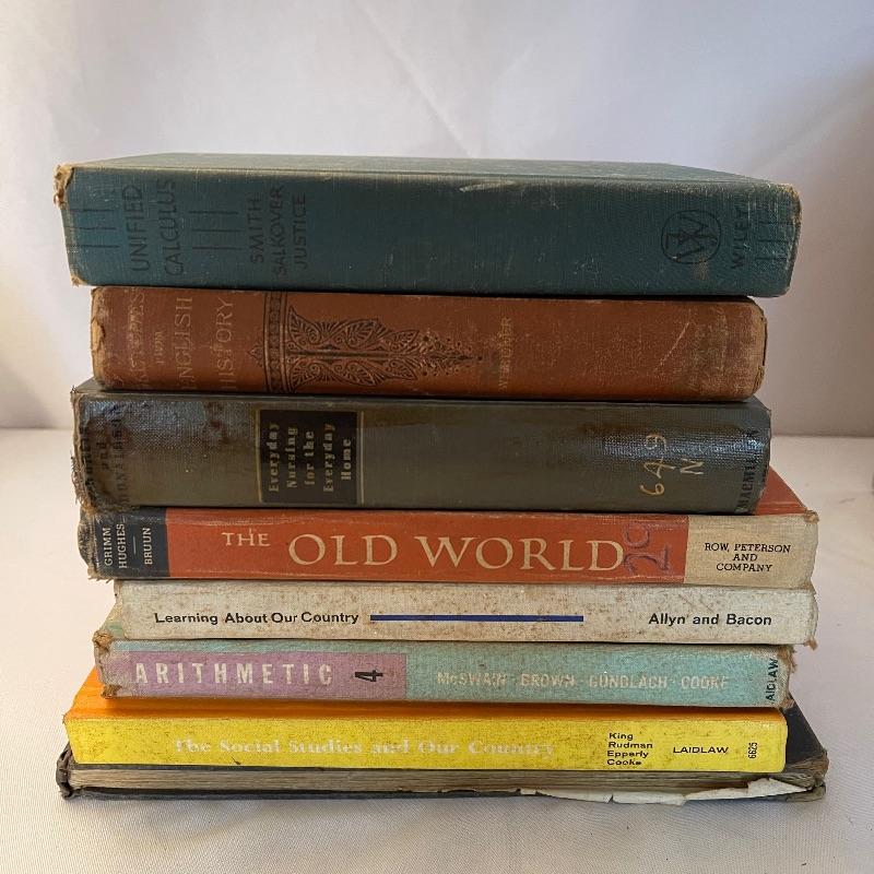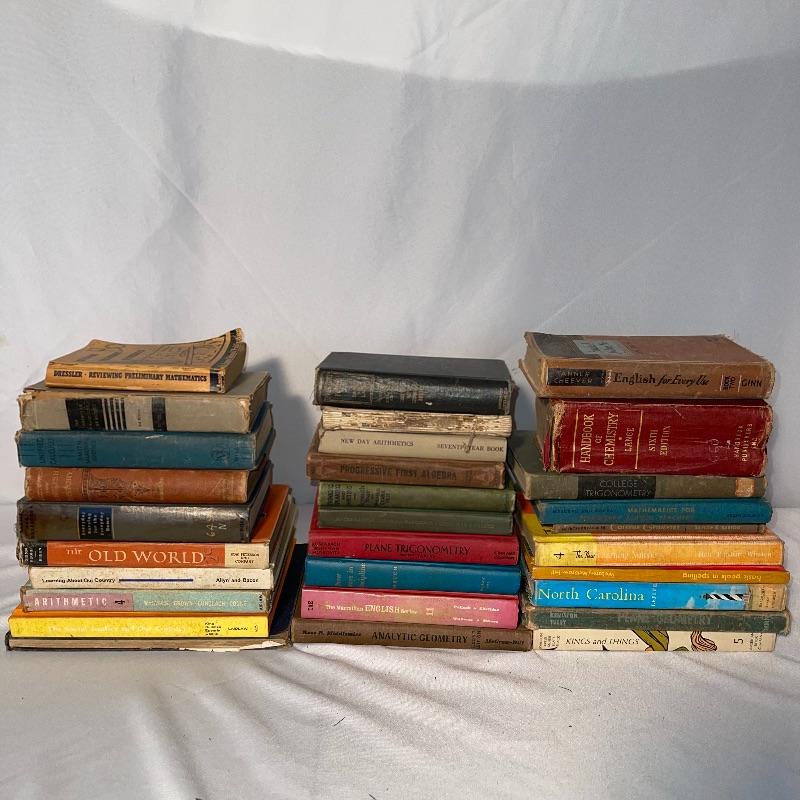These 30 old school textbooks contain many different subjects- maths, sciences, English, history, and more. Individual books shown are examples of some of the subjects and conditions of the books.