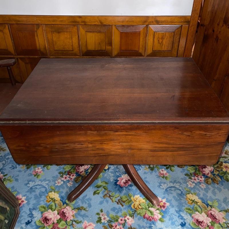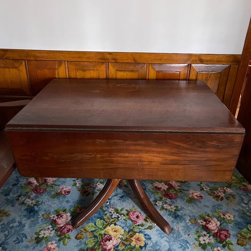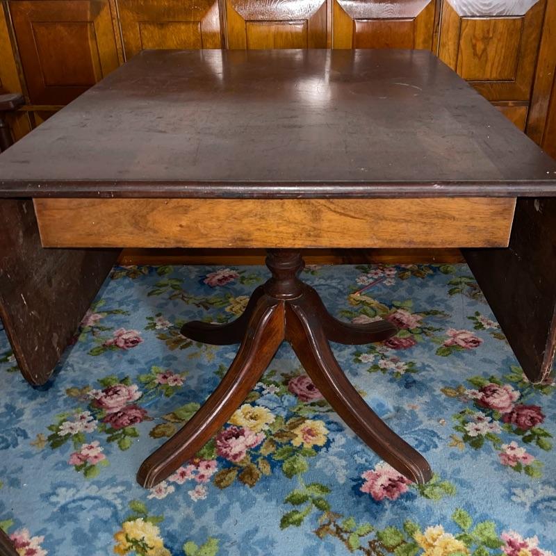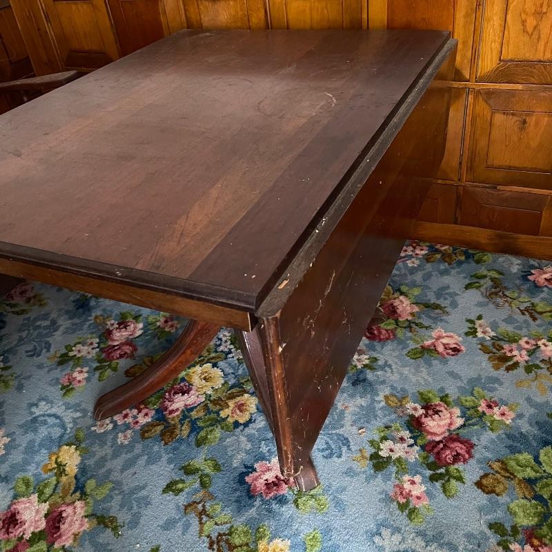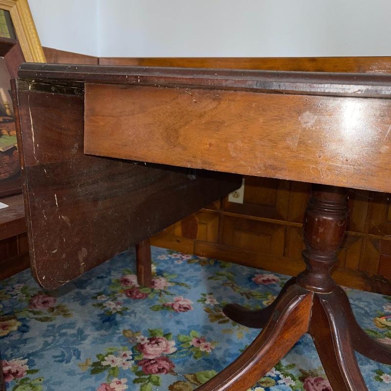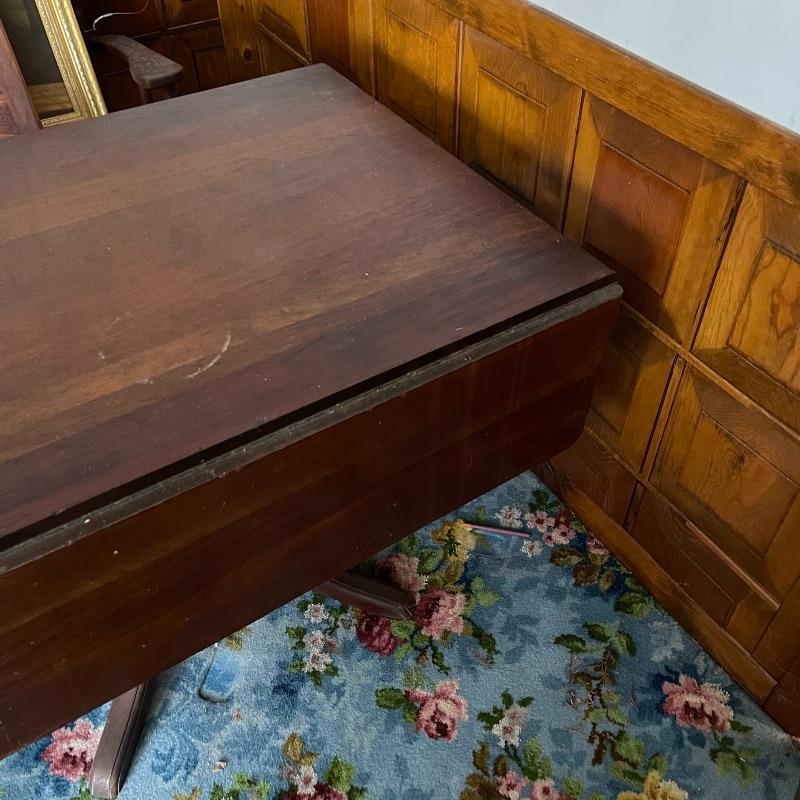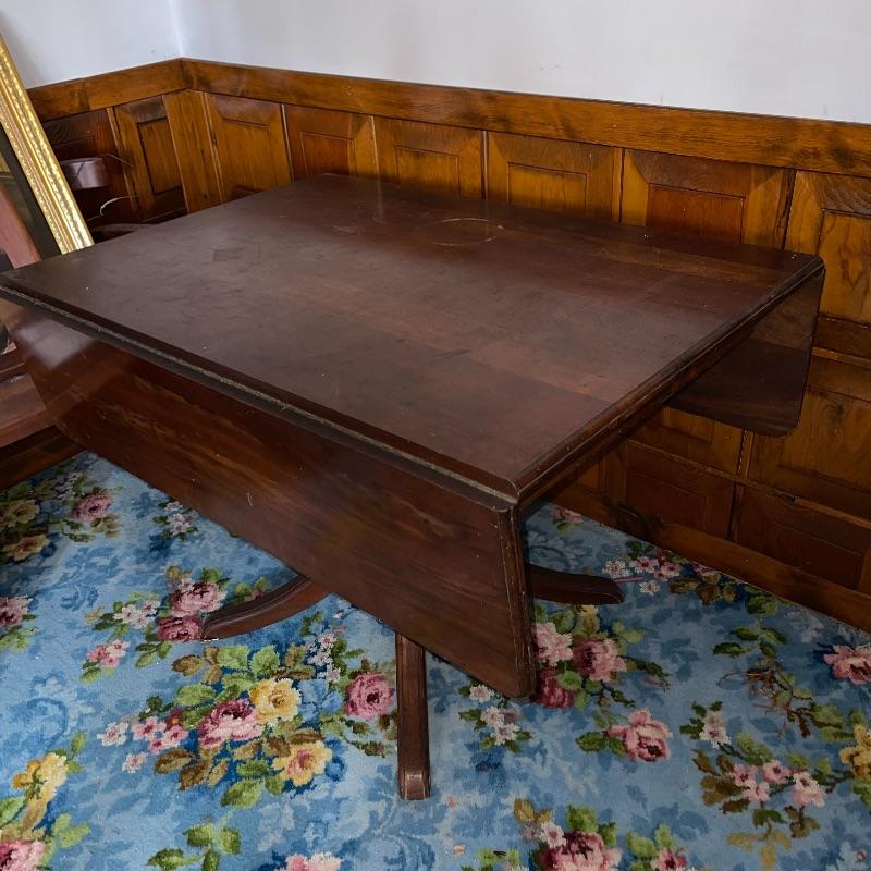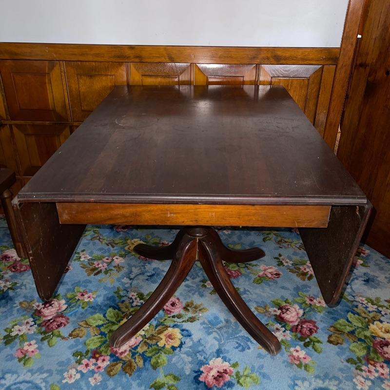 Wooden drop leaf table with a solid base. This table measures 44” L x 30” w x 30” H. With both leafs open, table measures 44”L x 54”W x 30”H. When the leaves are out, the top measures 54” wide. The top is a tad wobbly and only needs a few screws tightened, but the base is sturdy. Legs provide a simple elegance. A dust, polish, and new home will bring this dark wood table back to life.