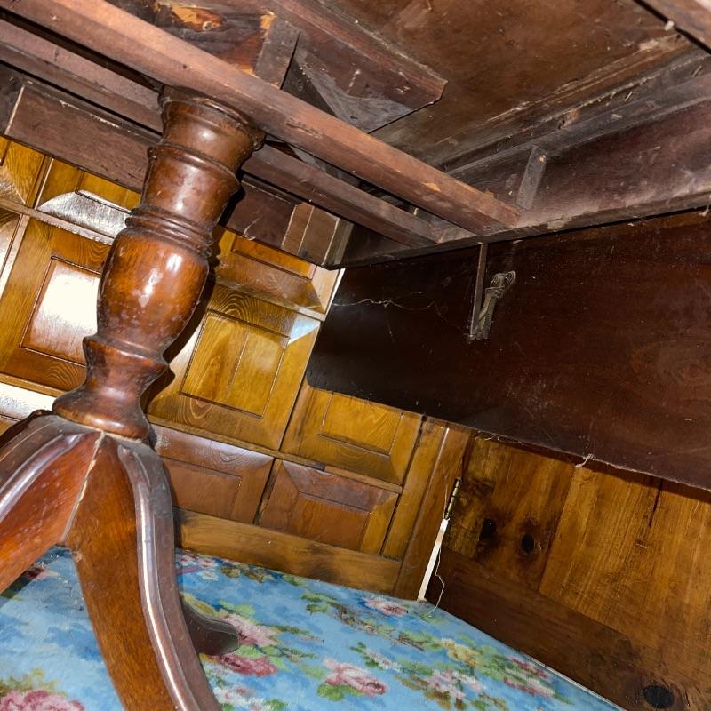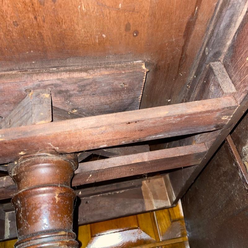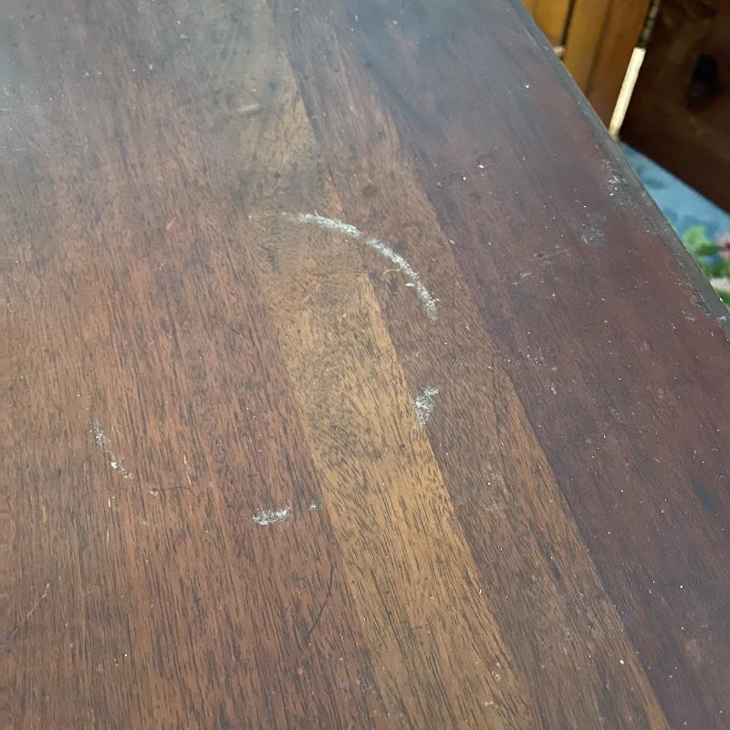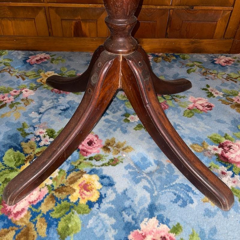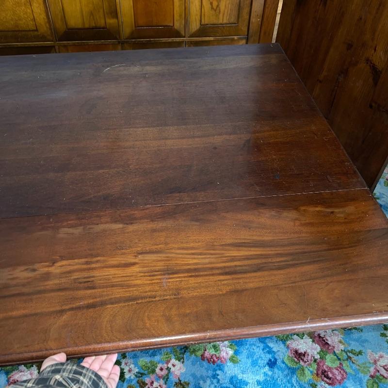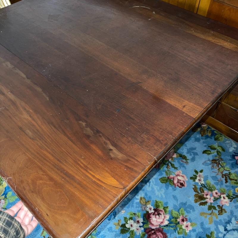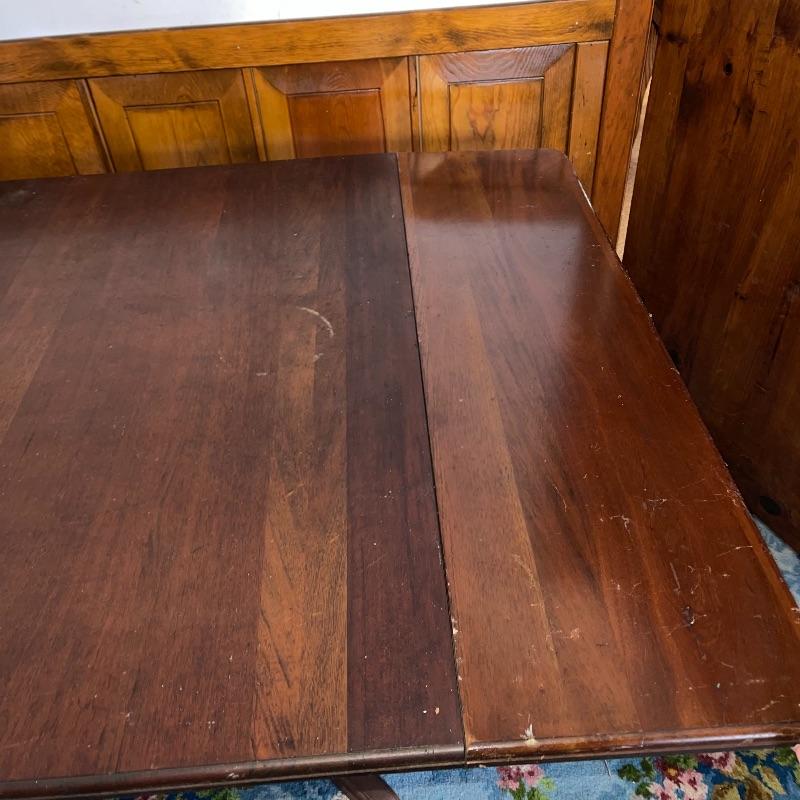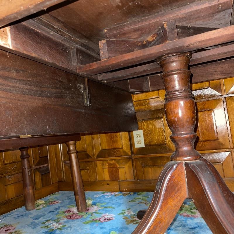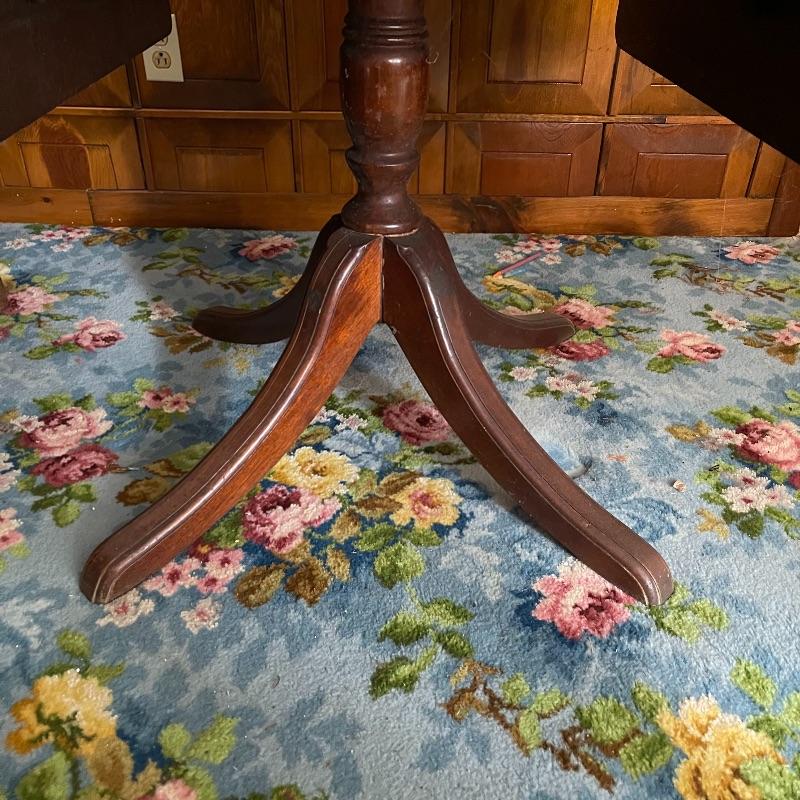 Wooden drop leaf table with a solid base. This table measures 44” L x 30” w x 30” H. With both leafs open, table measures 44”L x 54”W x 30”H. When the leaves are out, the top measures 54” wide. The top is a tad wobbly and only needs a few screws tightened, but the base is sturdy. Legs provide a simple elegance. A dust, polish, and new home will bring this dark wood table back to life.