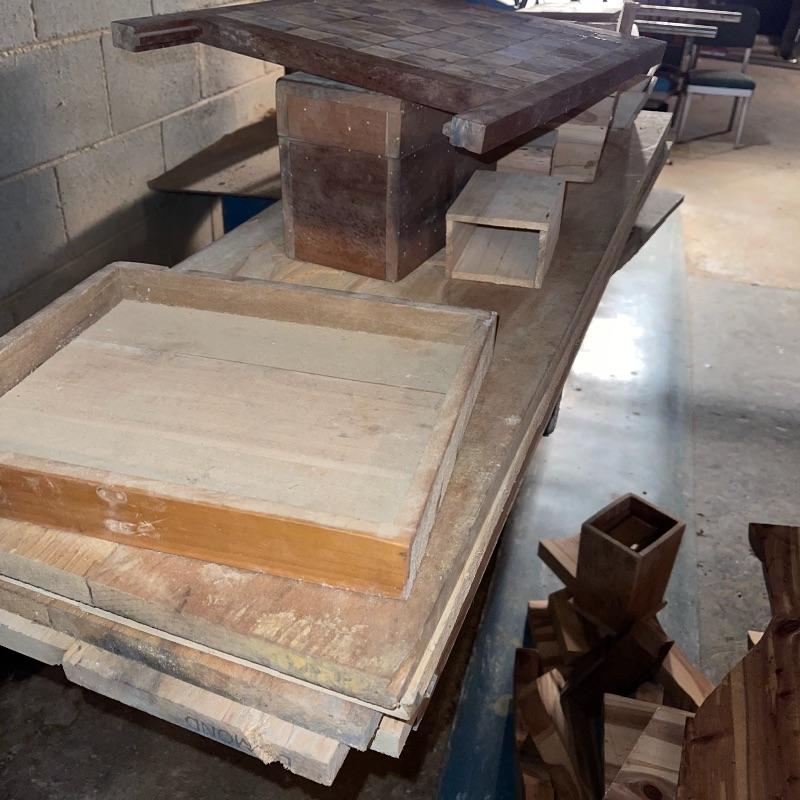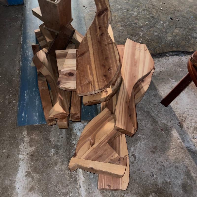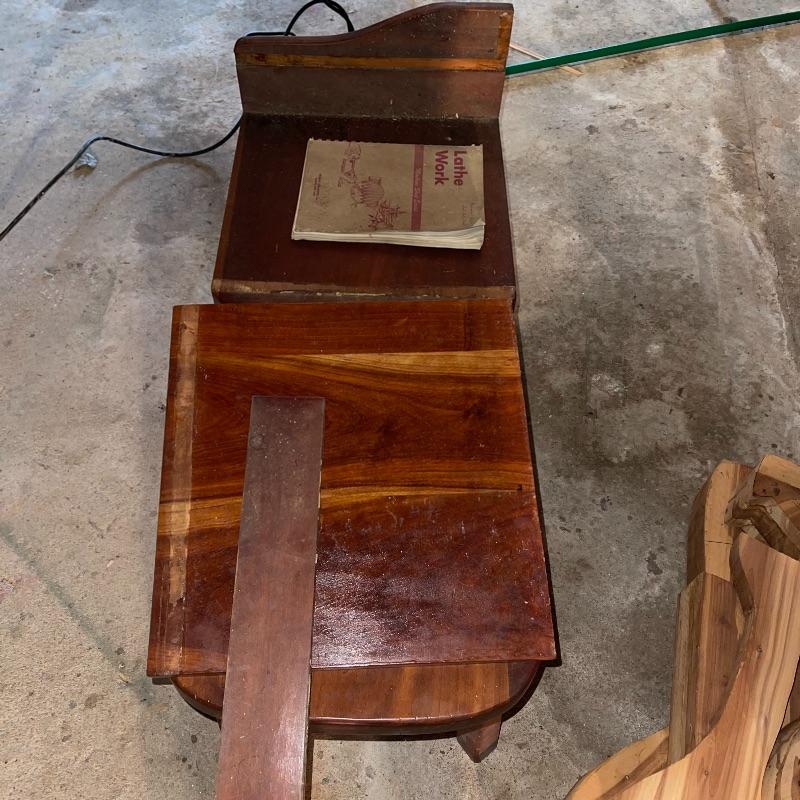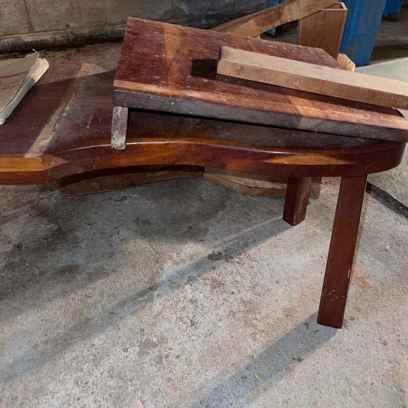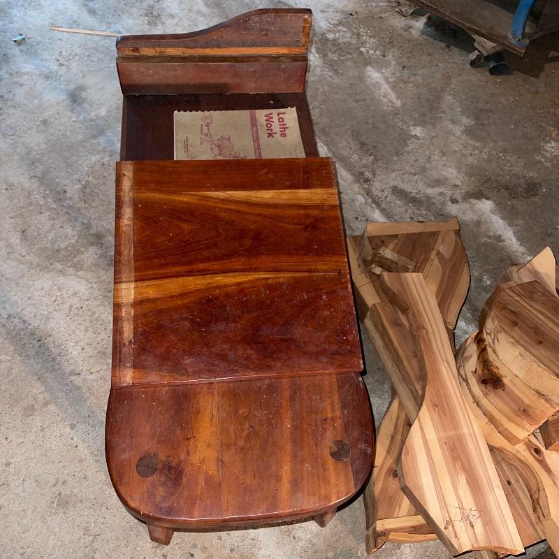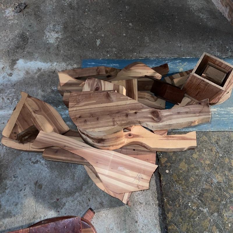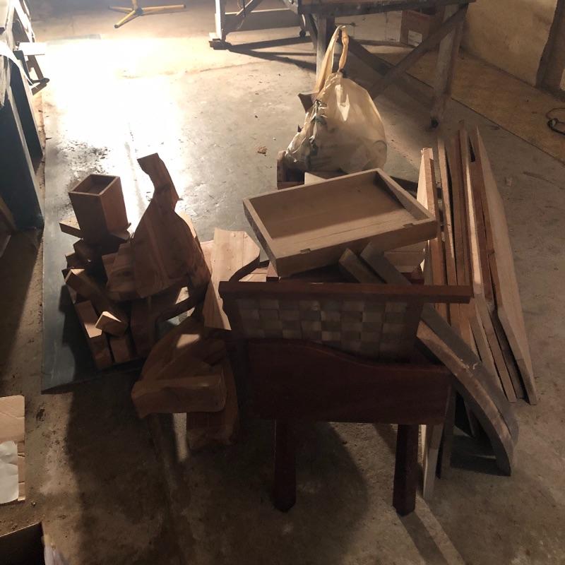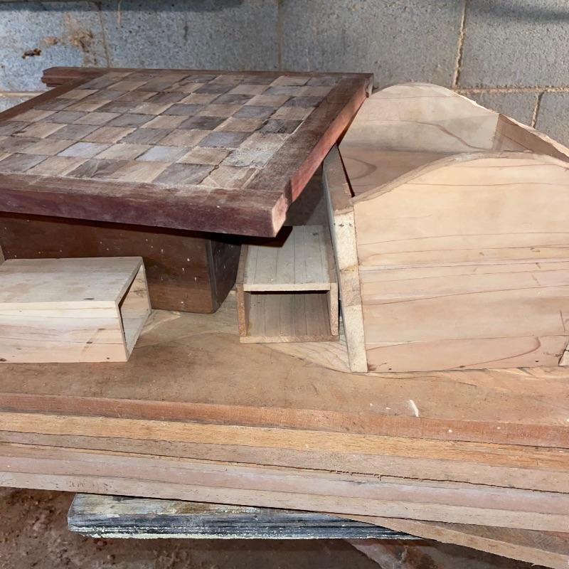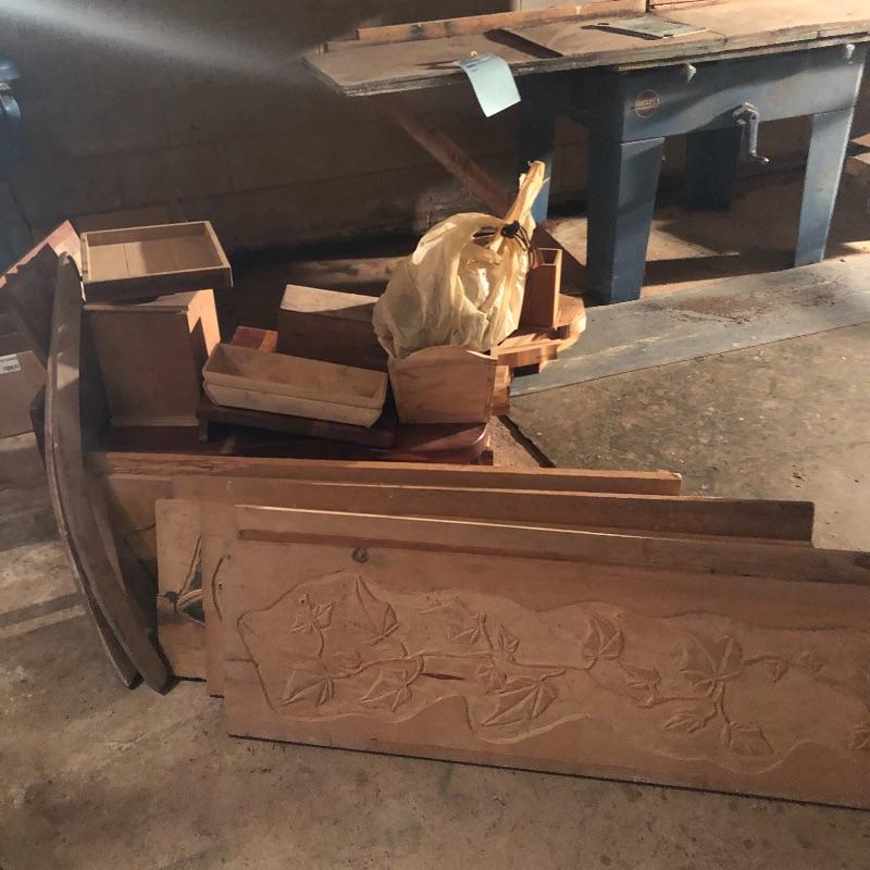 Collection of scrap wood, wooden table/bench, leather, and more. Table/bench measures 36” x 16” x 23”. Some of the wood look as if they are pieces to a standing and rocking horse. Local pickup only.
